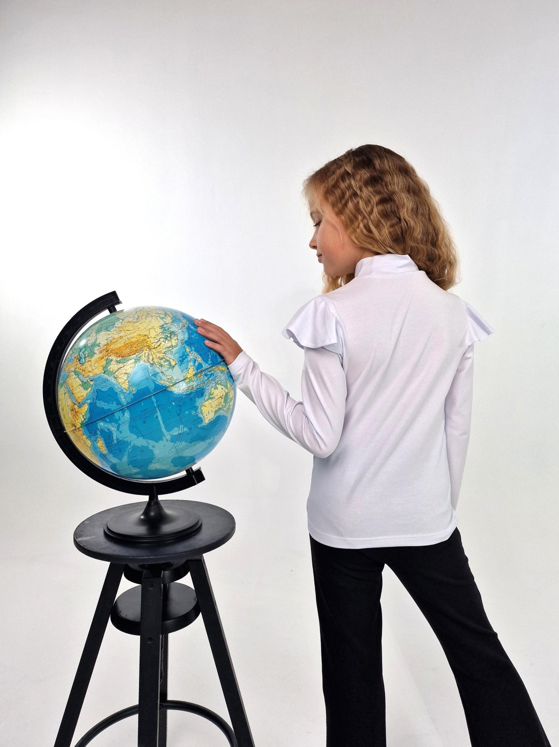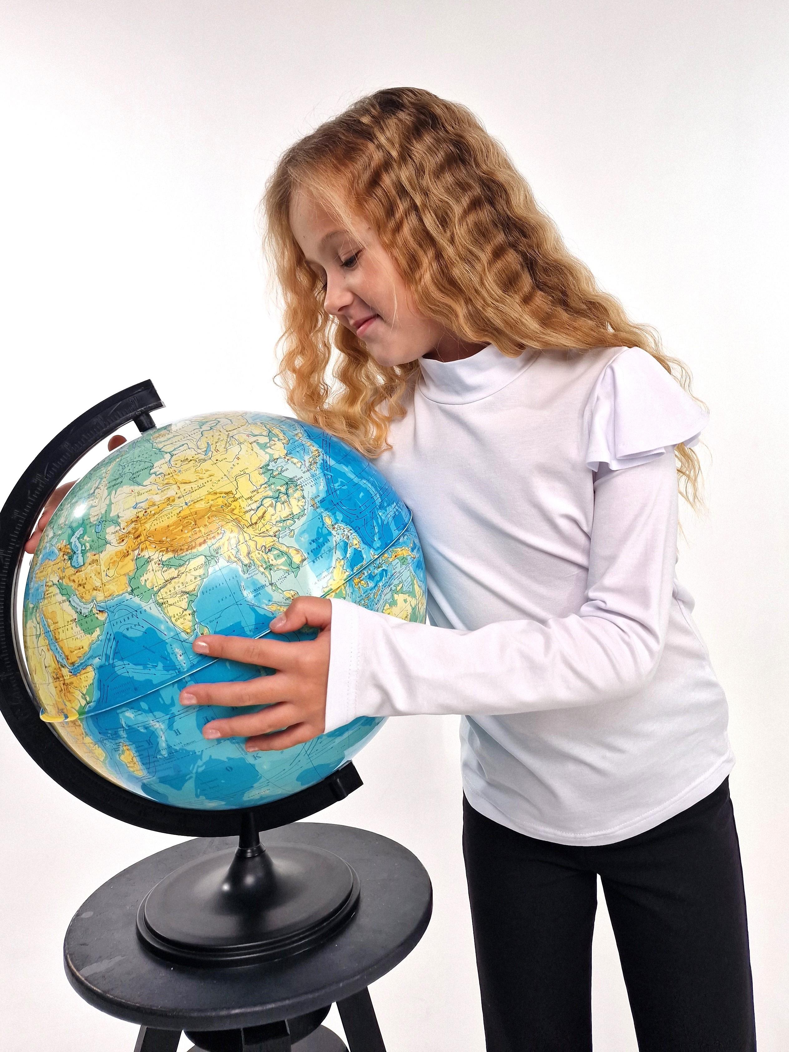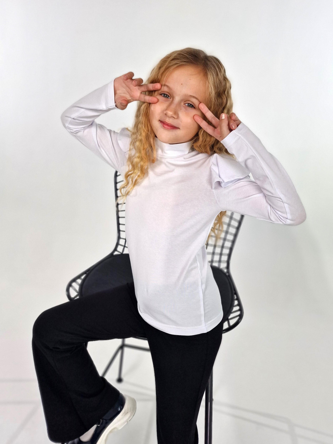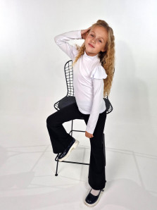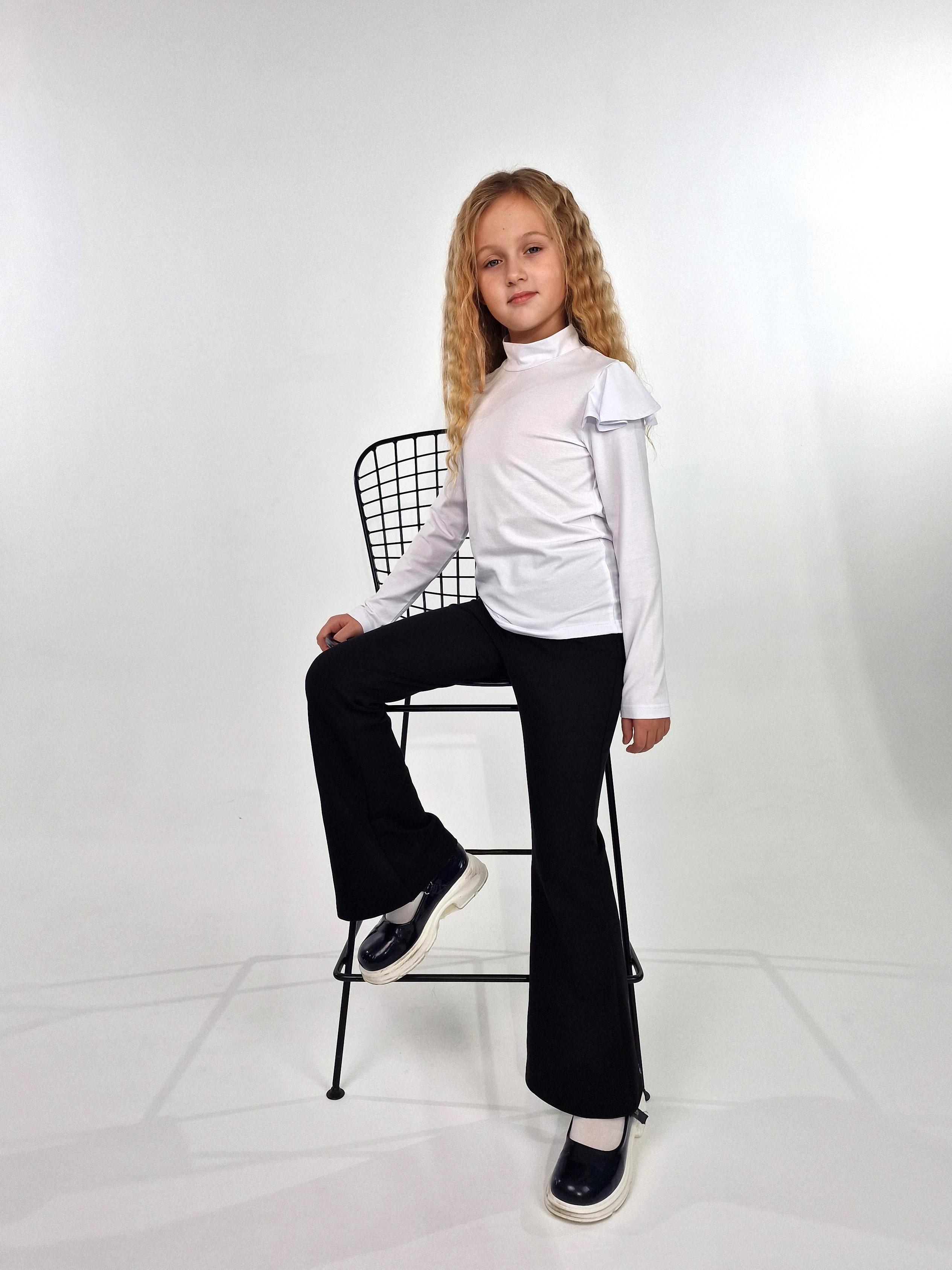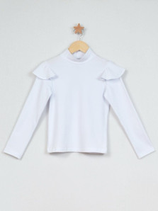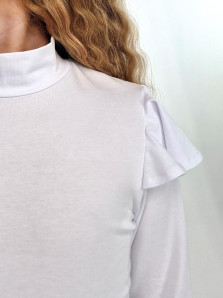 Кулирное полотно:95% х/б.,5% лайкра. Блузка-прямой силуэт,втачной длинный рукав с рюшей по пройме.Горловина со стойкой.