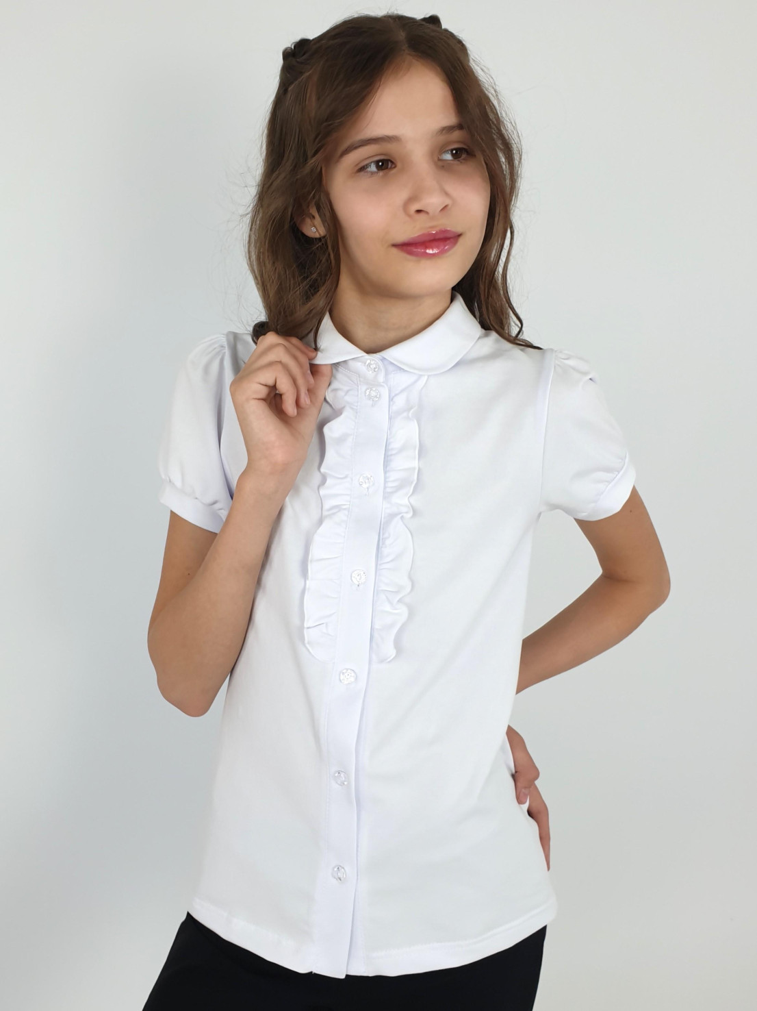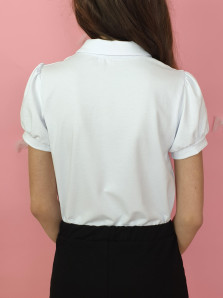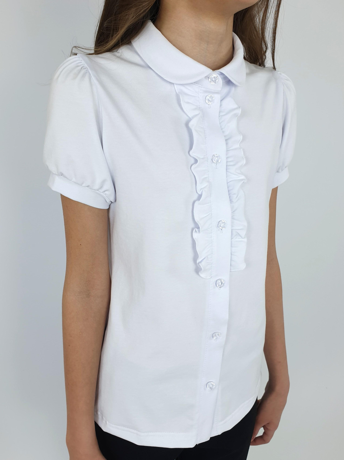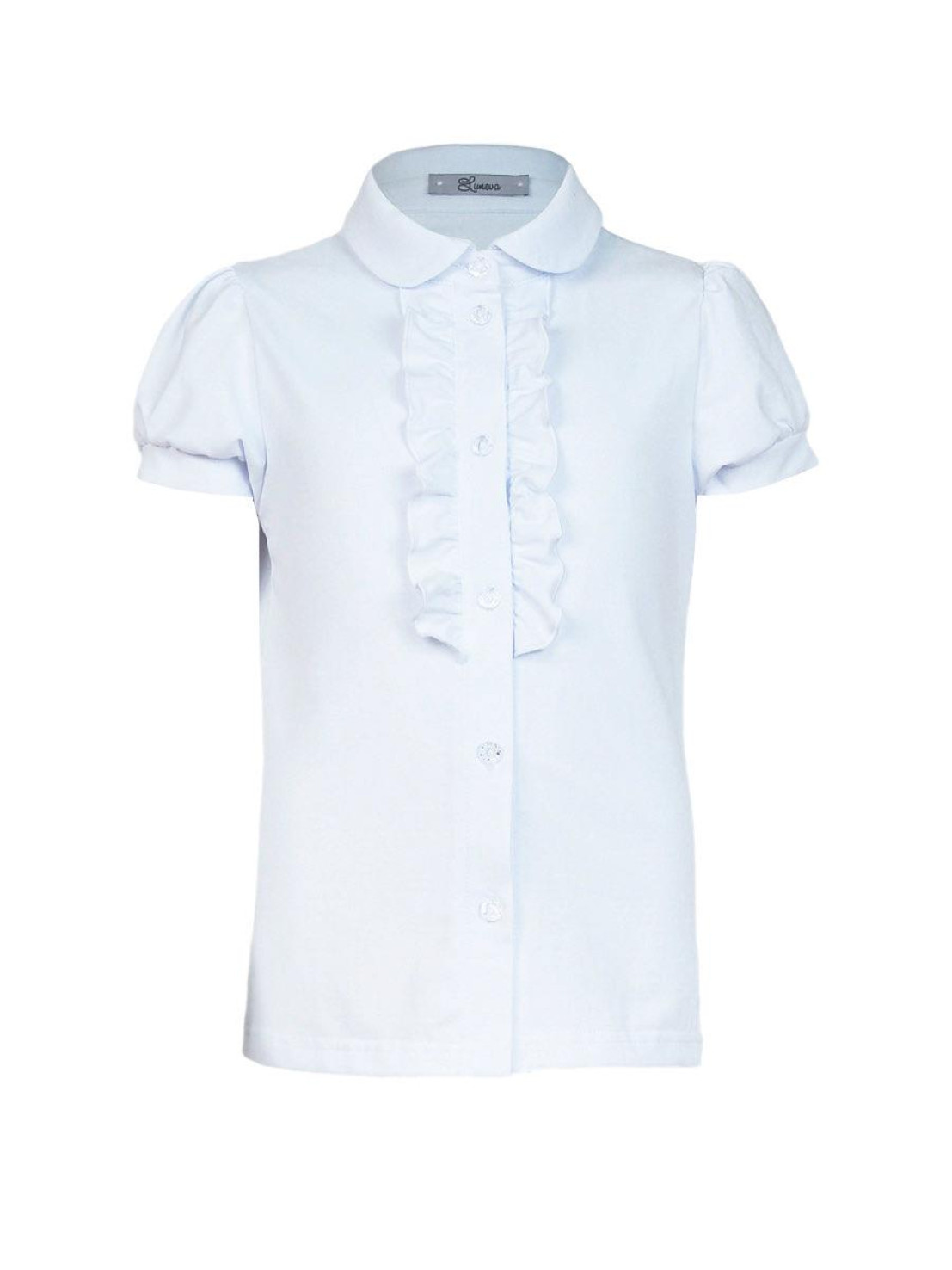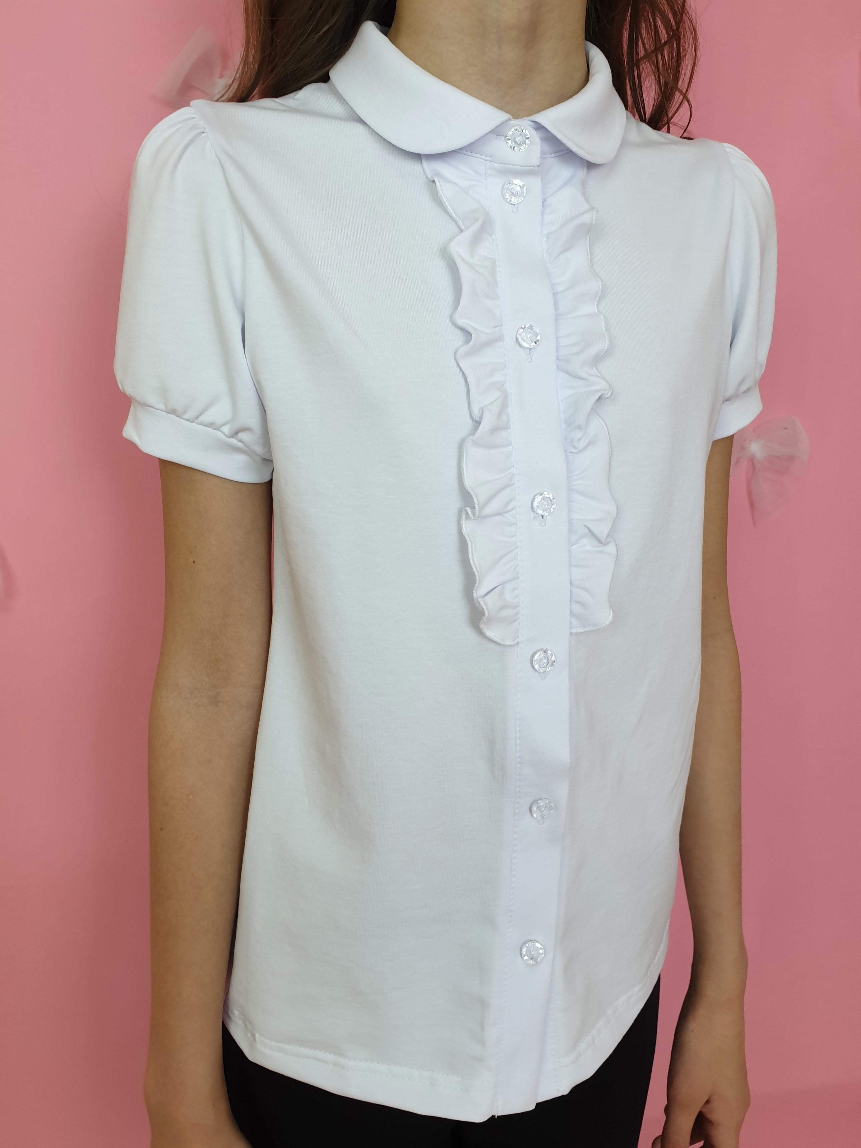 Кулирное полотно:95% х/б.,5% лайкра. Блузка-прямой силуэт,короткий рукав "фонарик",внизу на манжете.В горловине отложной воротник на стойке.Перед с планкой и рюшей,застежка центральная на пуговицы.