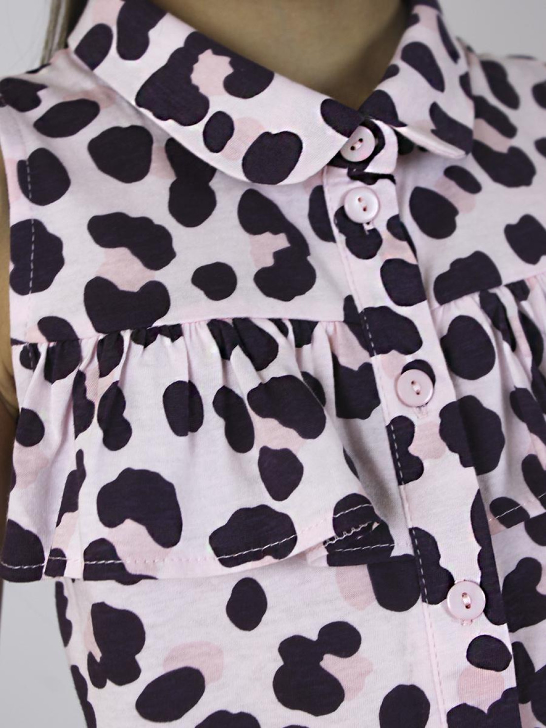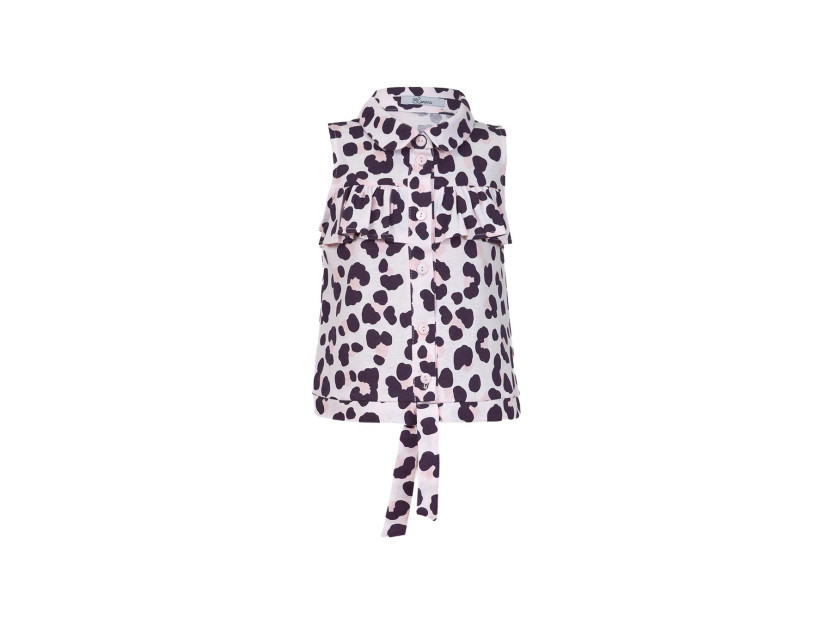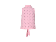 Блузка-прямая с центральной застежкой на пуговицы,отложной воротник на стойке.Без рукава,пройма окантована и подшита.Низ с притачным поясом,завязывающимся на узел.Отрезная кокетка по переду с рюшей.