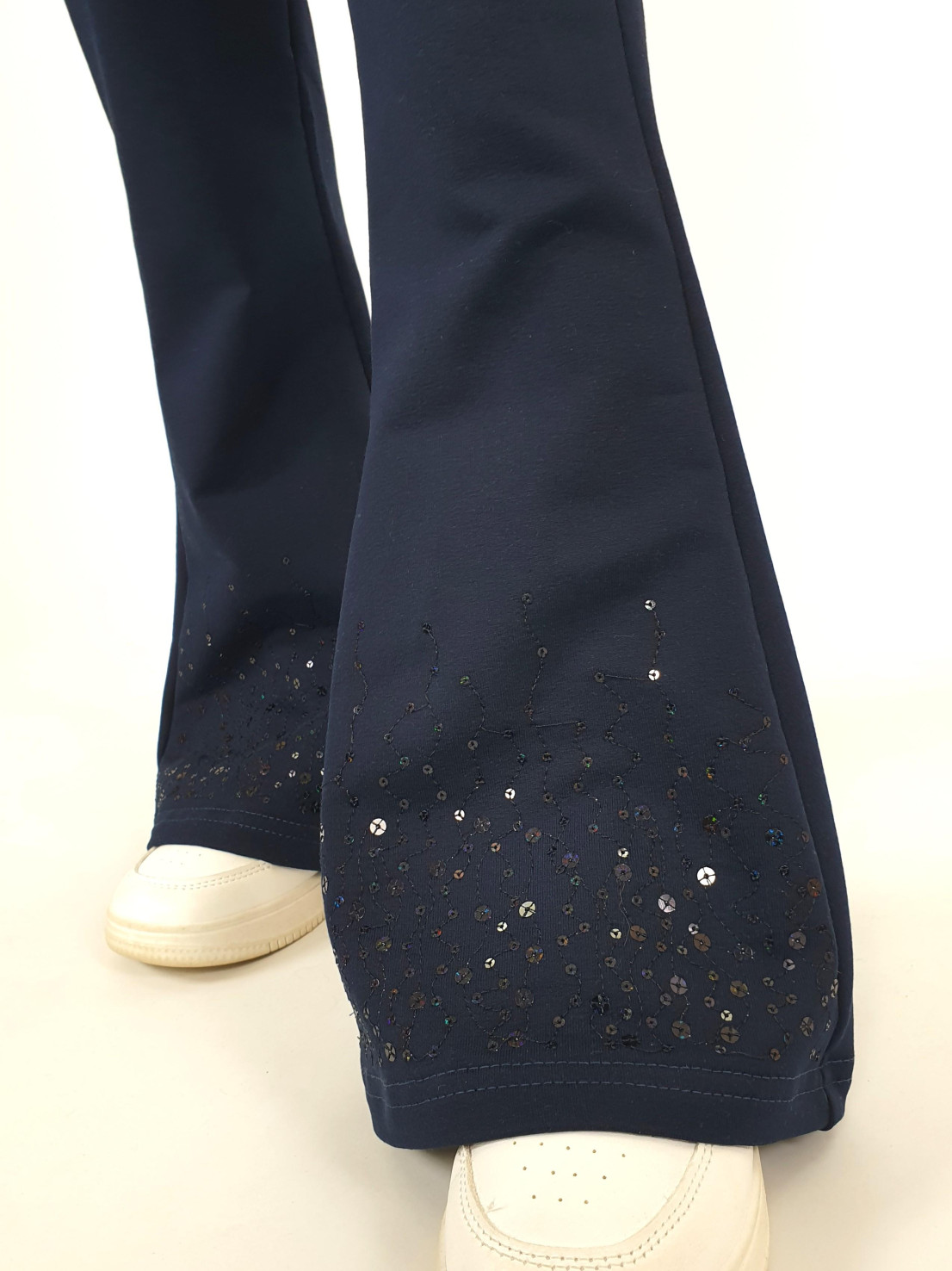 Футер 2-х нитка:95% х/б,5% лайкра. Брюки -длинные,клеш.Пояс притачной с резинкой,низ подшит.Вышивка пайетки на переде внизу.