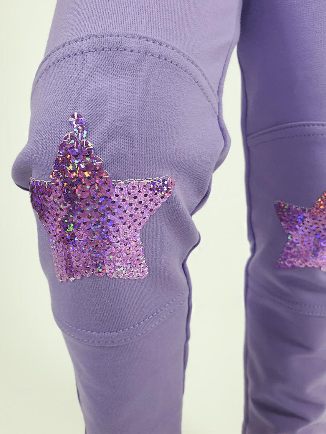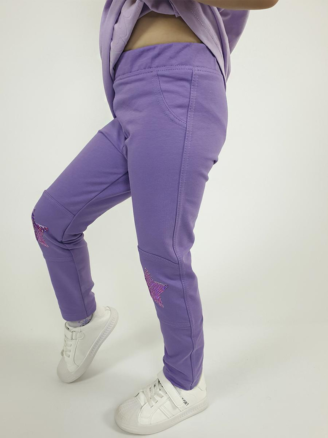 Футер 2-х нитка:75% х/б,25% п/э. Брюки -длинные,на поясе с резинкой (рибана) с имитацией карманов. Подрезы в области колена с вышивкой-пайетки,низ подшит.