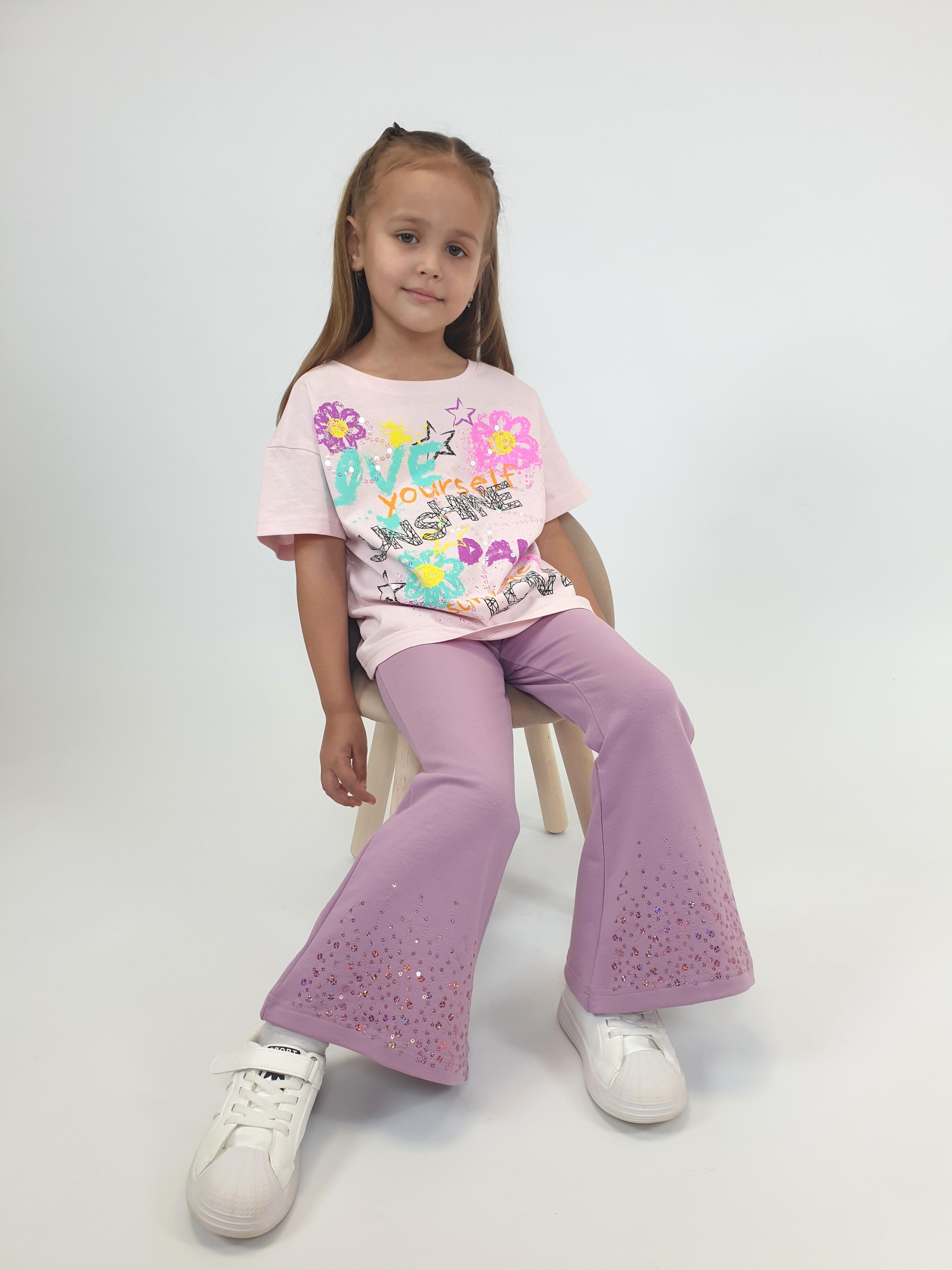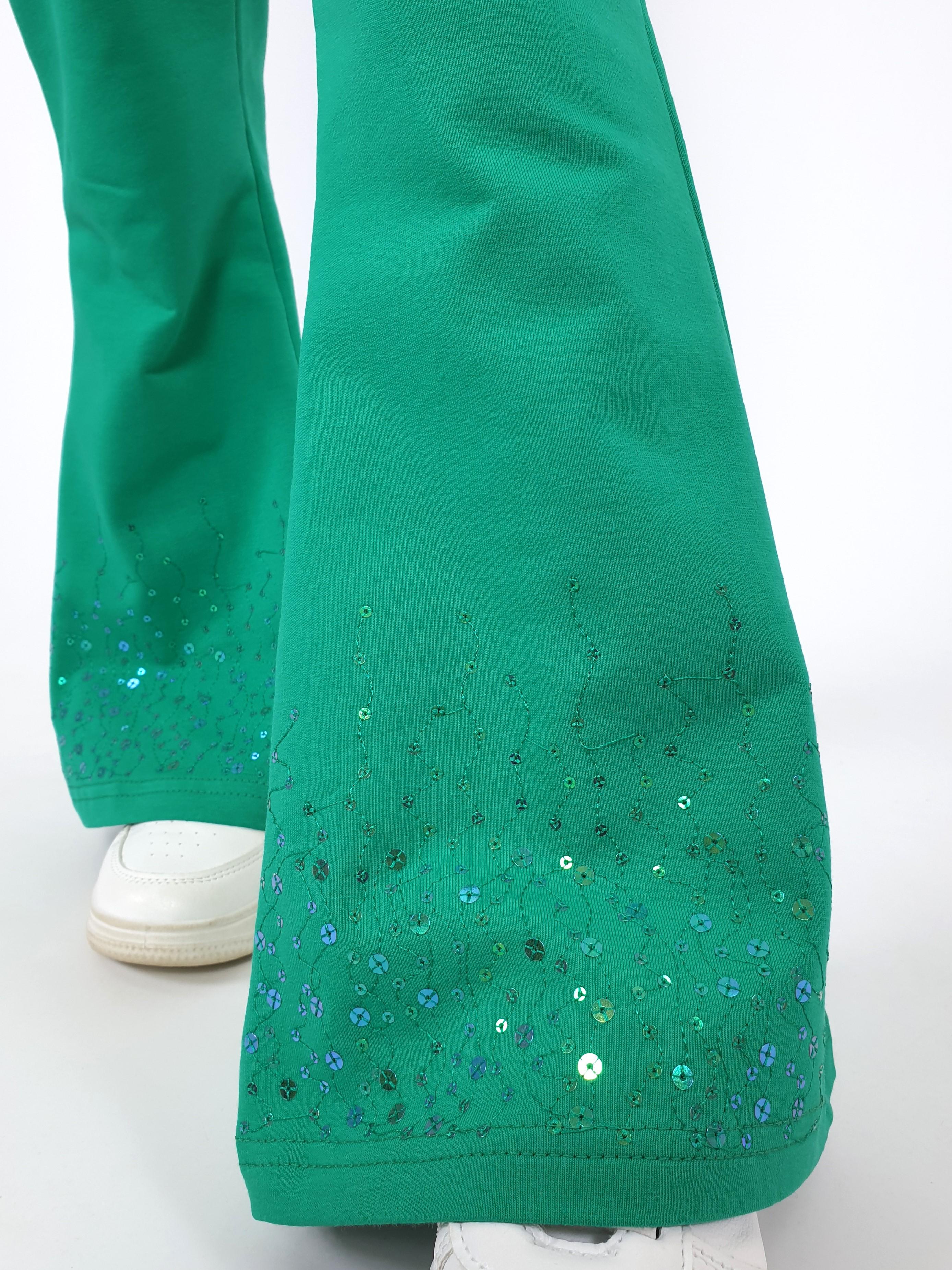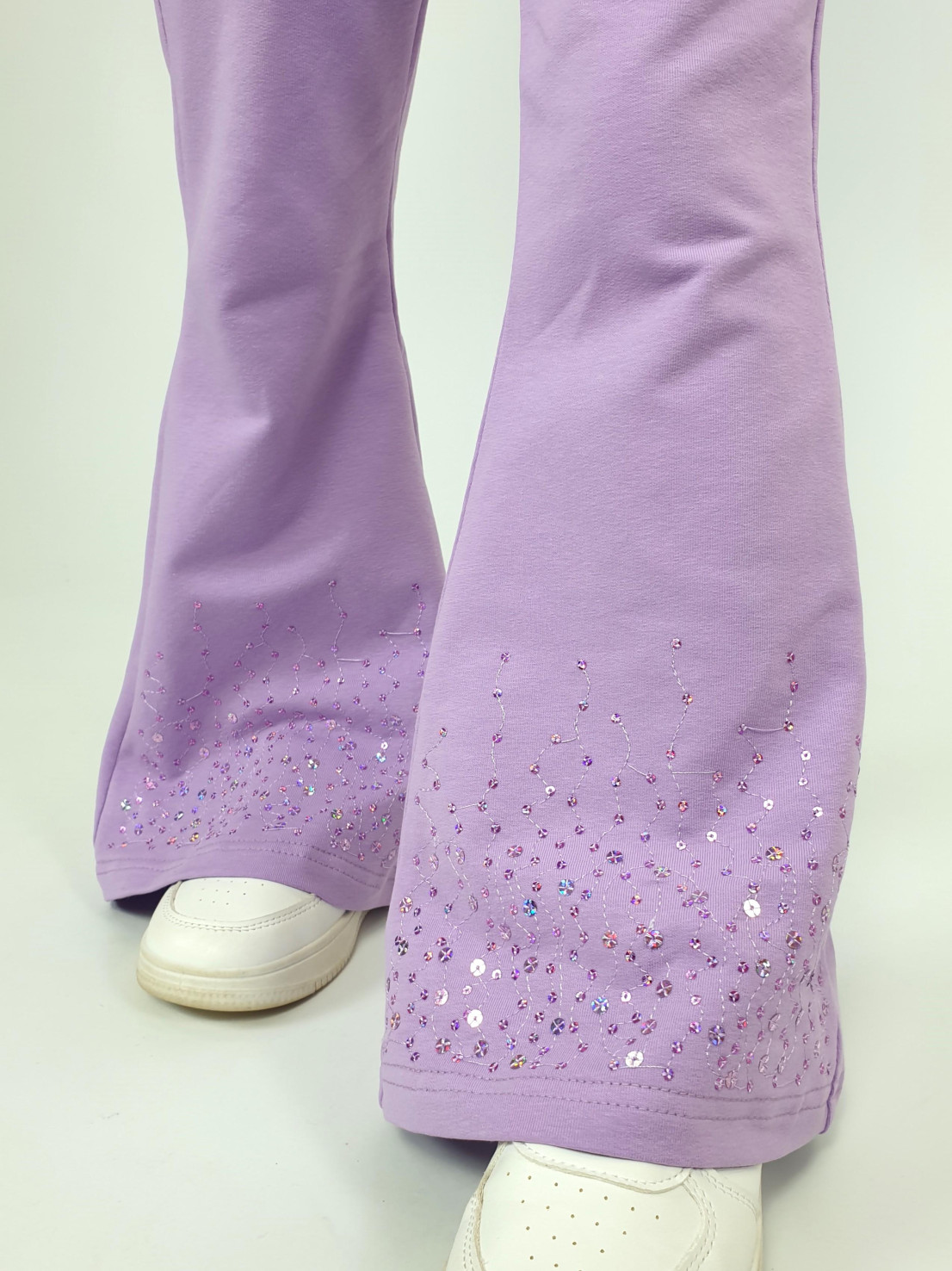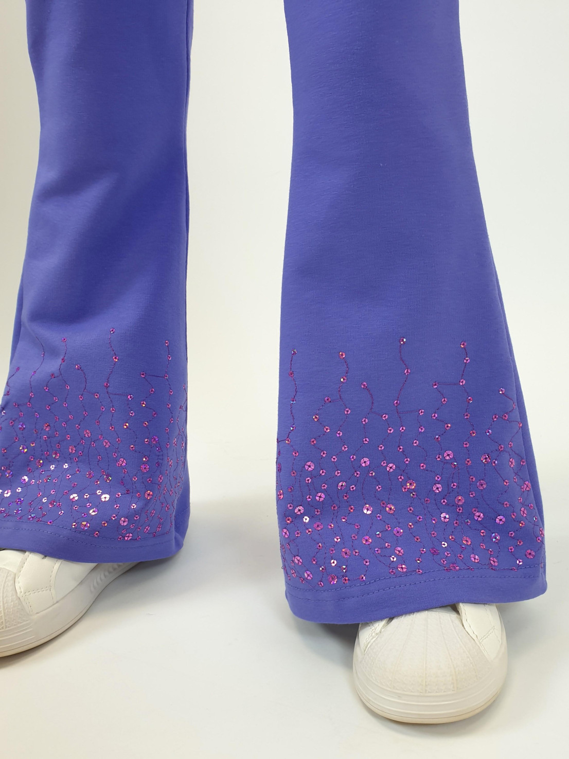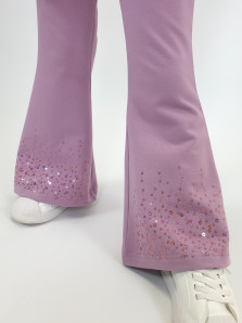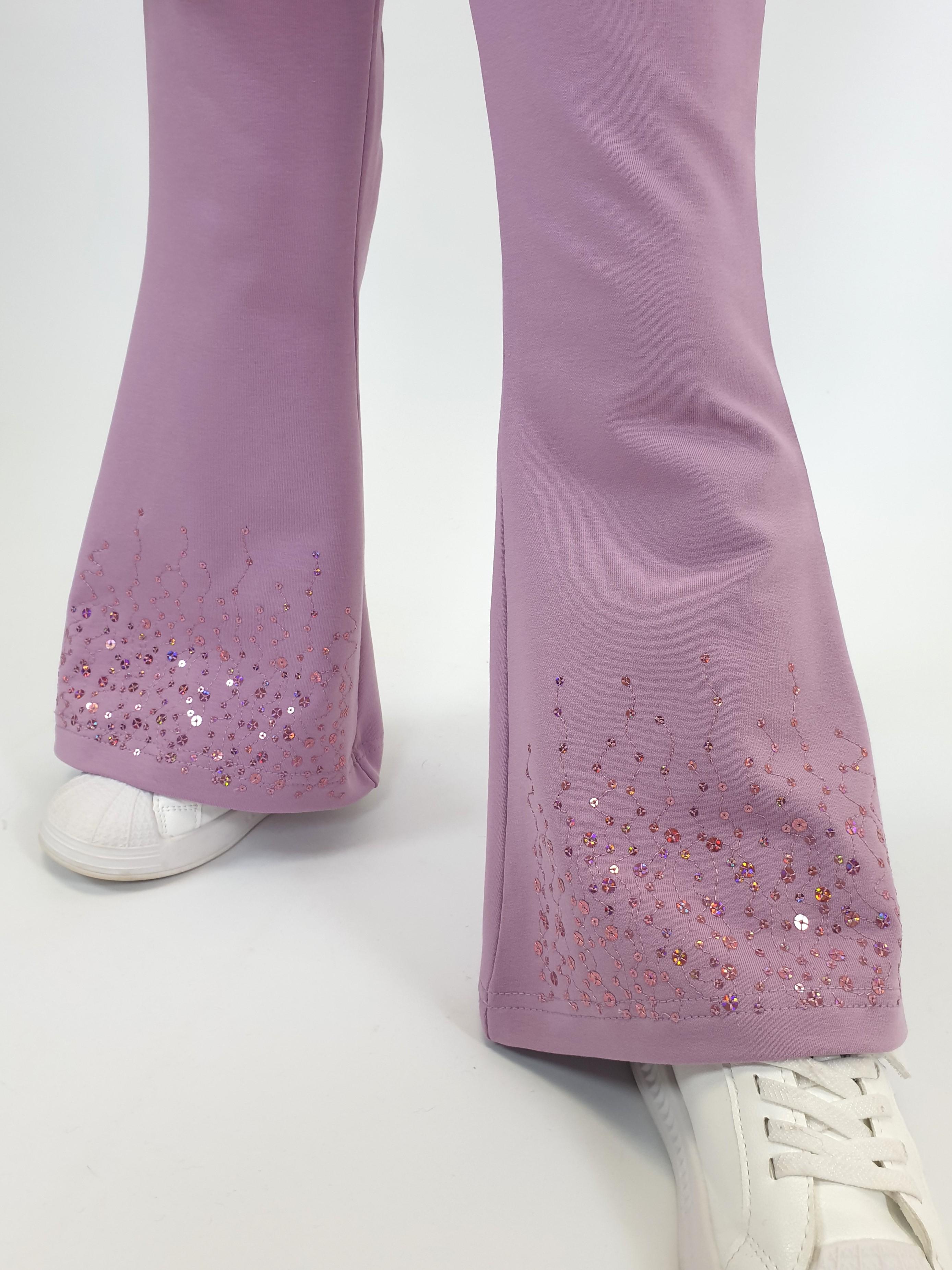 Футер 2-х нитка:95% х/б,5% лайкра. Брюки -длинные,клеш.Пояс притачной с резинкой,низ подшит.Вышивка пайетки на переде внизу.