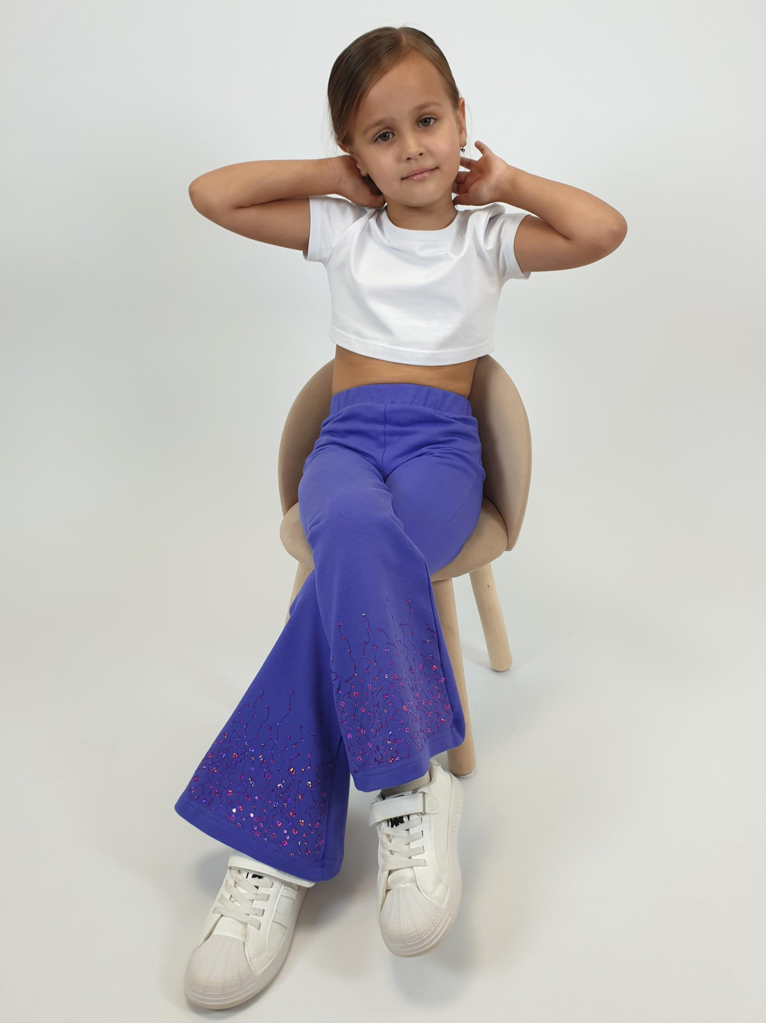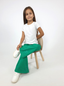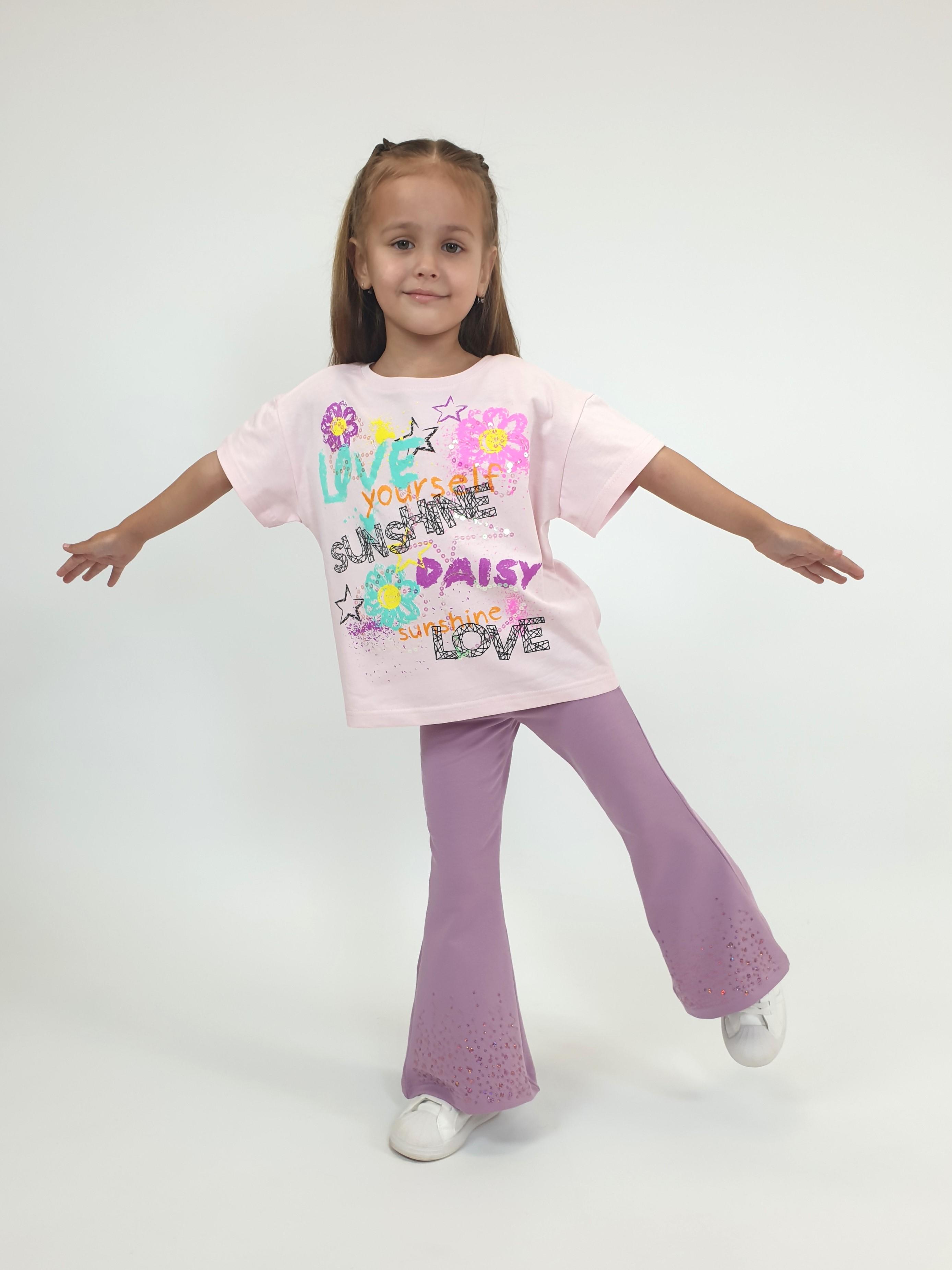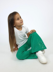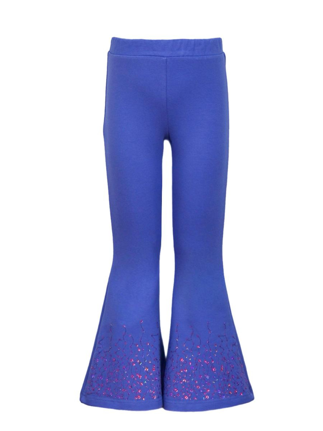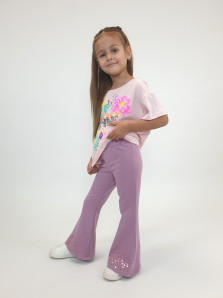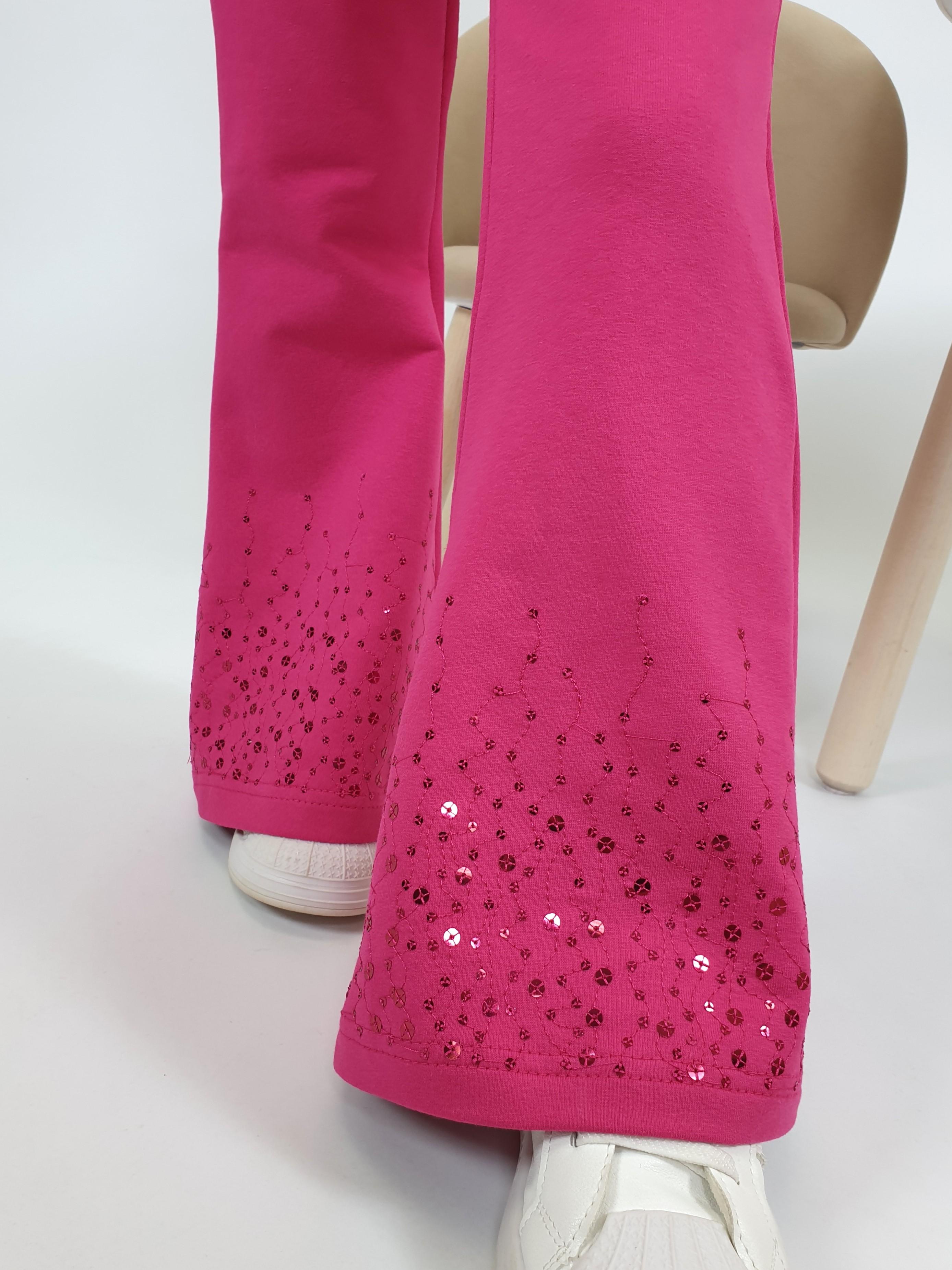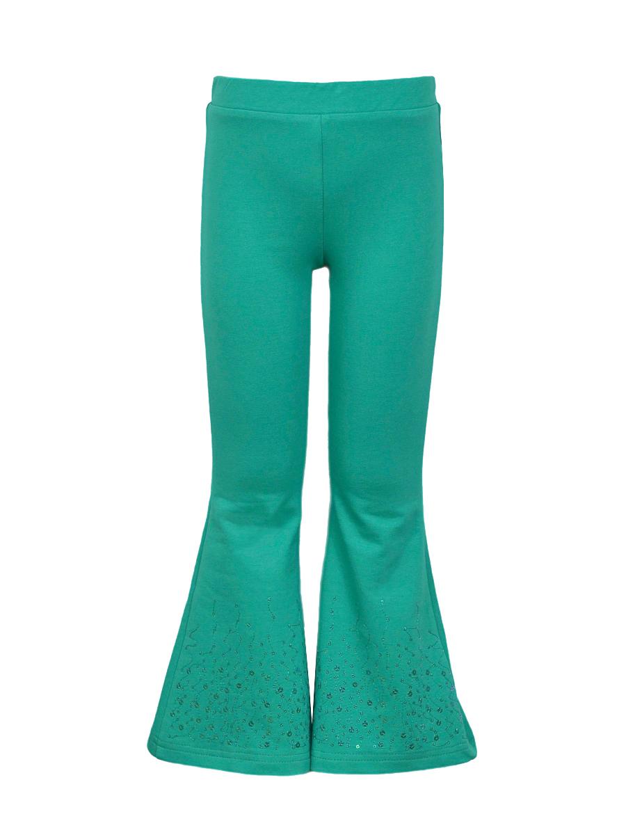 Футер 2-х нитка:95% х/б,5% лайкра. Брюки -длинные,клеш.Пояс притачной с резинкой,низ подшит.Вышивка пайетки на переде внизу.