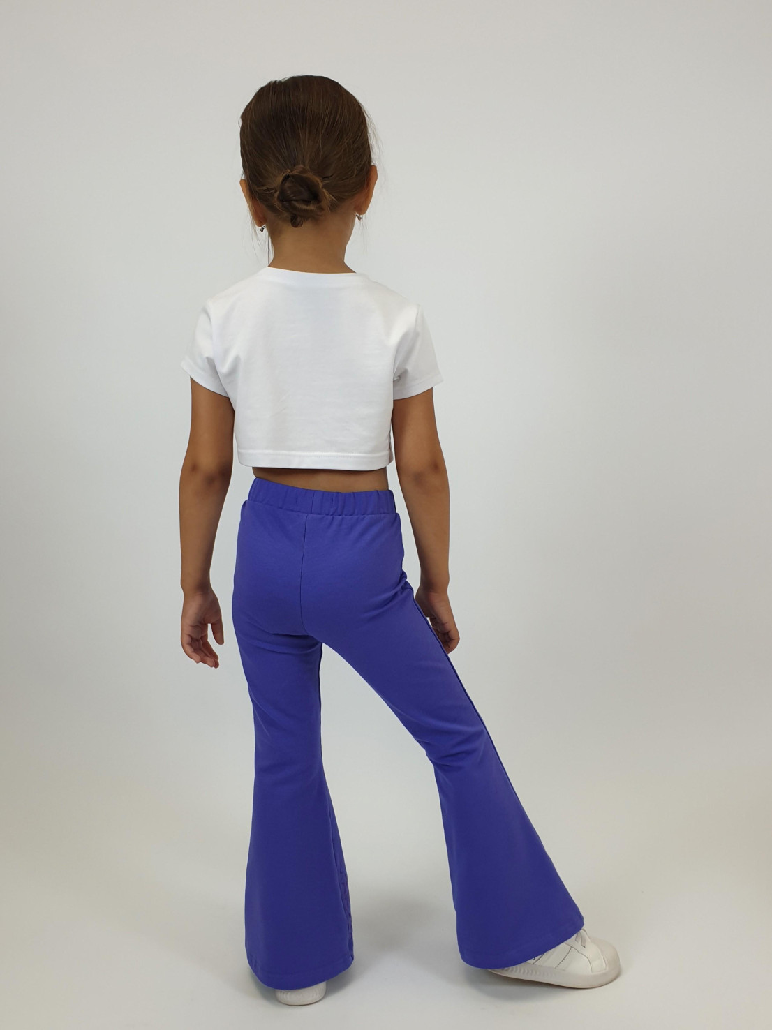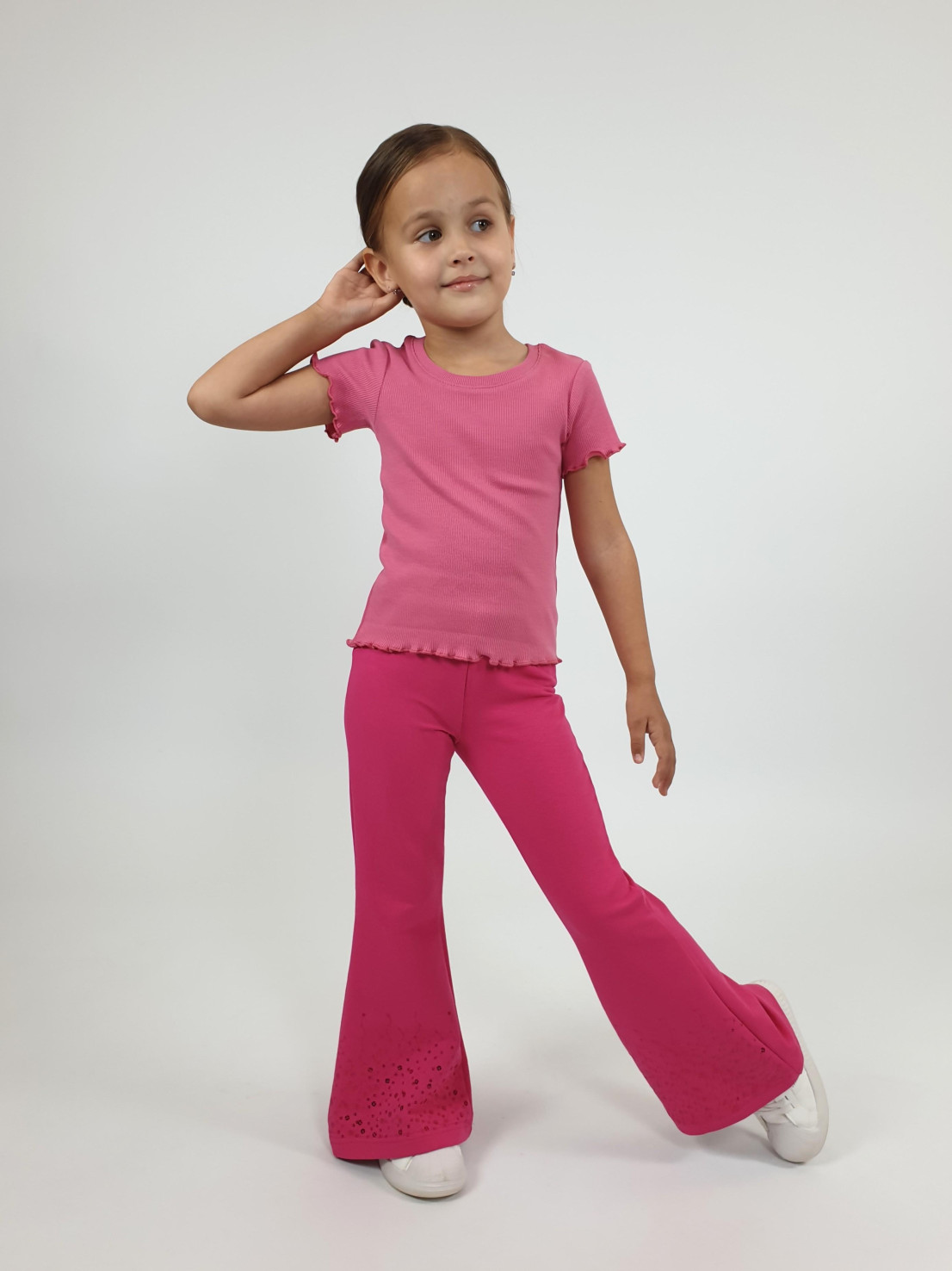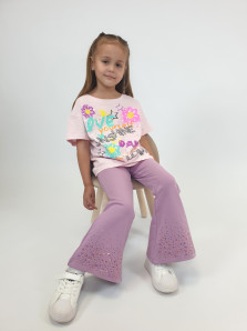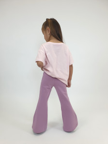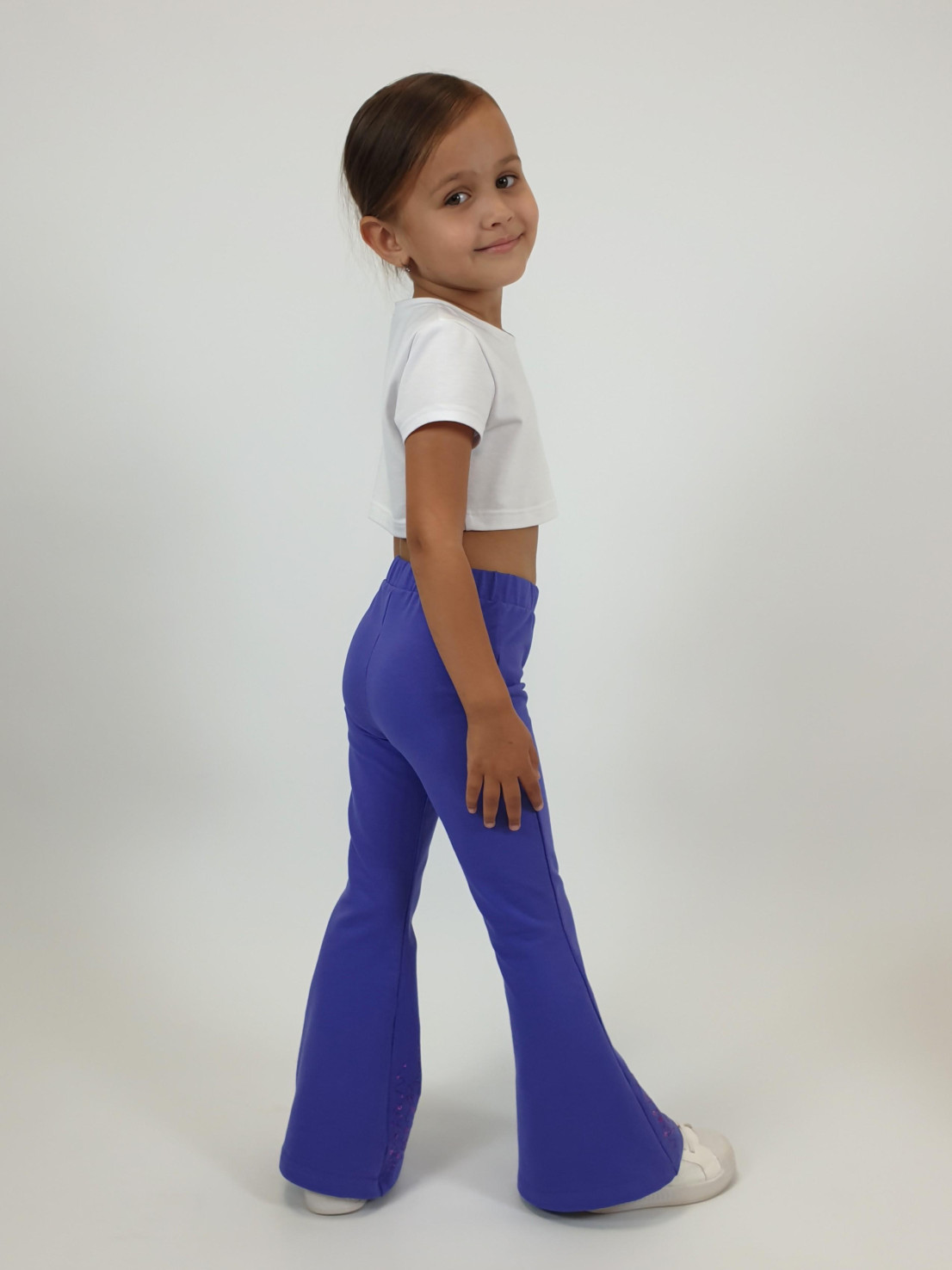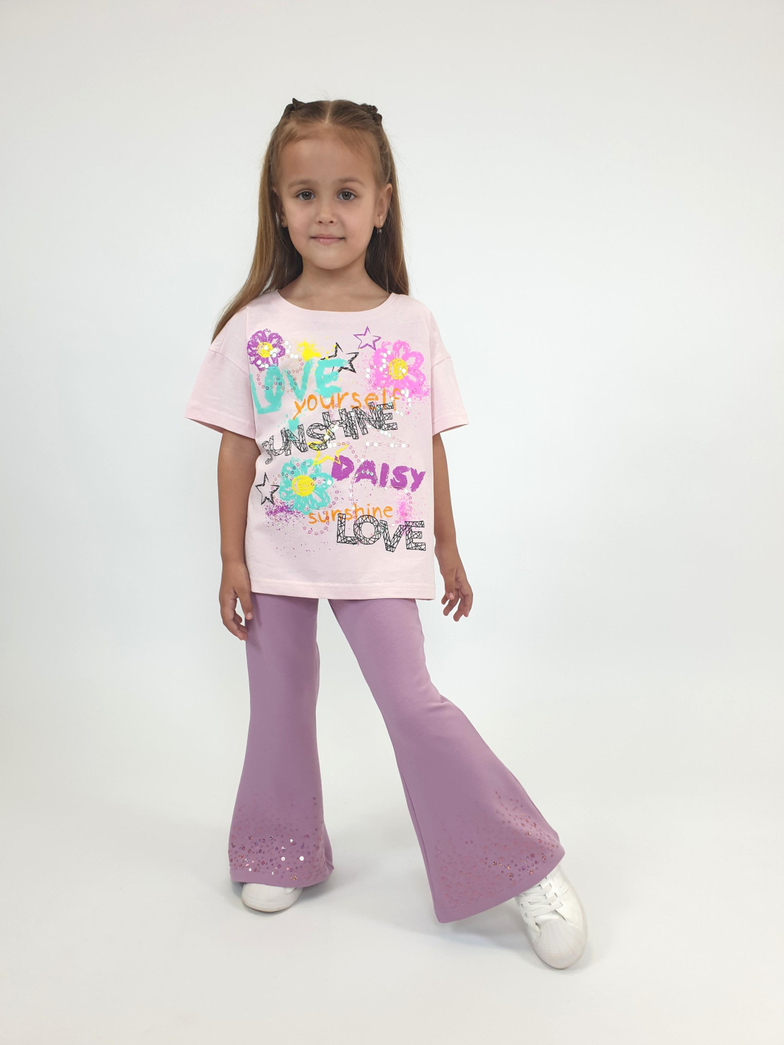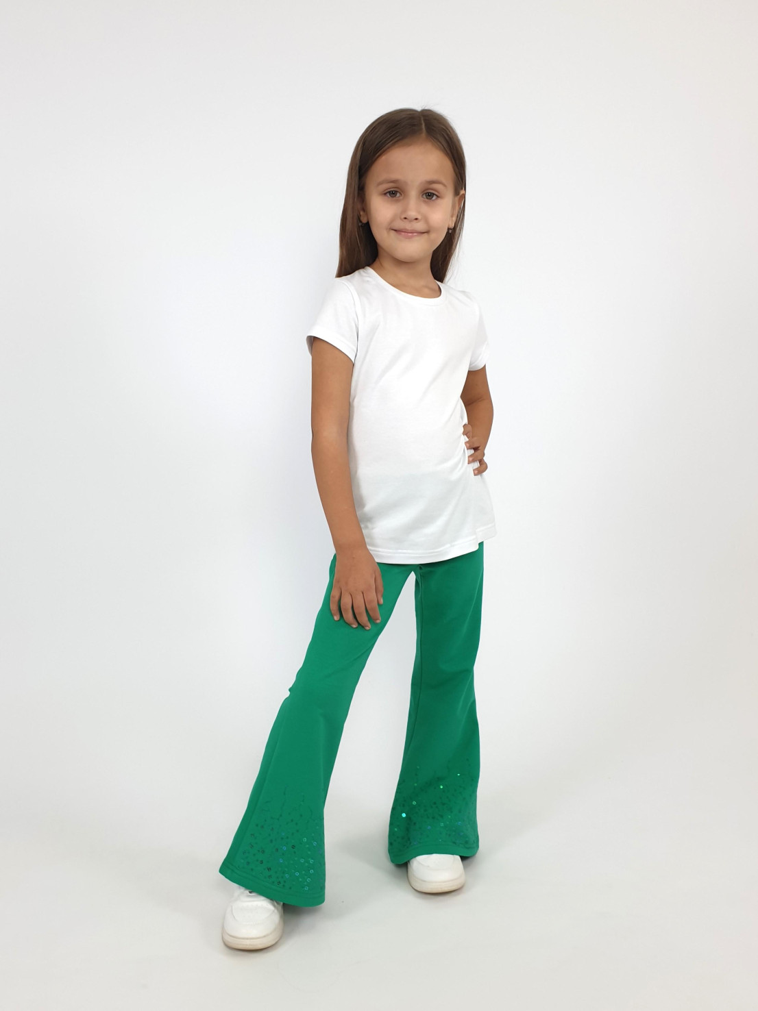 Футер 2-х нитка:95% х/б,5% лайкра. Брюки -длинные,клеш.Пояс притачной с резинкой,низ подшит.Вышивка пайетки на переде внизу.