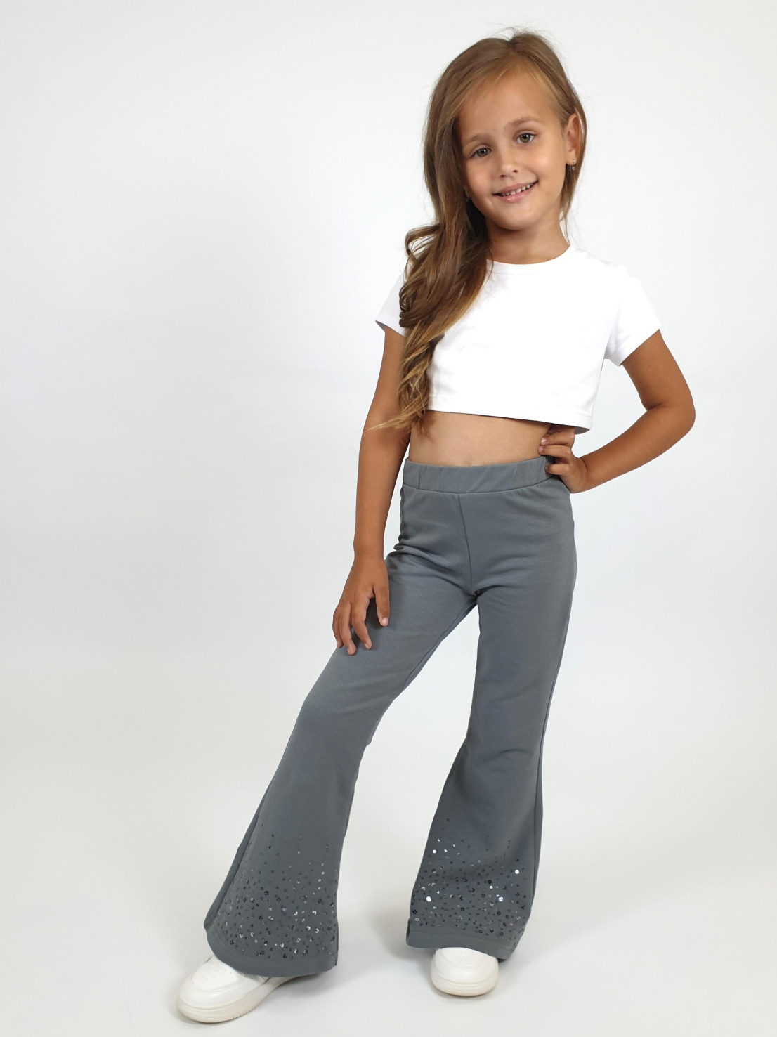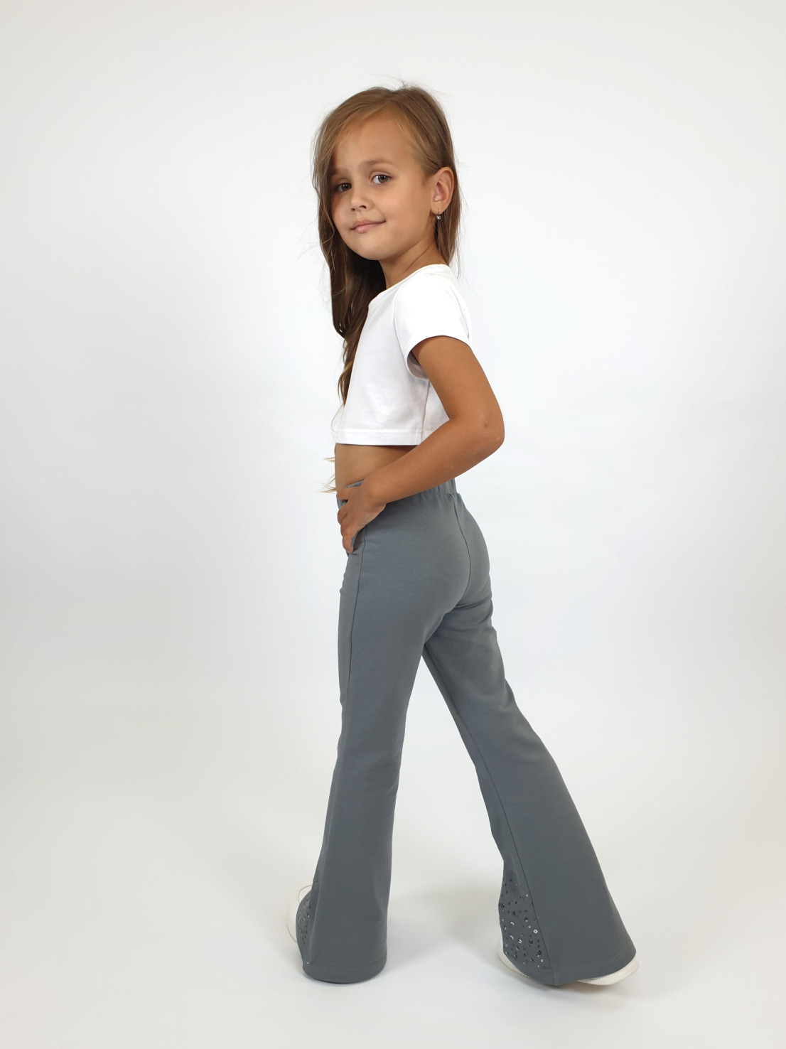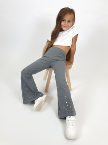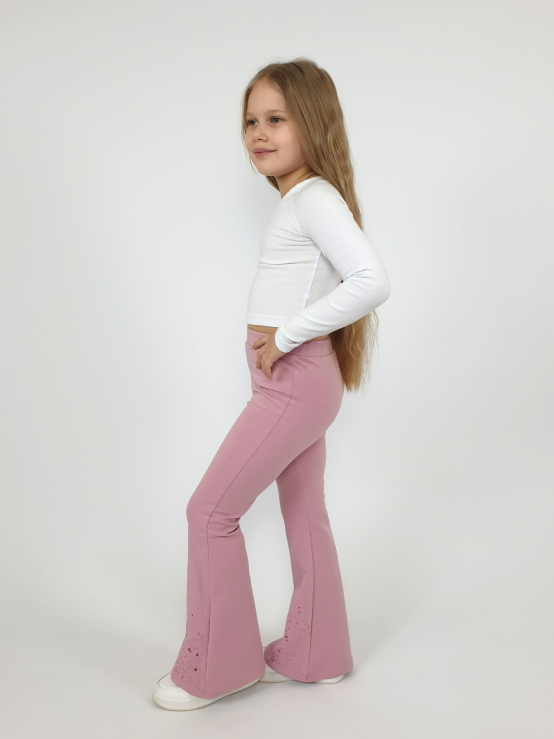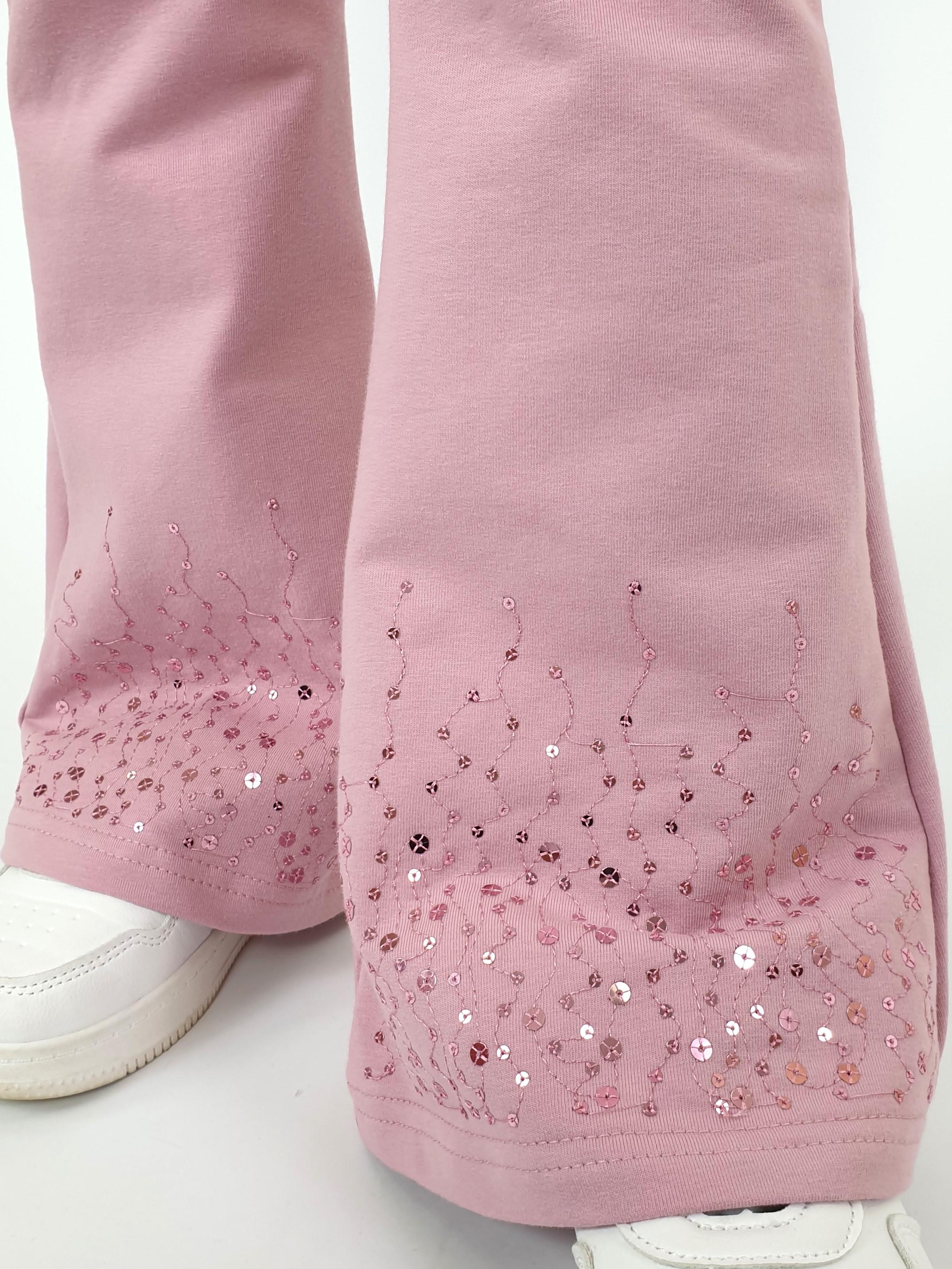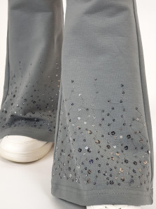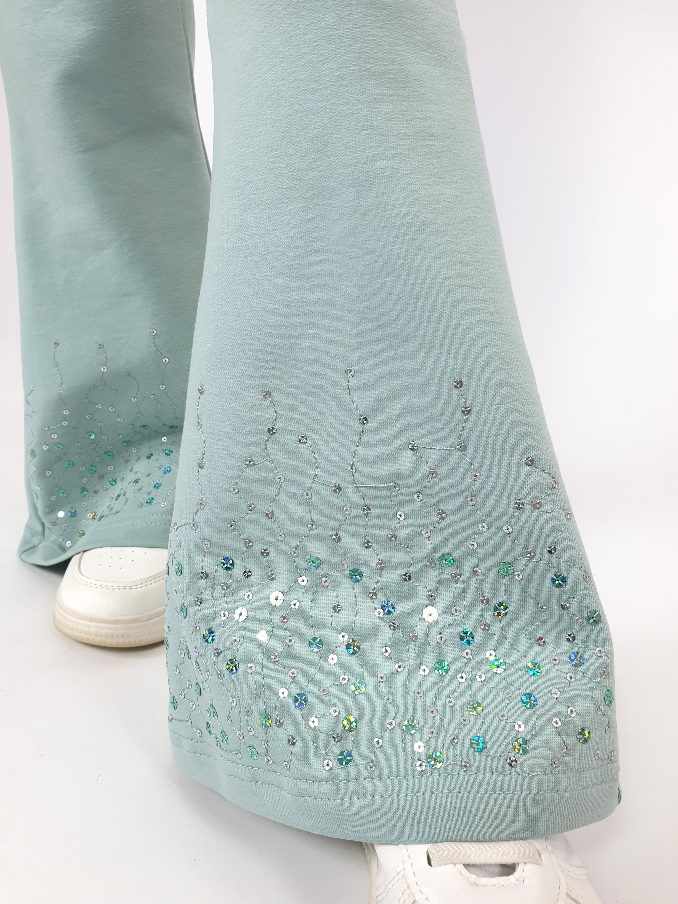 Футер 2-х нитка:95% х/б,5% лайкра. Брюки -длинные,клеш.Пояс притачной с резинкой,низ подшит.Вышивка пайетки на переде внизу.