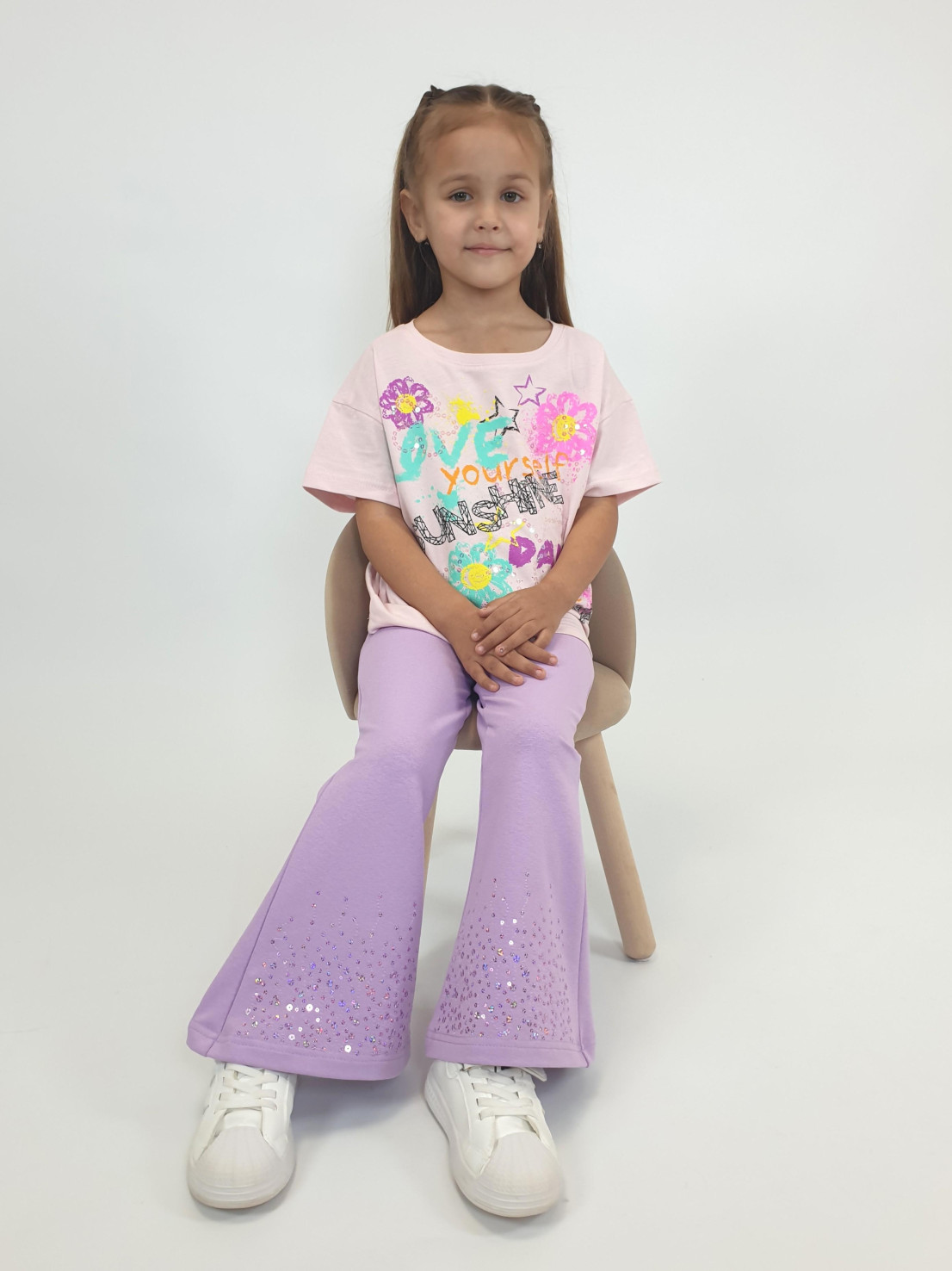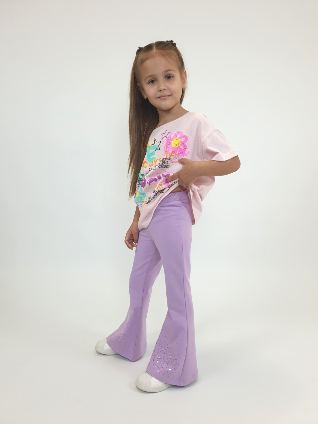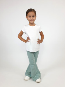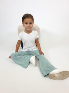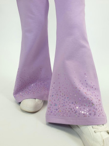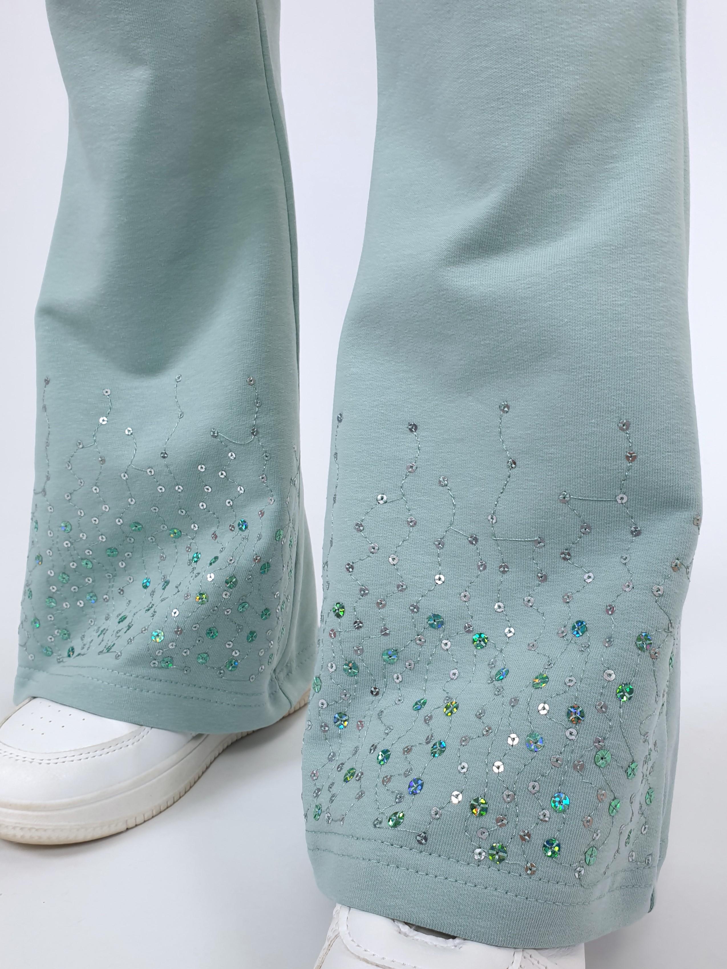 Футер 2-х нитка:95% х/б,5% лайкра. Брюки -длинные,клеш.Пояс притачной с резинкой,низ подшит.Вышивка пайетки на переде внизу.