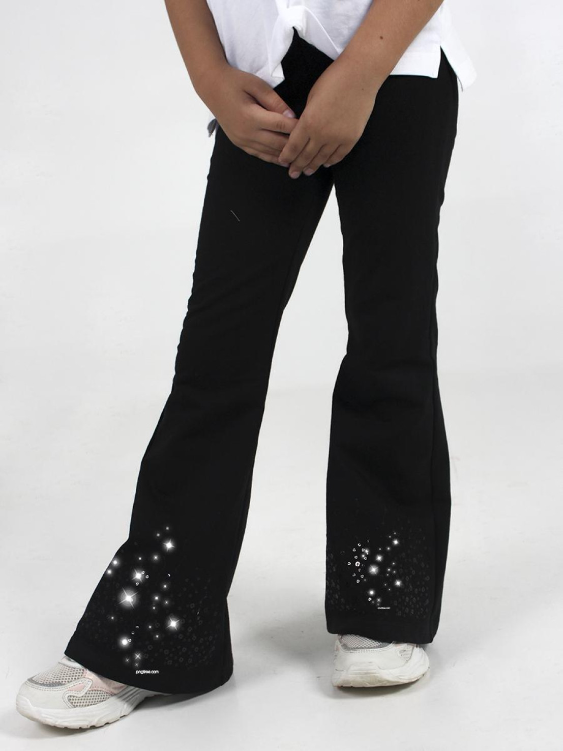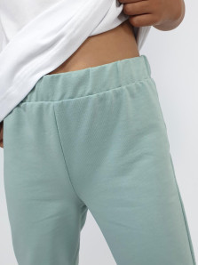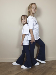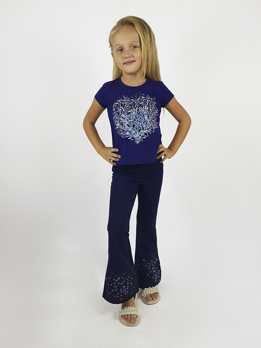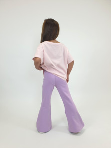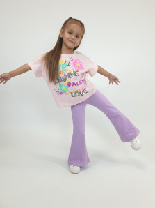 Футер 2-х нитка:95% х/б,5% лайкра. Брюки -длинные,клеш.Пояс притачной с резинкой,низ подшит.Вышивка пайетки на переде внизу.