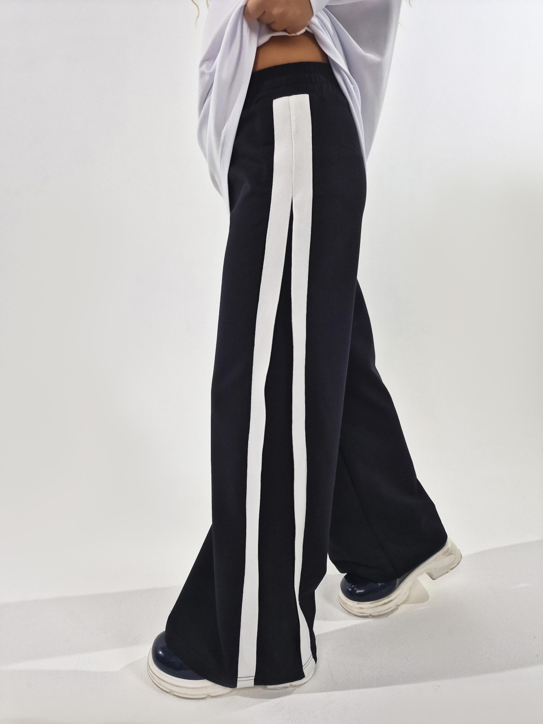 Футер 2-х нитка:95% х/б,5% лайкра. Брюки-длинные,клеш.Притачной пояс с резинкой.Лампасы по боковым швам.