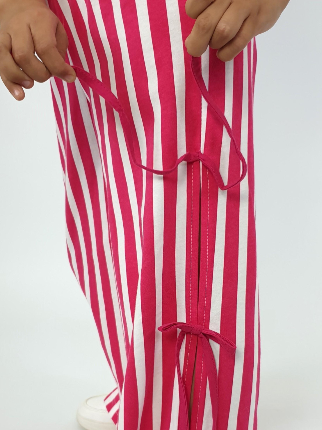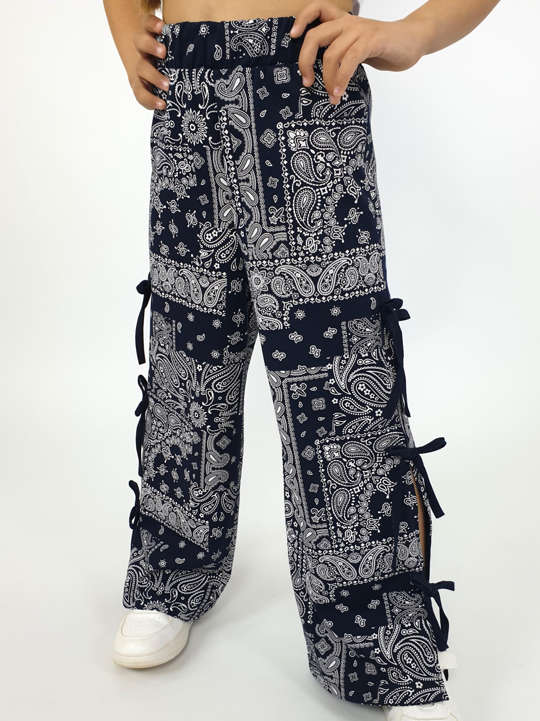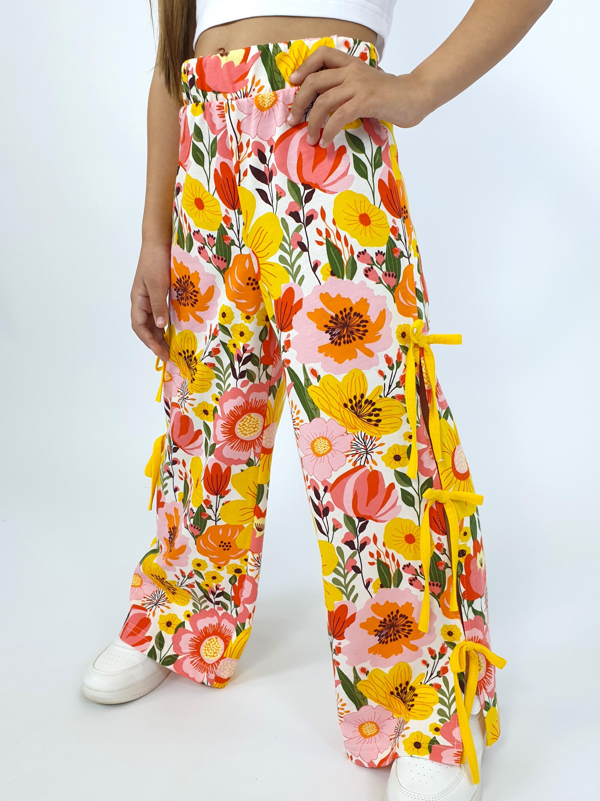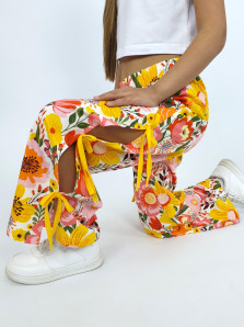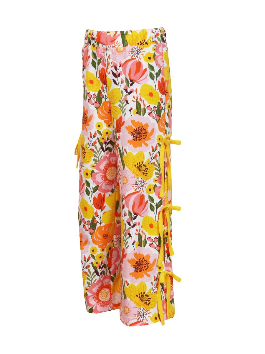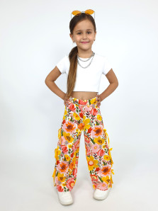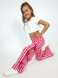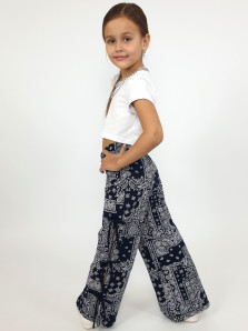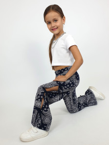 Кулирное полотно:100% х/б. Брюки-длинные,клеш.Притачной пояс с резинкой.Разрезы по боковым швам с отделочными бантиками.