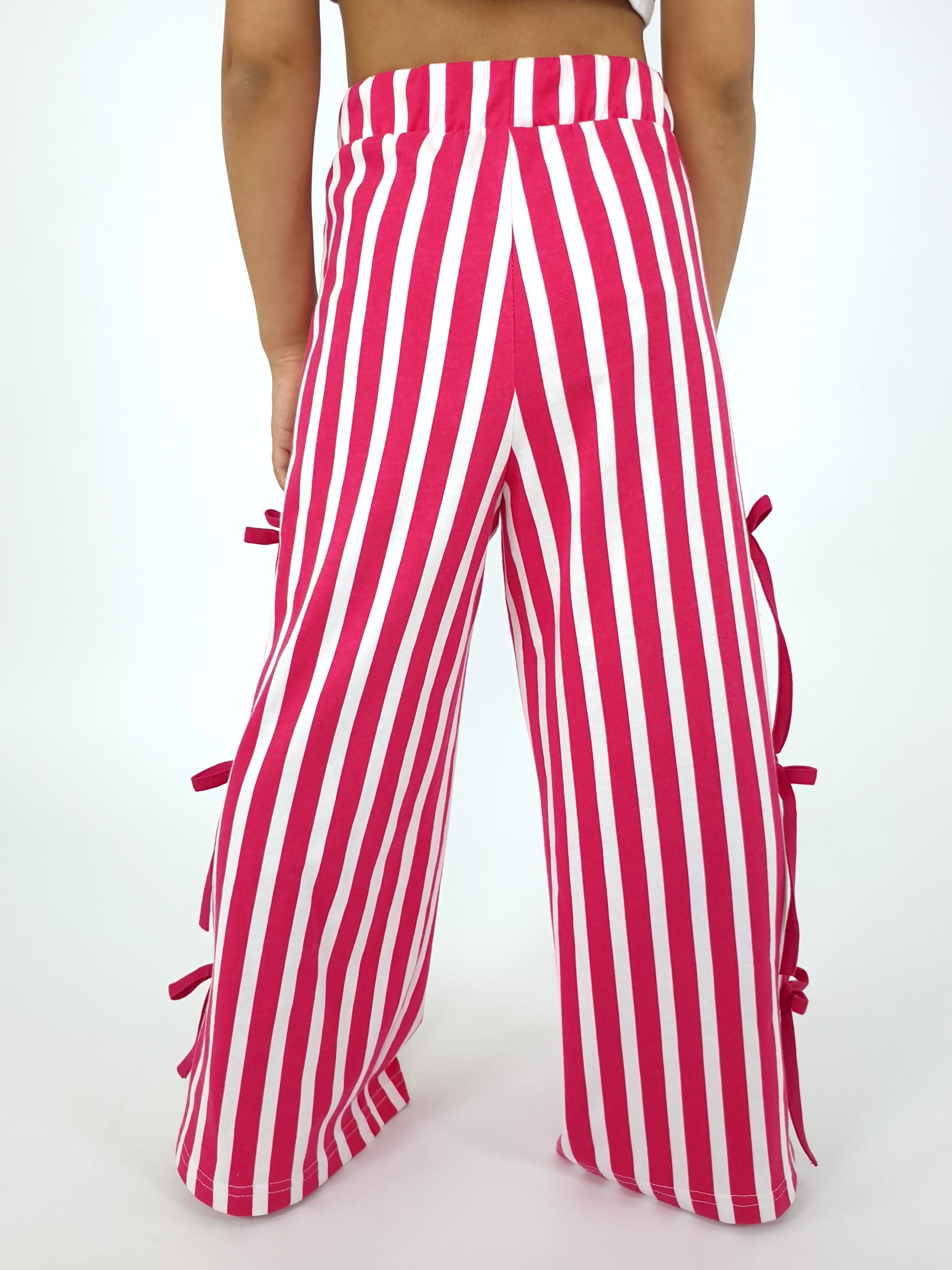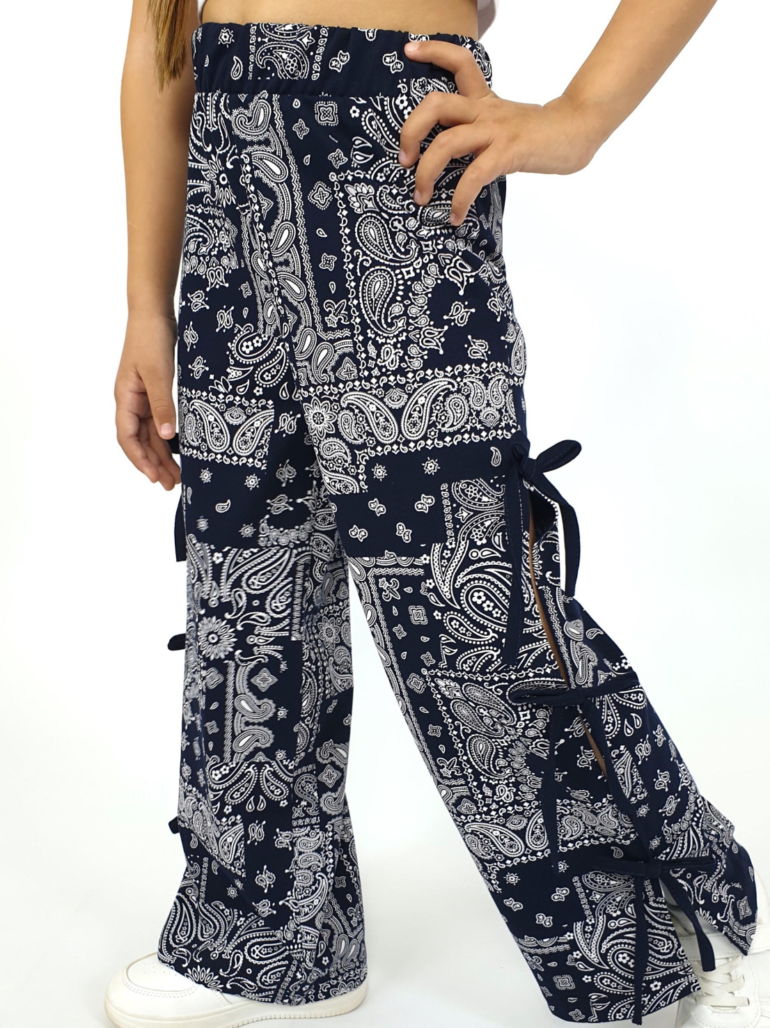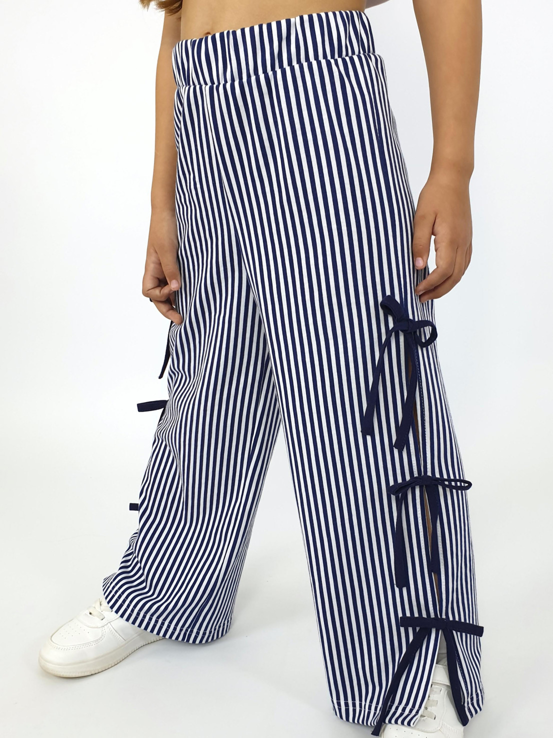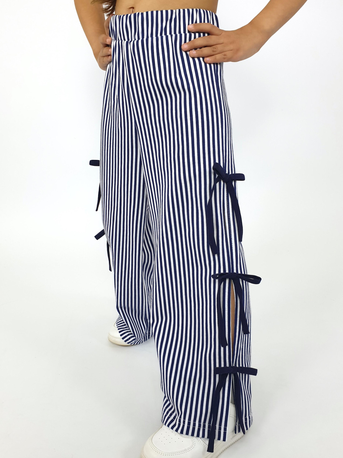 Кулирное полотно:100% х/б. Брюки-длинные,клеш.Притачной пояс с резинкой.Разрезы по боковым швам с отделочными бантиками.