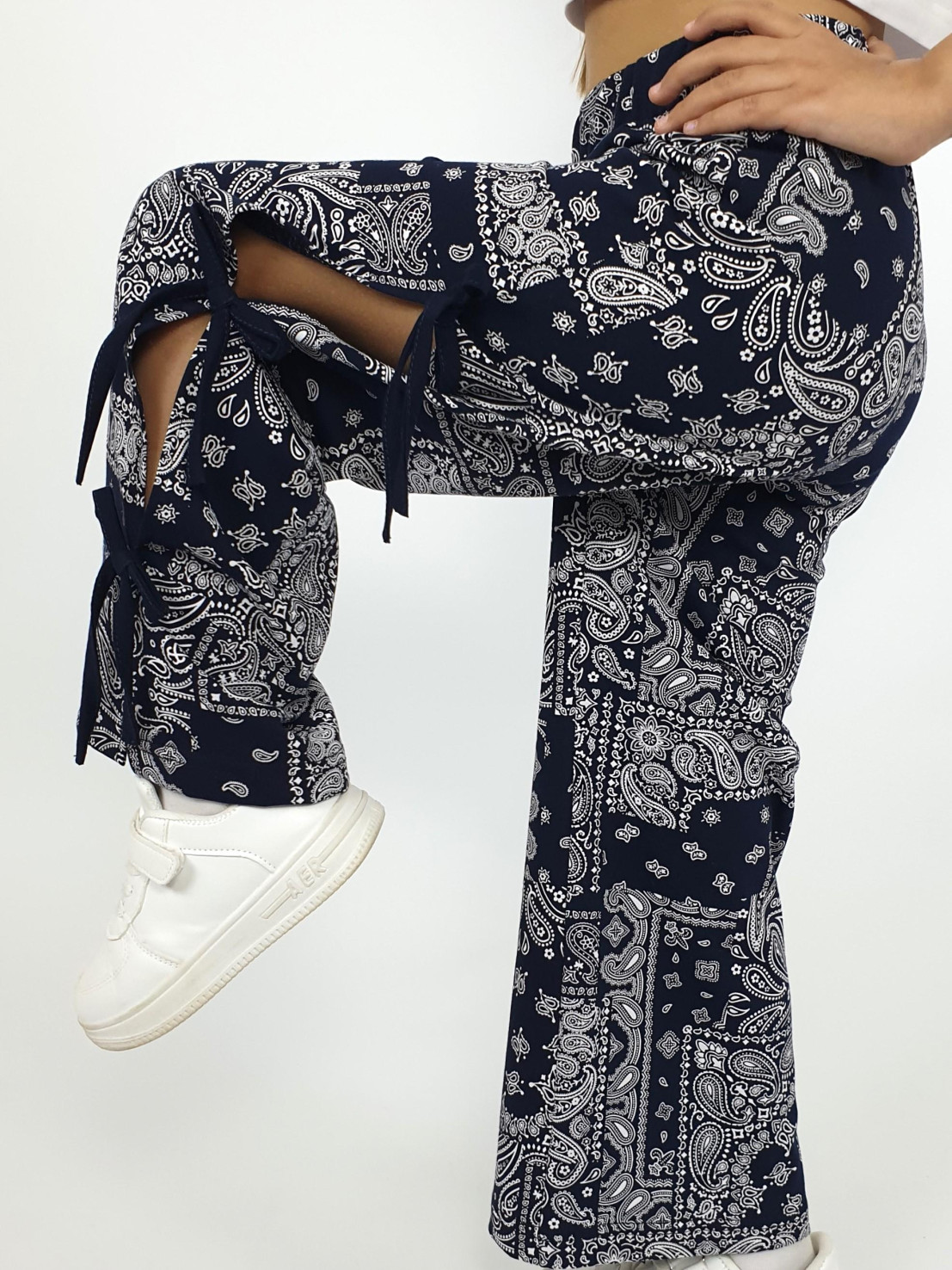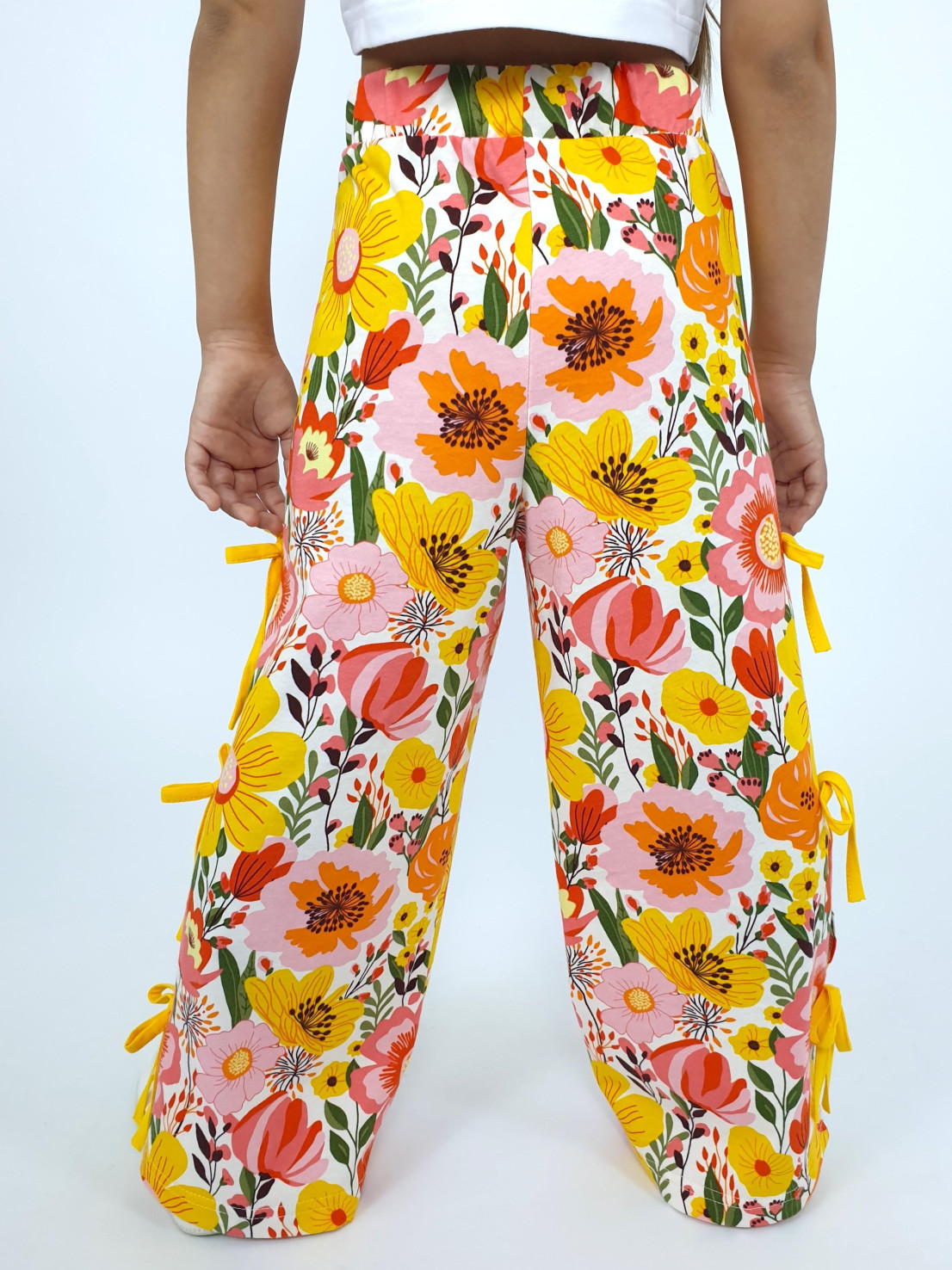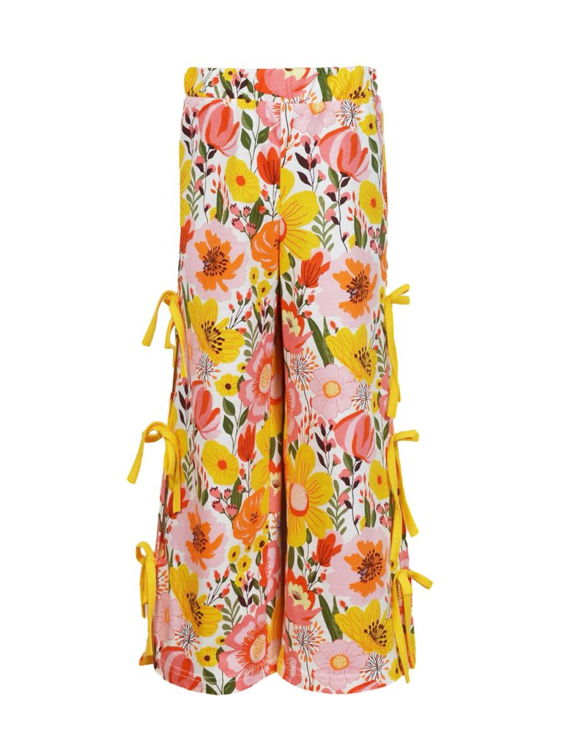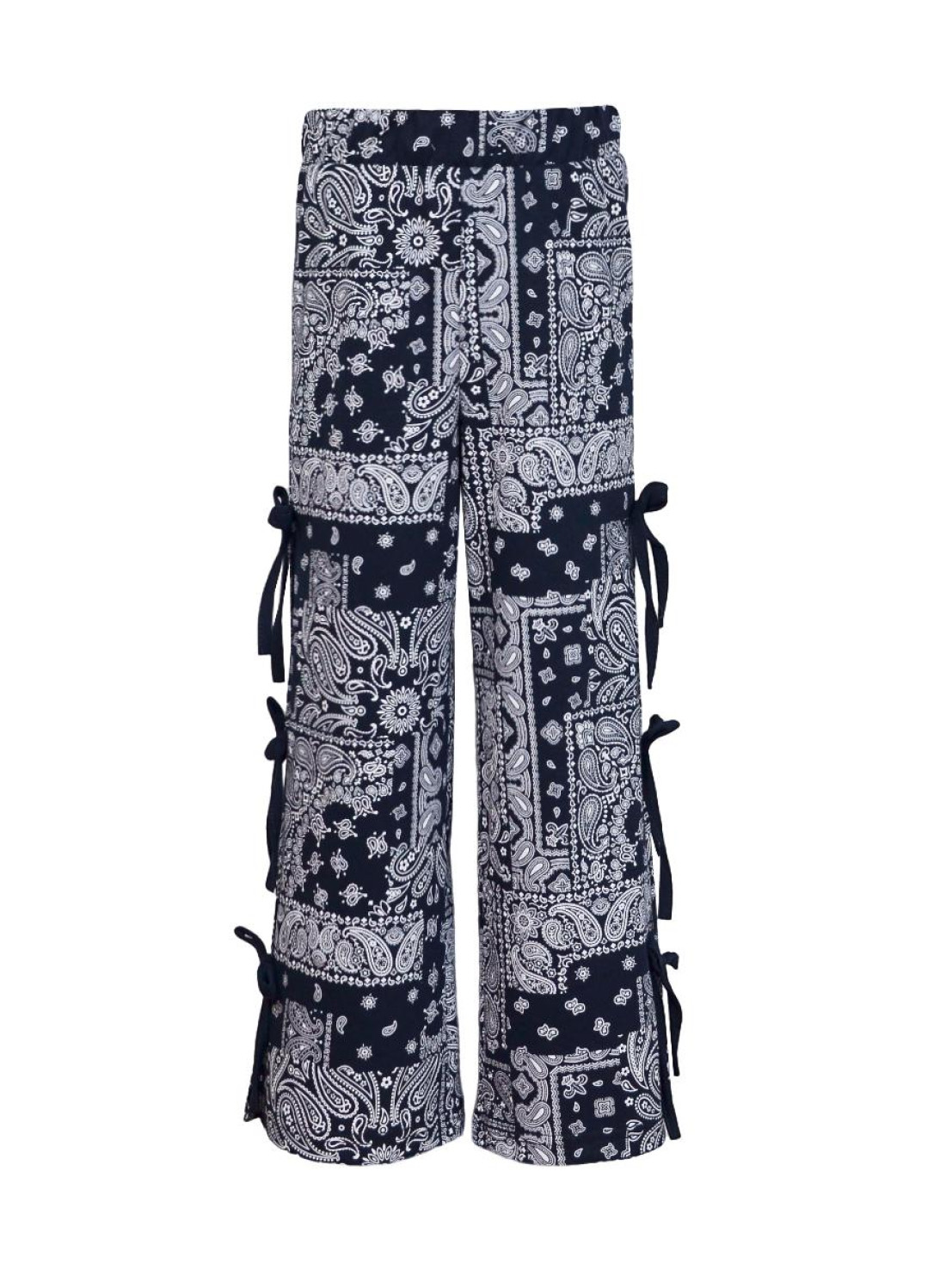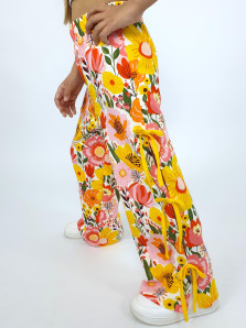 Кулирное полотно:100% х/б. Брюки-длинные,клеш.Притачной пояс с резинкой.Разрезы по боковым швам с отделочными бантиками.