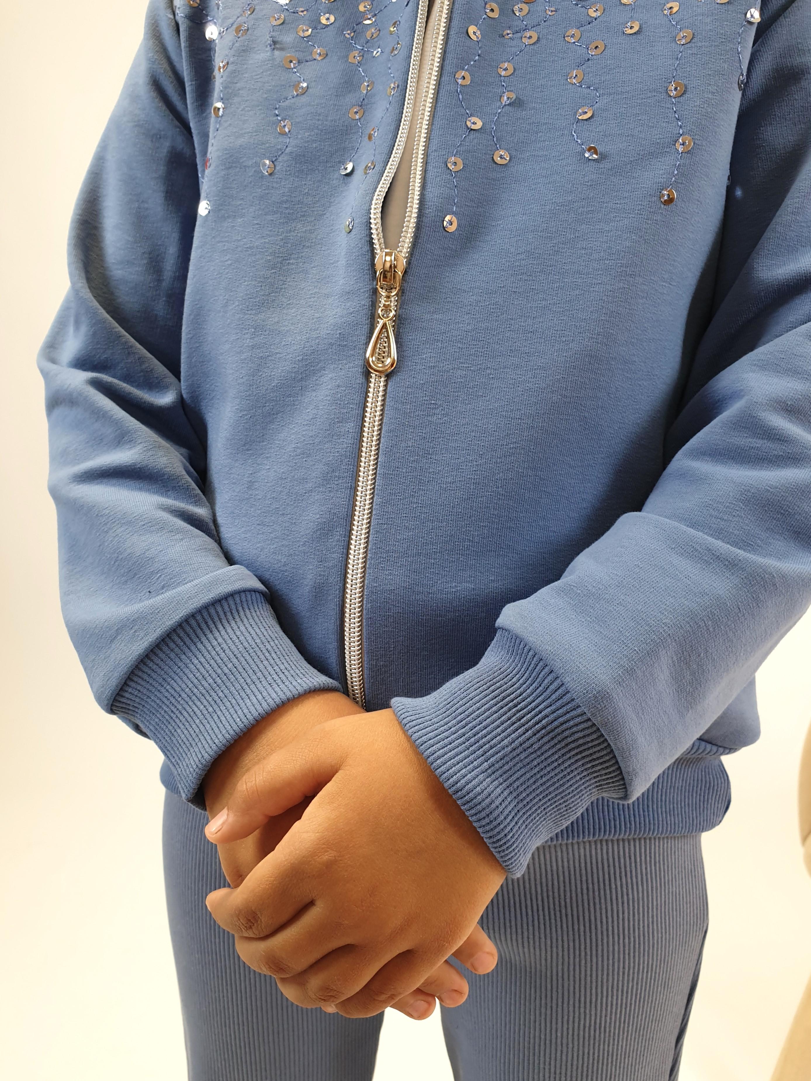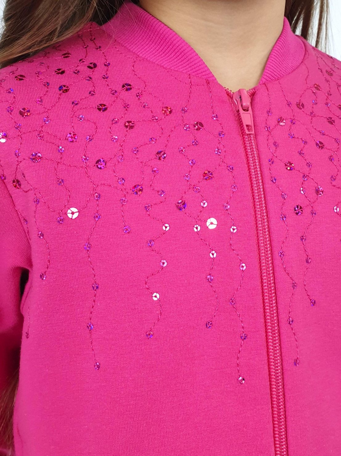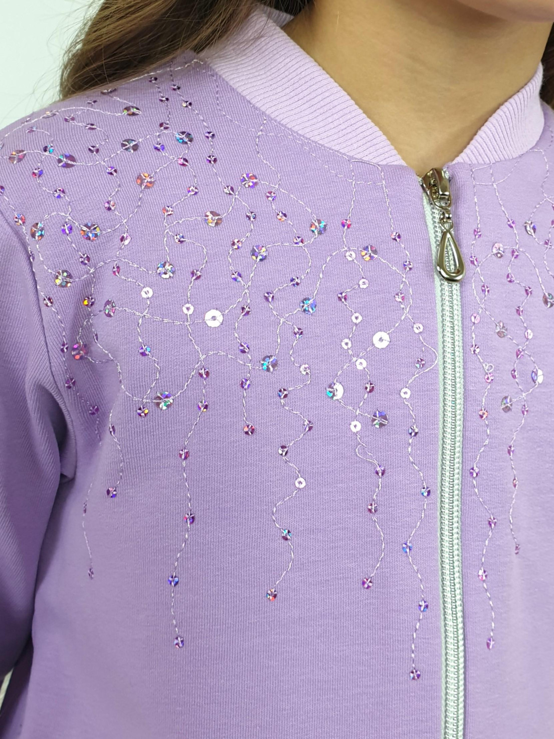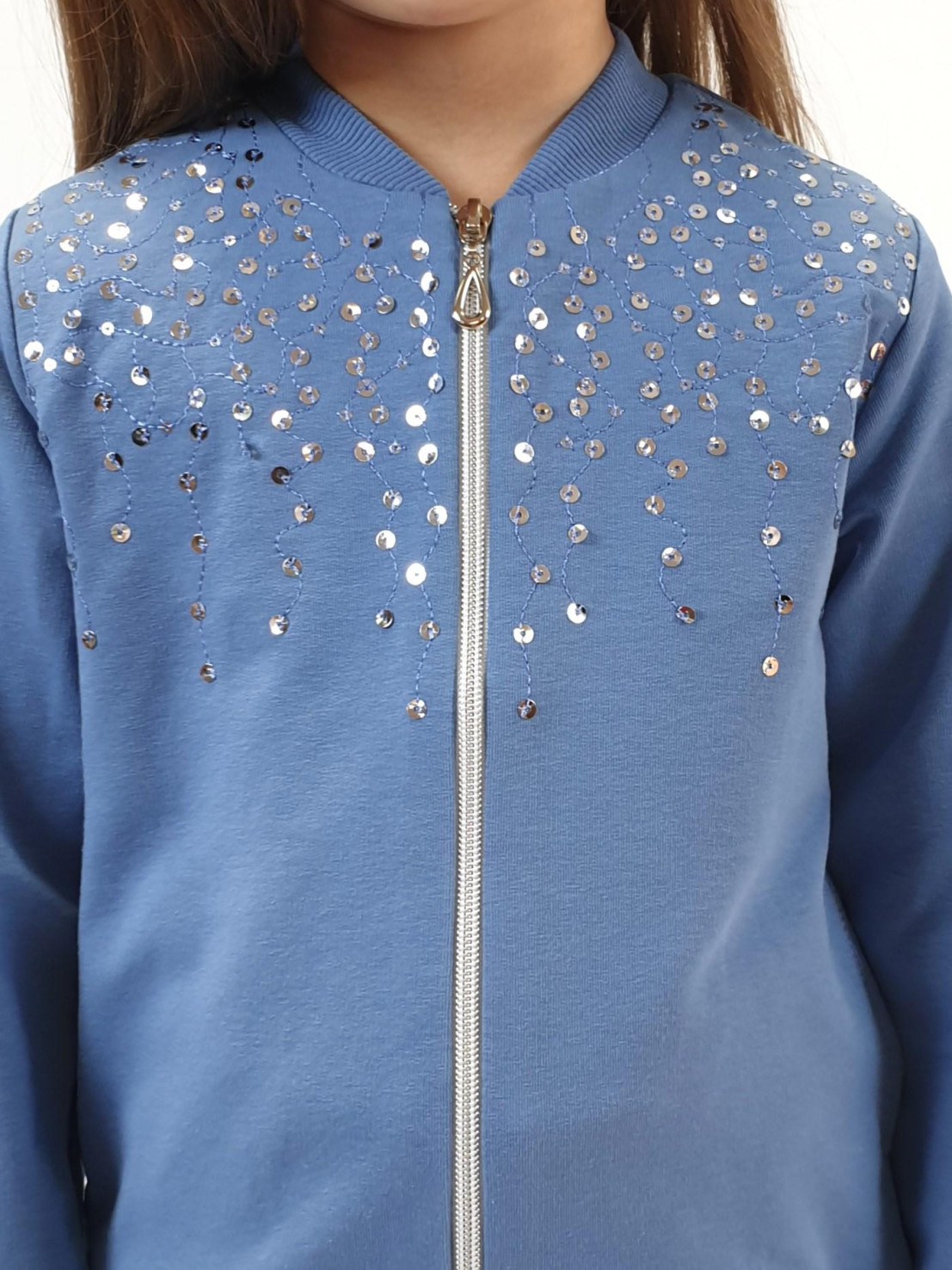Футер 2-х нитка: 95% х/б,5% лайкра. Джемпер-на поясе из ластика,воротник стойка из ластика.Перед с вышивкой(пайетки),два боковых кармана в боковом шве.Центральная застежка на "молнию".Рукав втачной,длинный,на манжете из ластика.