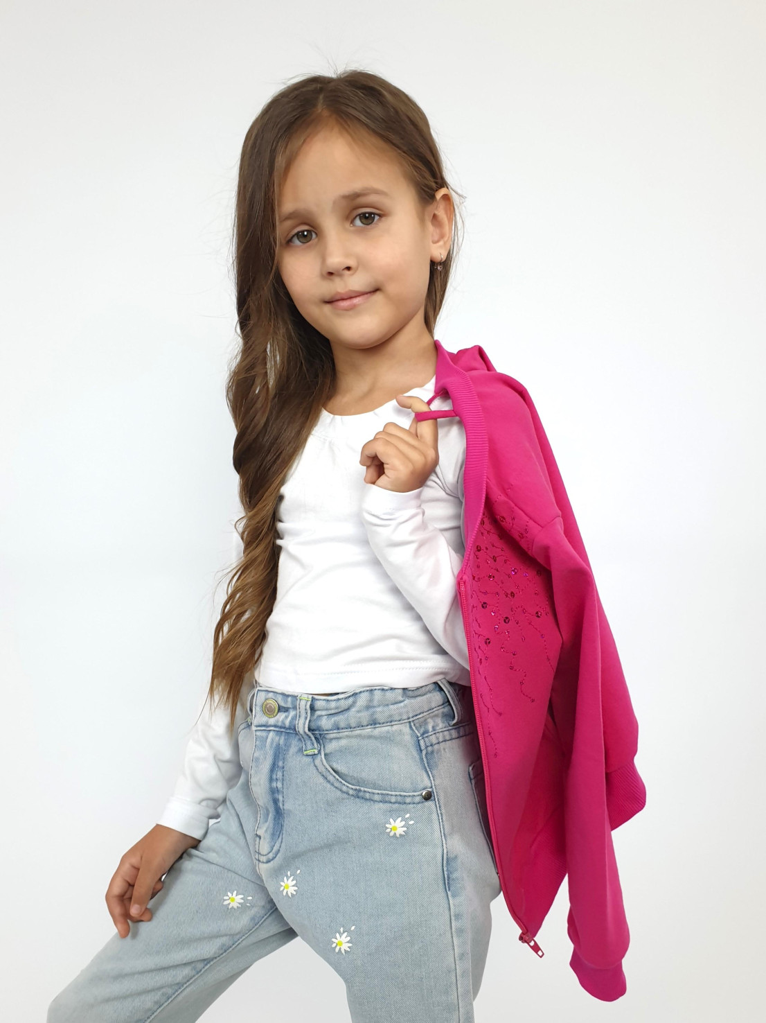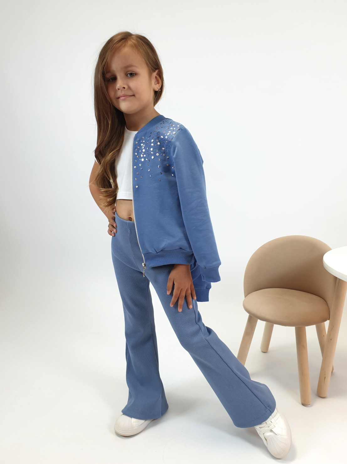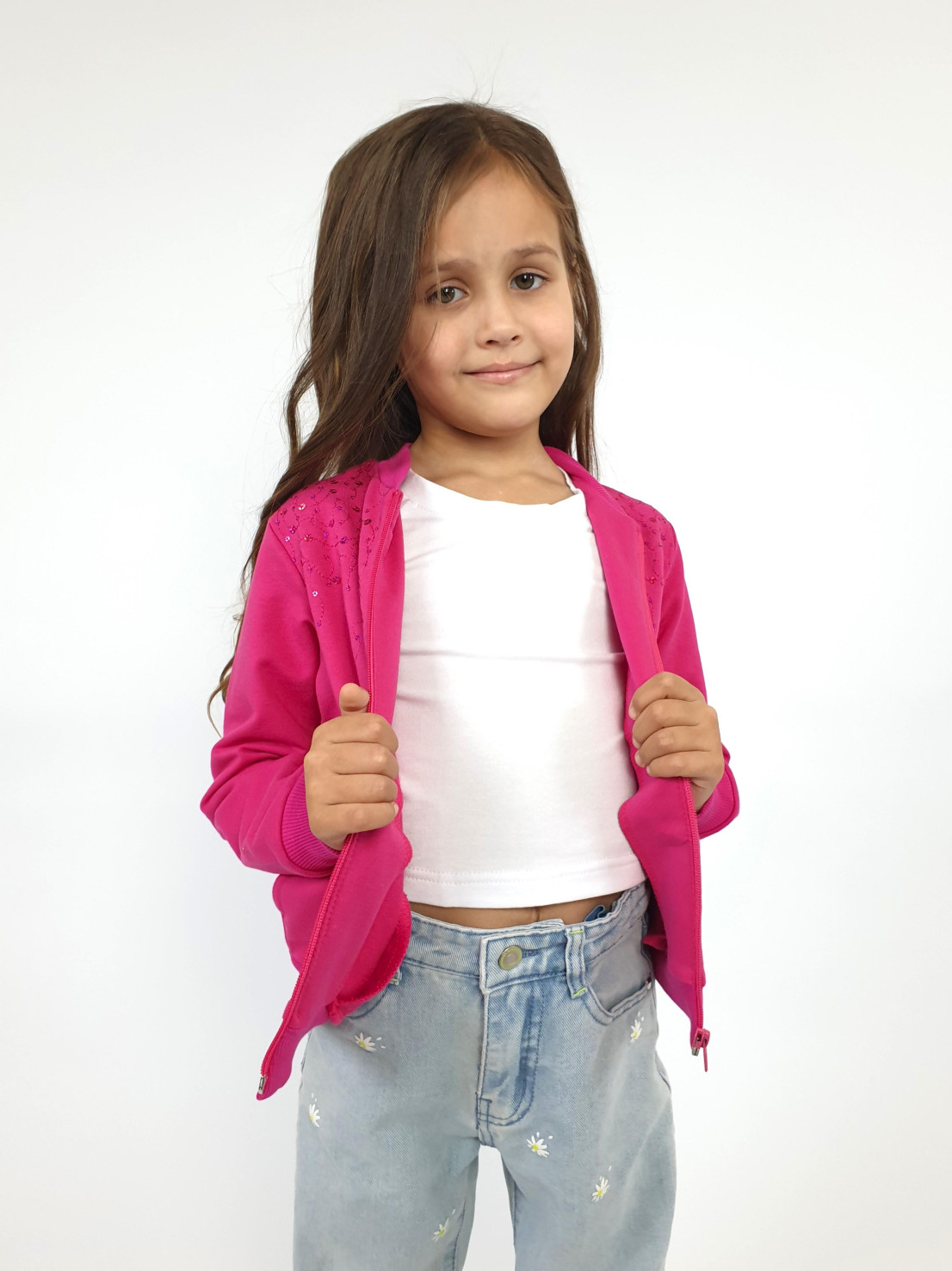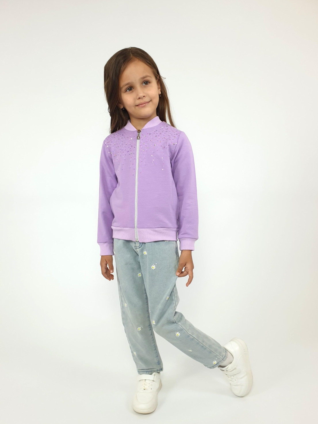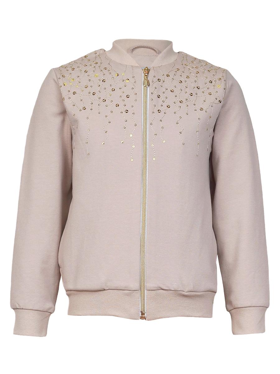 Футер 2-х нитка: 95% х/б,5% лайкра. Джемпер-на поясе из ластика,воротник стойка из ластика.Перед с вышивкой(пайетки),два боковых кармана в боковом шве.Центральная застежка на "молнию".Рукав втачной,длинный,на манжете из ластика.