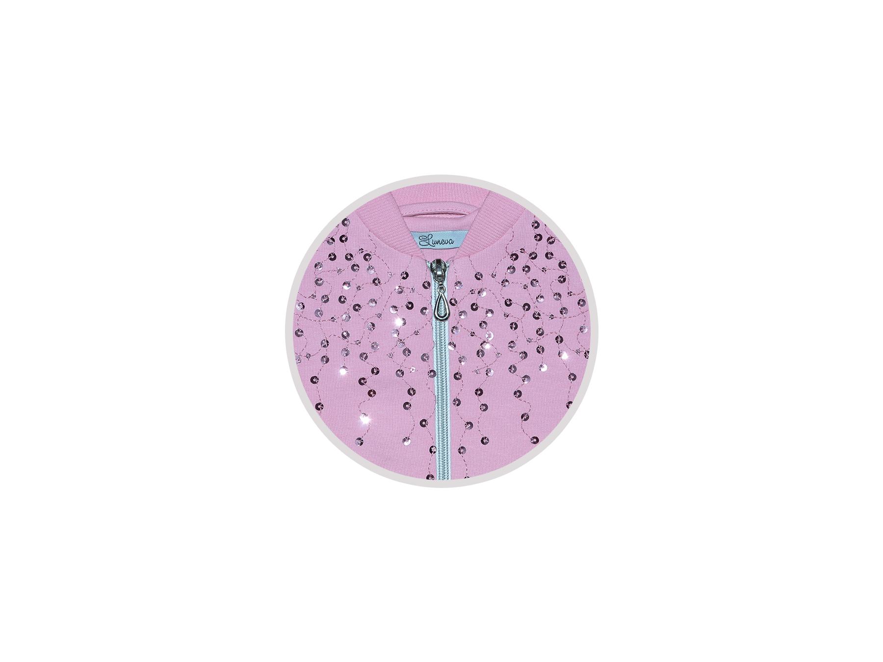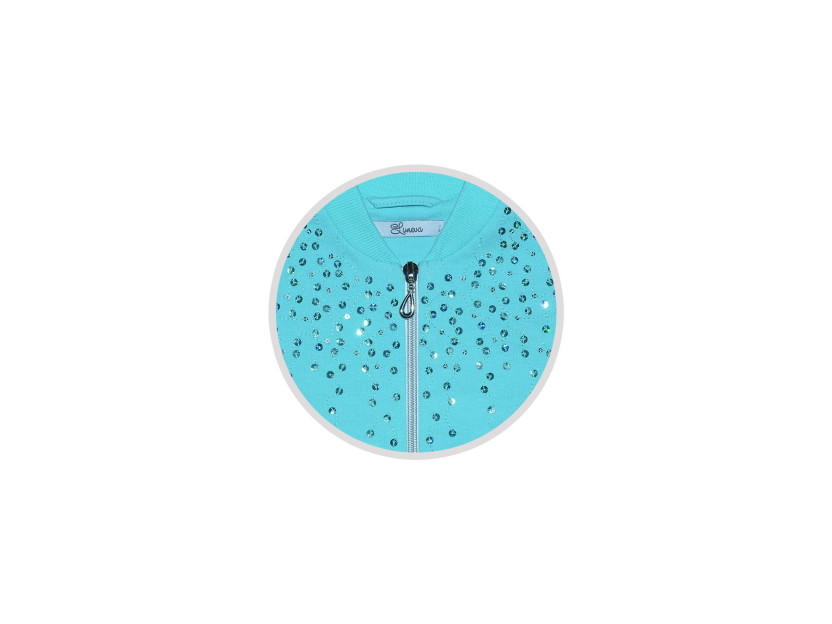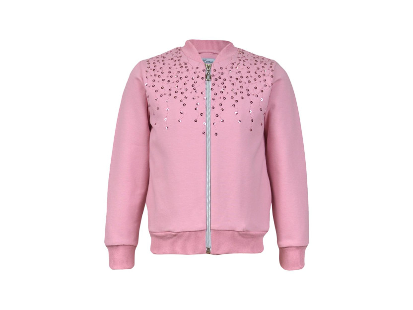 Футер 2-х нитка: 95% х/б,5% лайкра. Джемпер-на поясе из ластика,воротник стойка из ластика.Перед с вышивкой(пайетки),два боковых кармана в боковом шве.Центральная застежка на "молнию".Рукав втачной,длинный,на манжете из ластика.