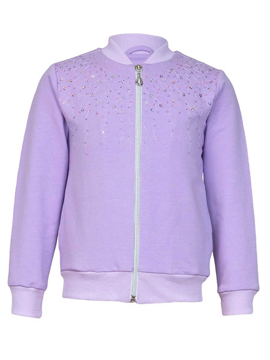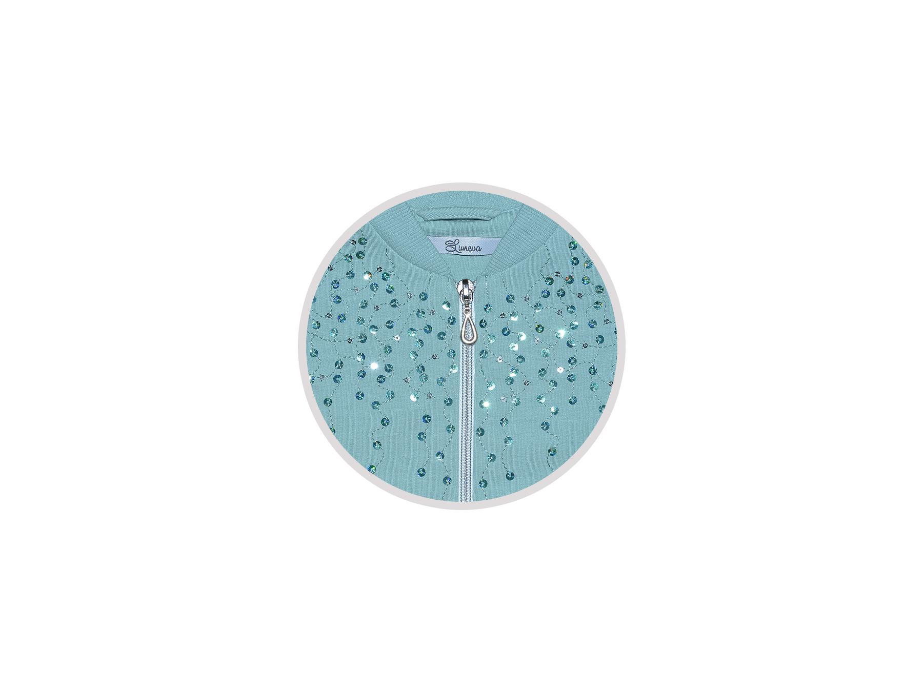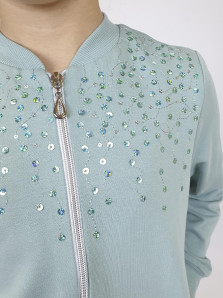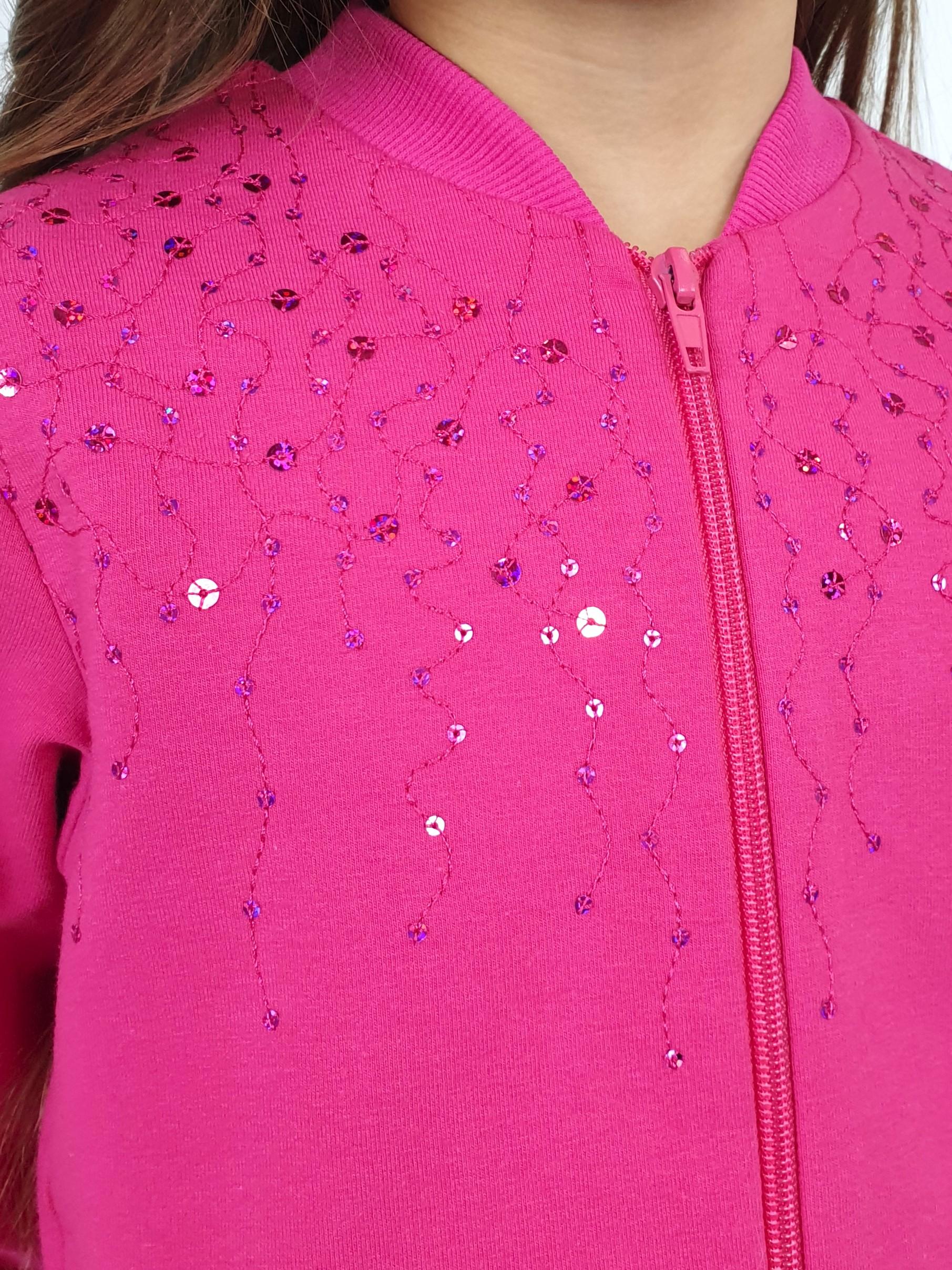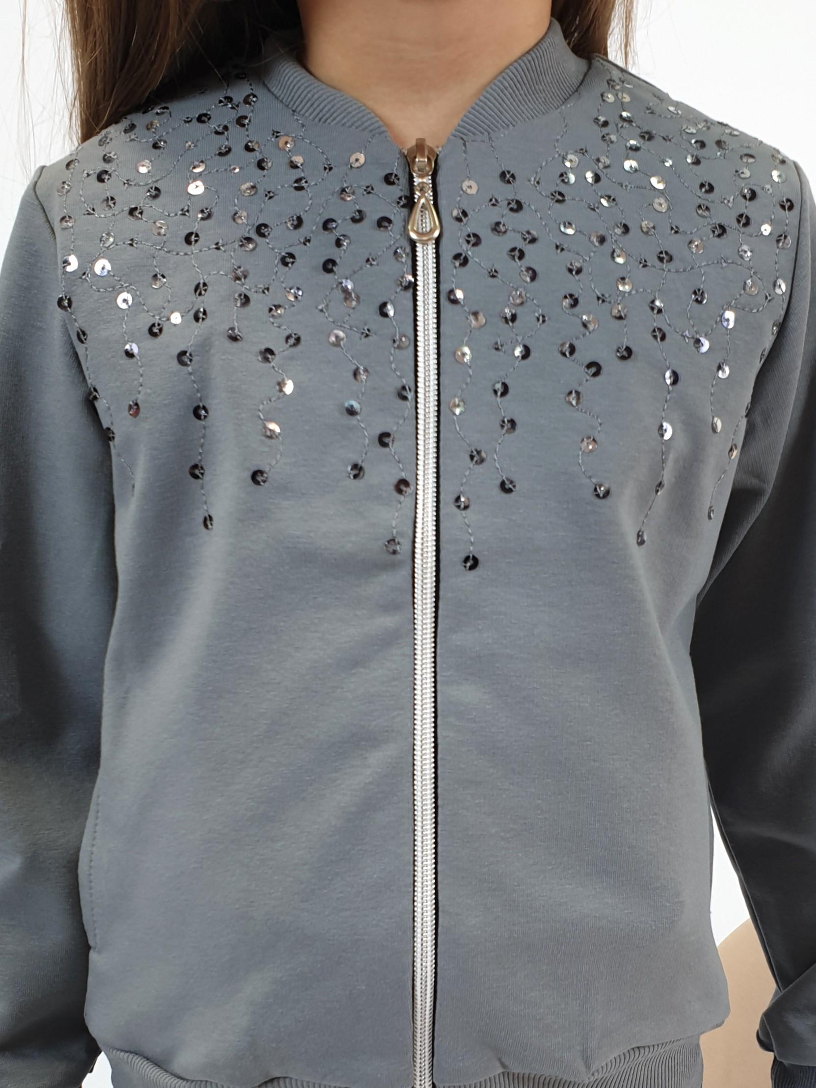Футер 2-х нитка: 95% х/б,5% лайкра. Джемпер-на поясе из ластика,воротник стойка из ластика.Перед с вышивкой(пайетки),два боковых кармана в боковом шве.Центральная застежка на "молнию".Рукав втачной,длинный,на манжете из ластика.
