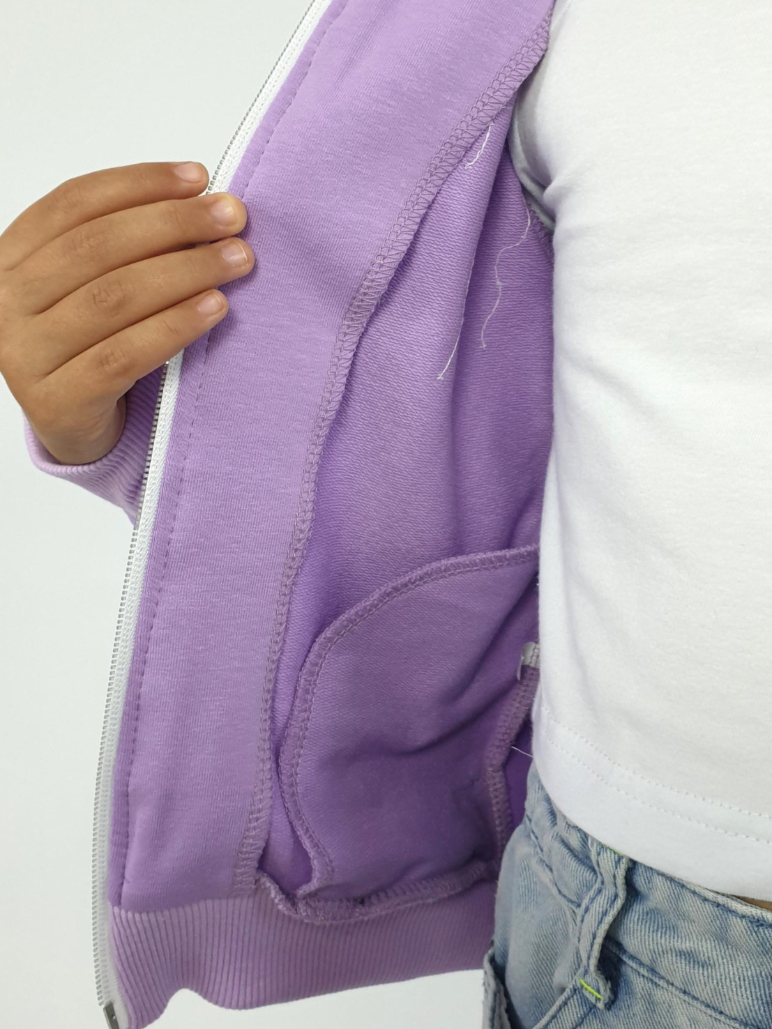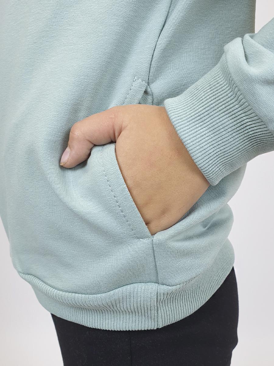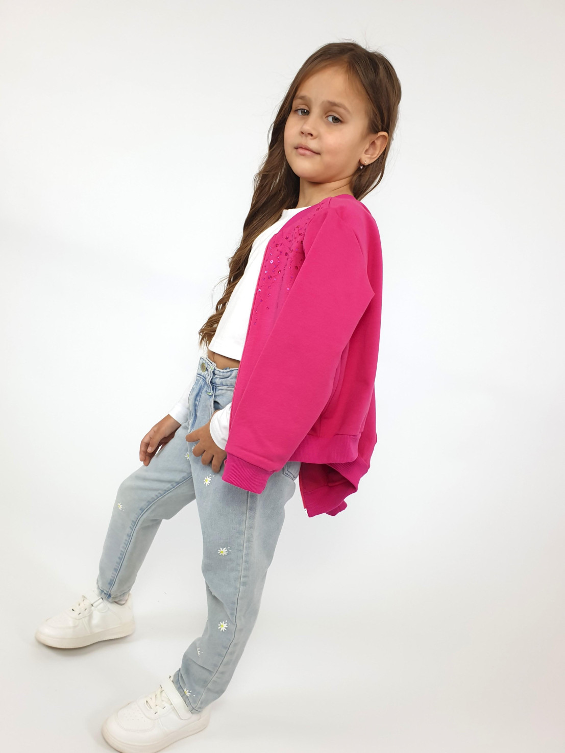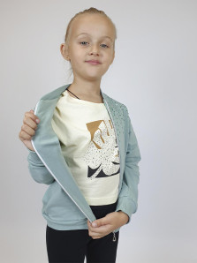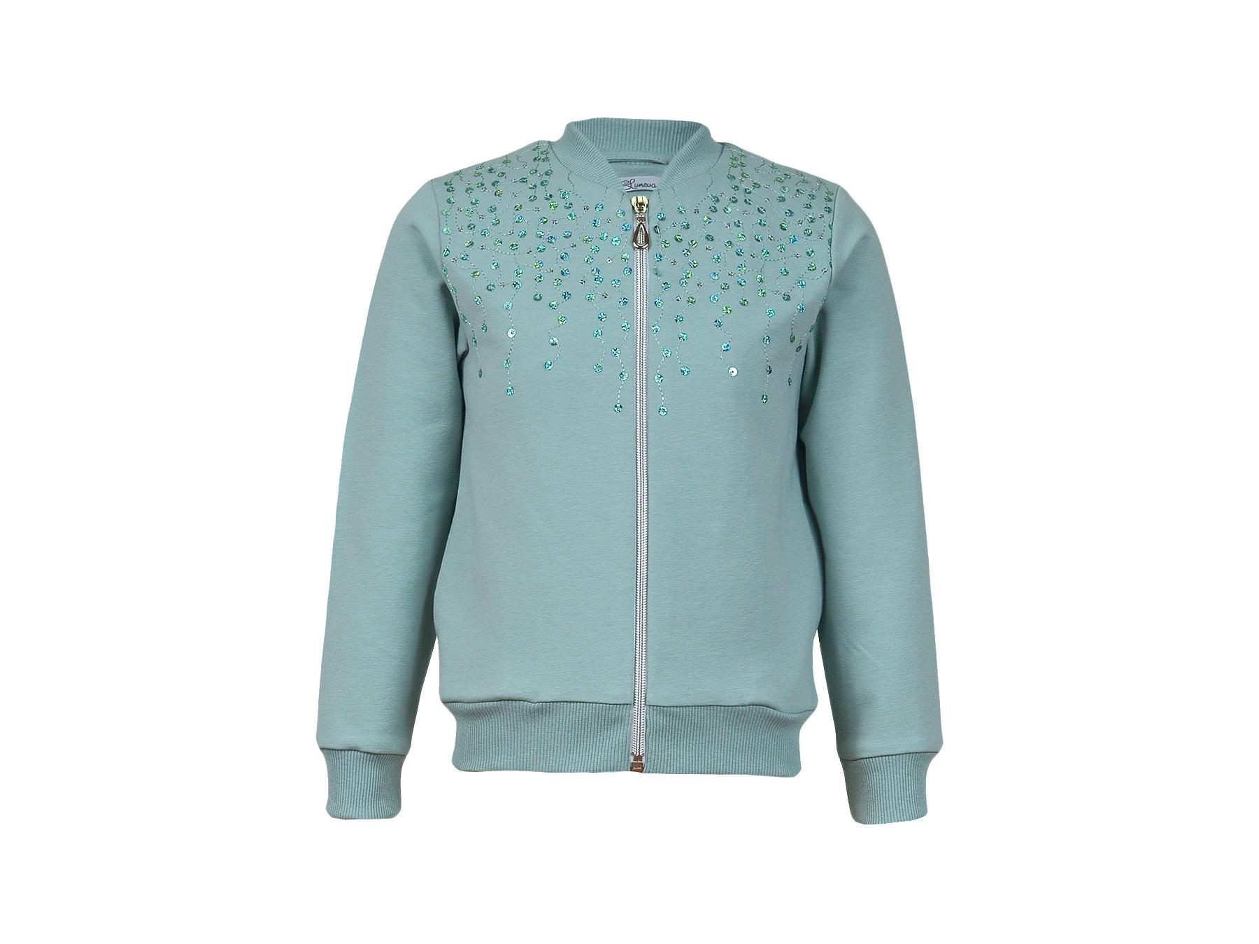 Футер 2-х нитка: 95% х/б,5% лайкра. Джемпер-на поясе из ластика,воротник стойка из ластика.Перед с вышивкой(пайетки),два боковых кармана в боковом шве.Центральная застежка на "молнию".Рукав втачной,длинный,на манжете из ластика.