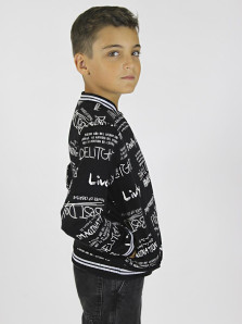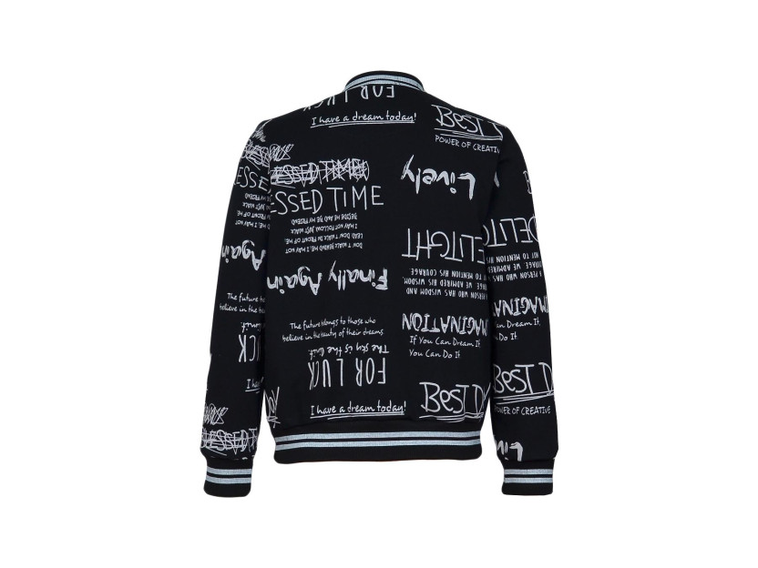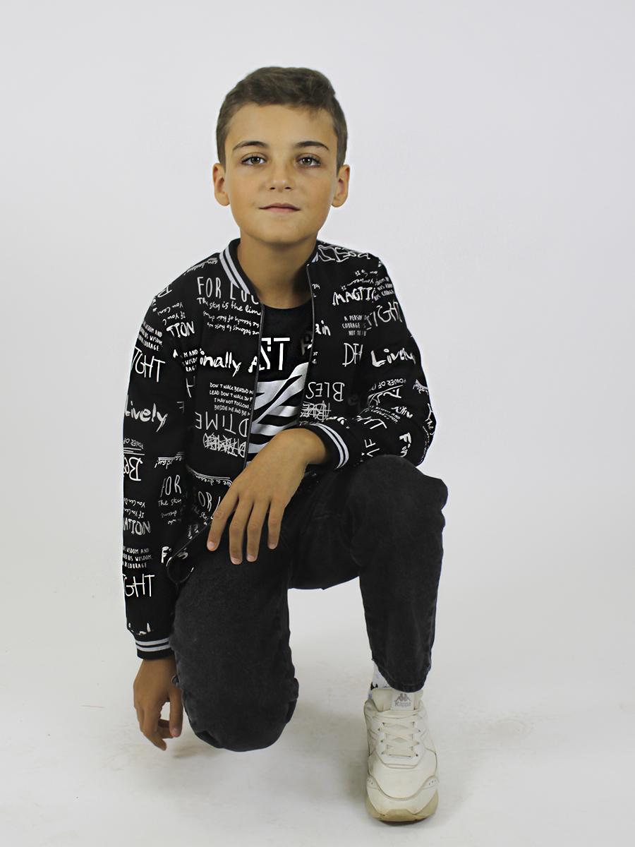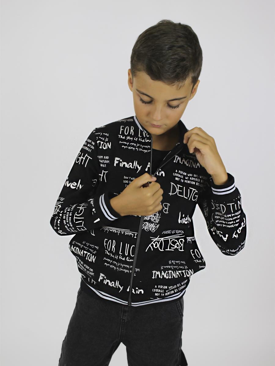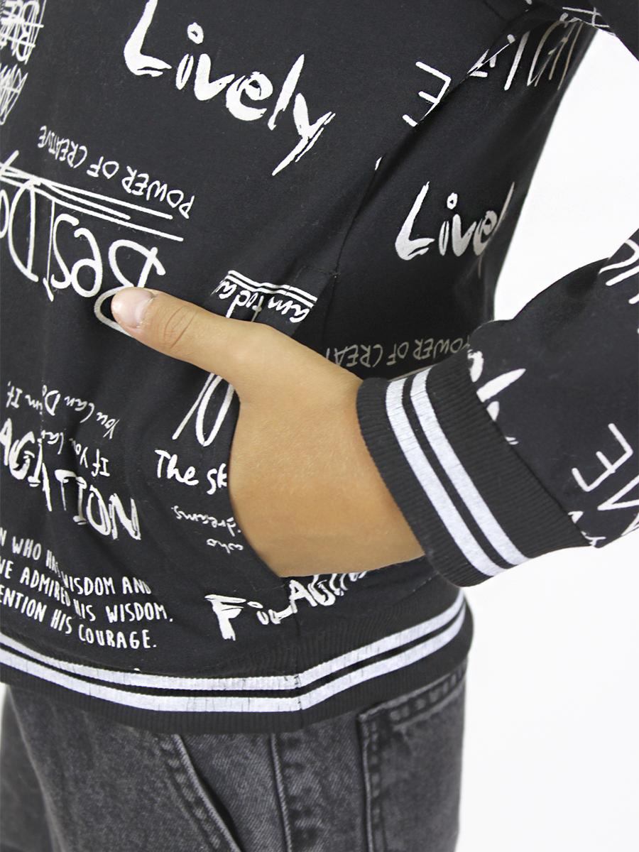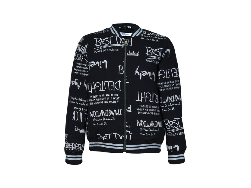 Футер двух-нитка:75% х/б,25% п/э. Джемпер-прямой,на поясе из ластика,воротник стойка из ластика.Центральная застежка на "молнию".Рукав втачной,длинный на манжете из ластика.Два кармана в боковом шве.Печать на поясе,манжетах и воротнике.