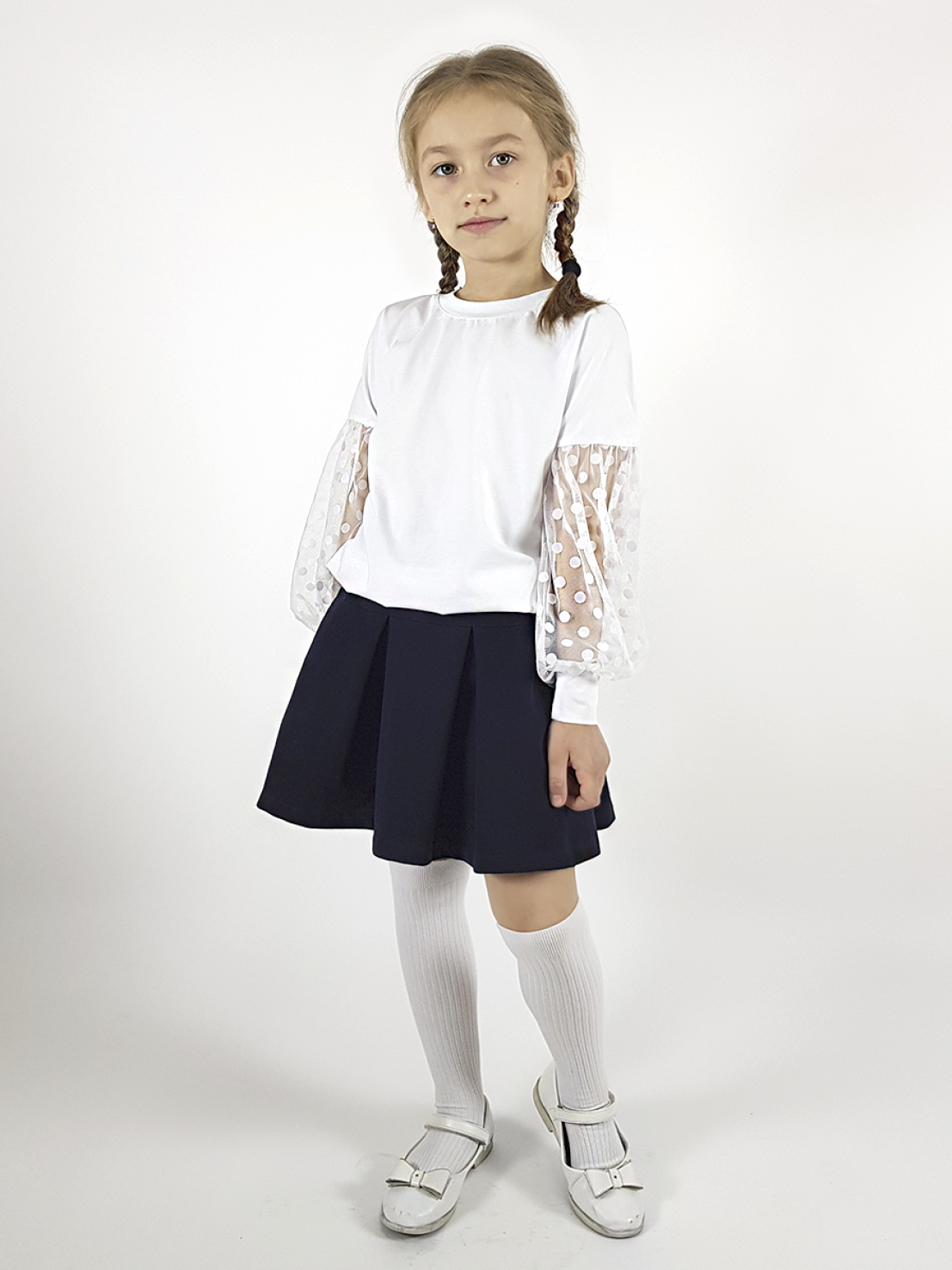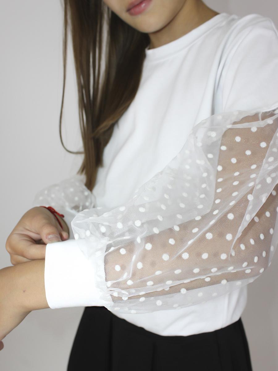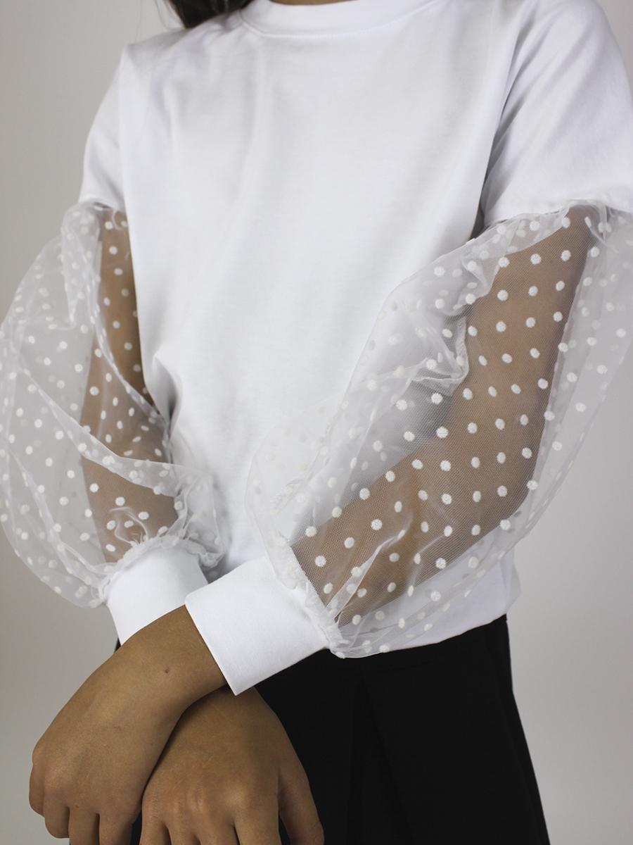 Кулирное полотно:95% х/б.,5% лайкра,(сетка горох Флок напыление):100% п/э. Джемпер-прямой,спущенное плечо,внизу на поясе.Цельнокроеный длинный рукав из сетки со сборкой,внизу на манжете.Горловина обработана планкой.