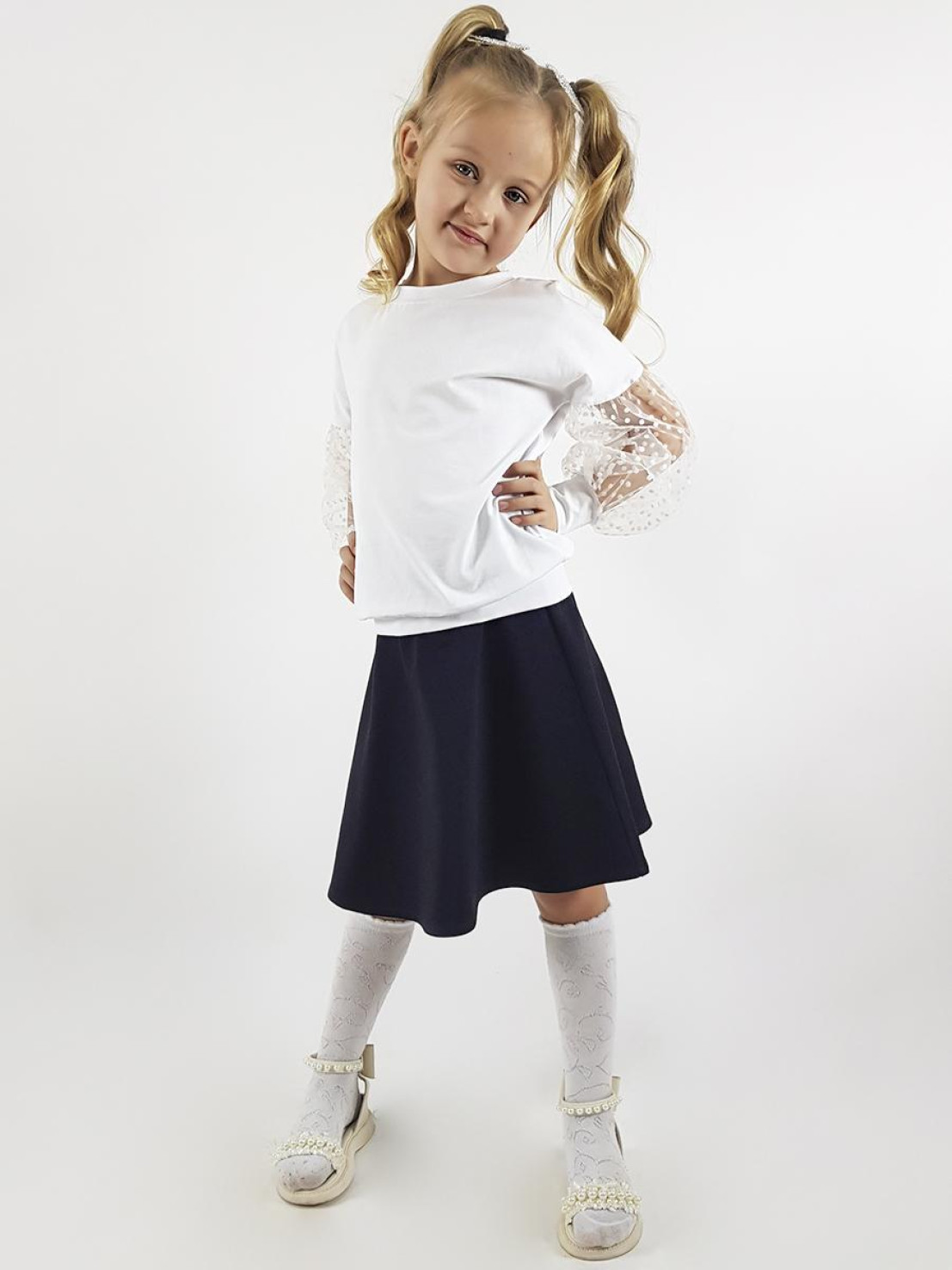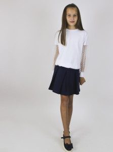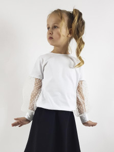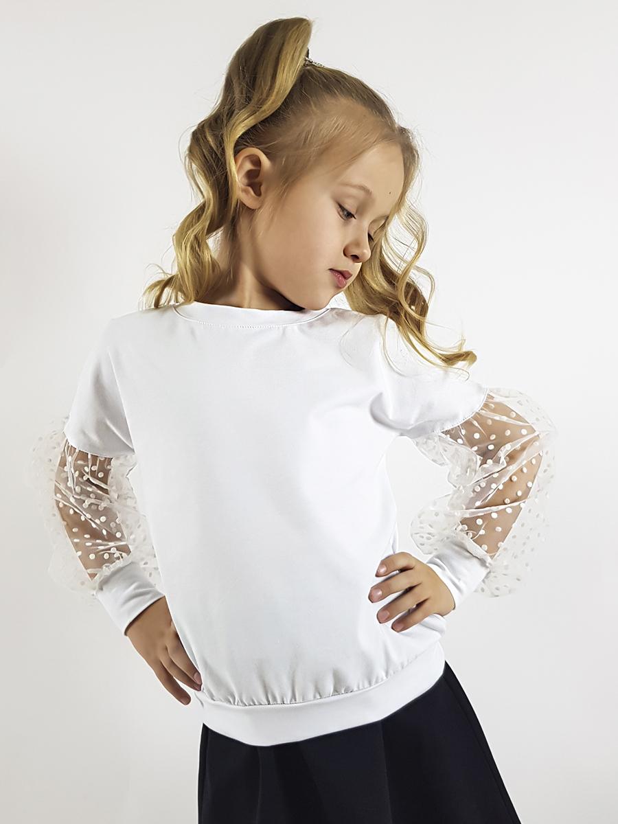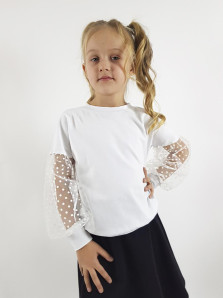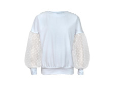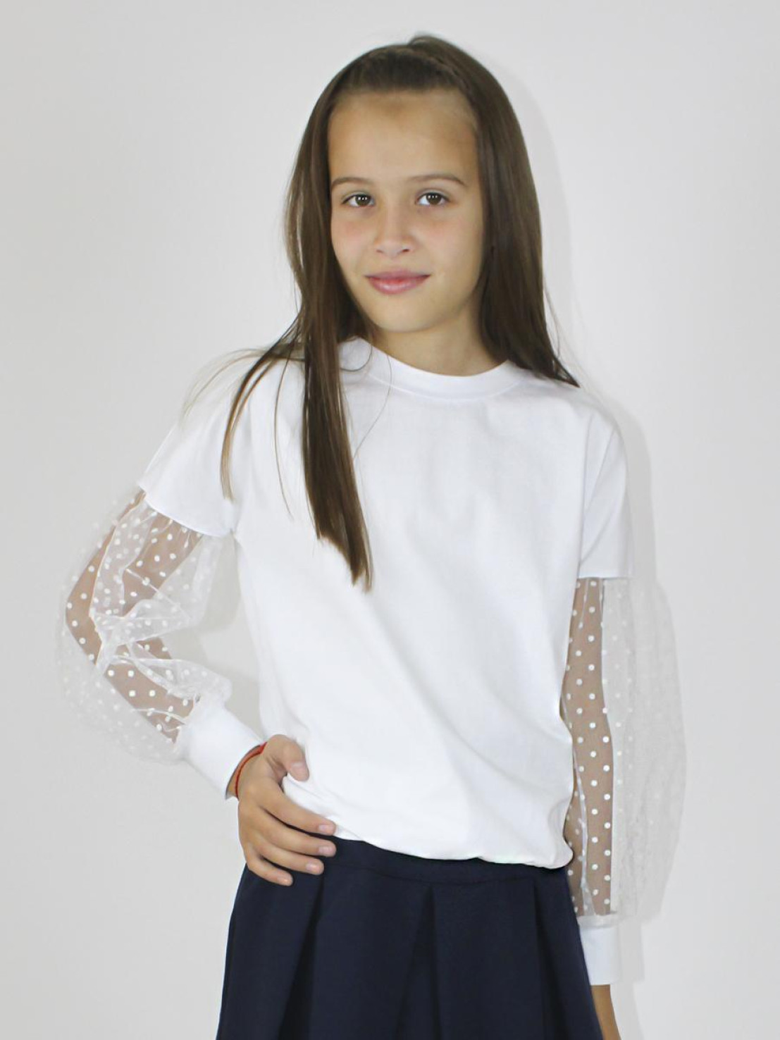 Кулирное полотно:95% х/б.,5% лайкра,(сетка горох Флок напыление):100% п/э. Джемпер-прямой,спущенное плечо,внизу на поясе.Цельнокроеный длинный рукав из сетки со сборкой,внизу на манжете.Горловина обработана планкой.