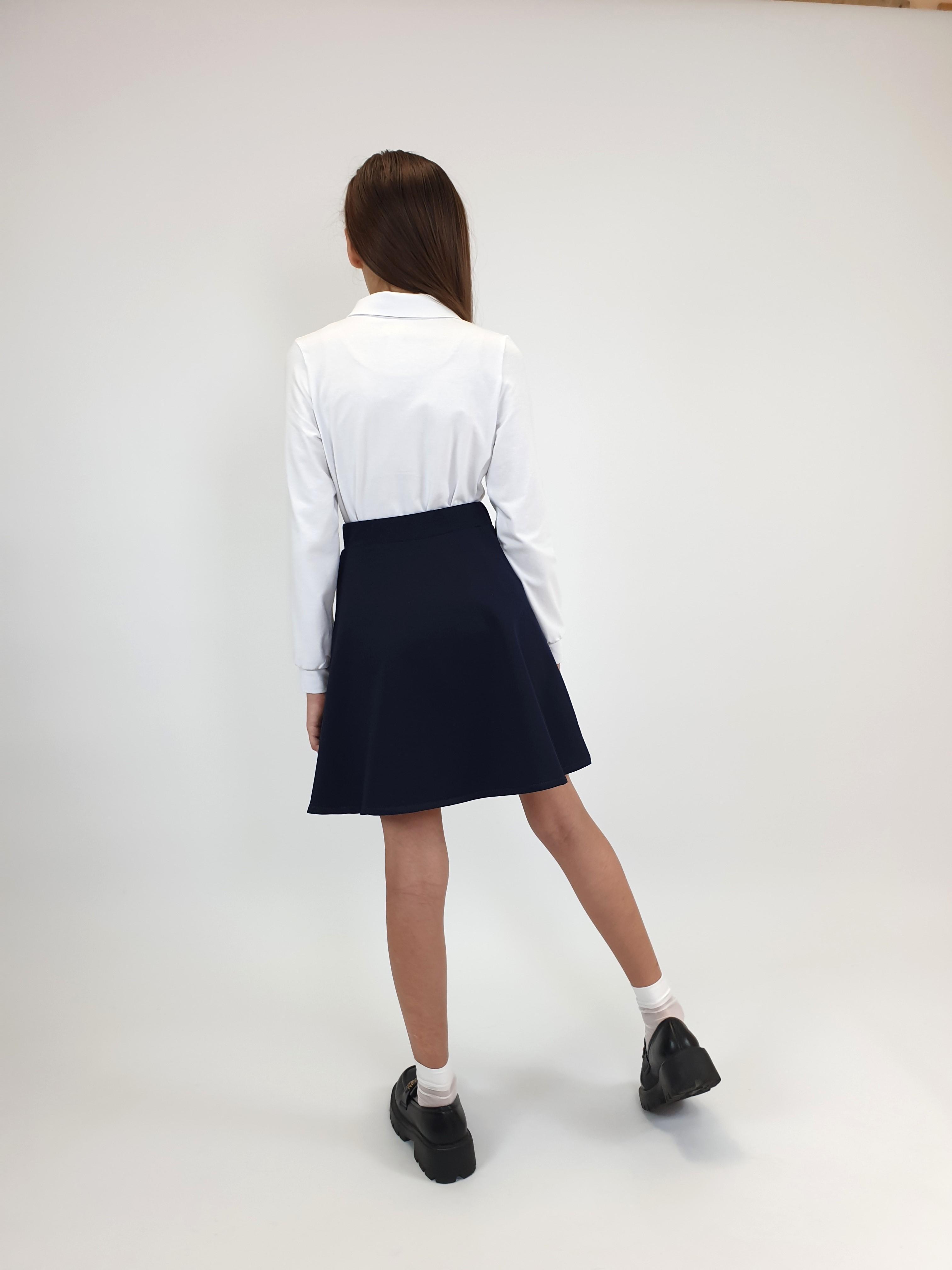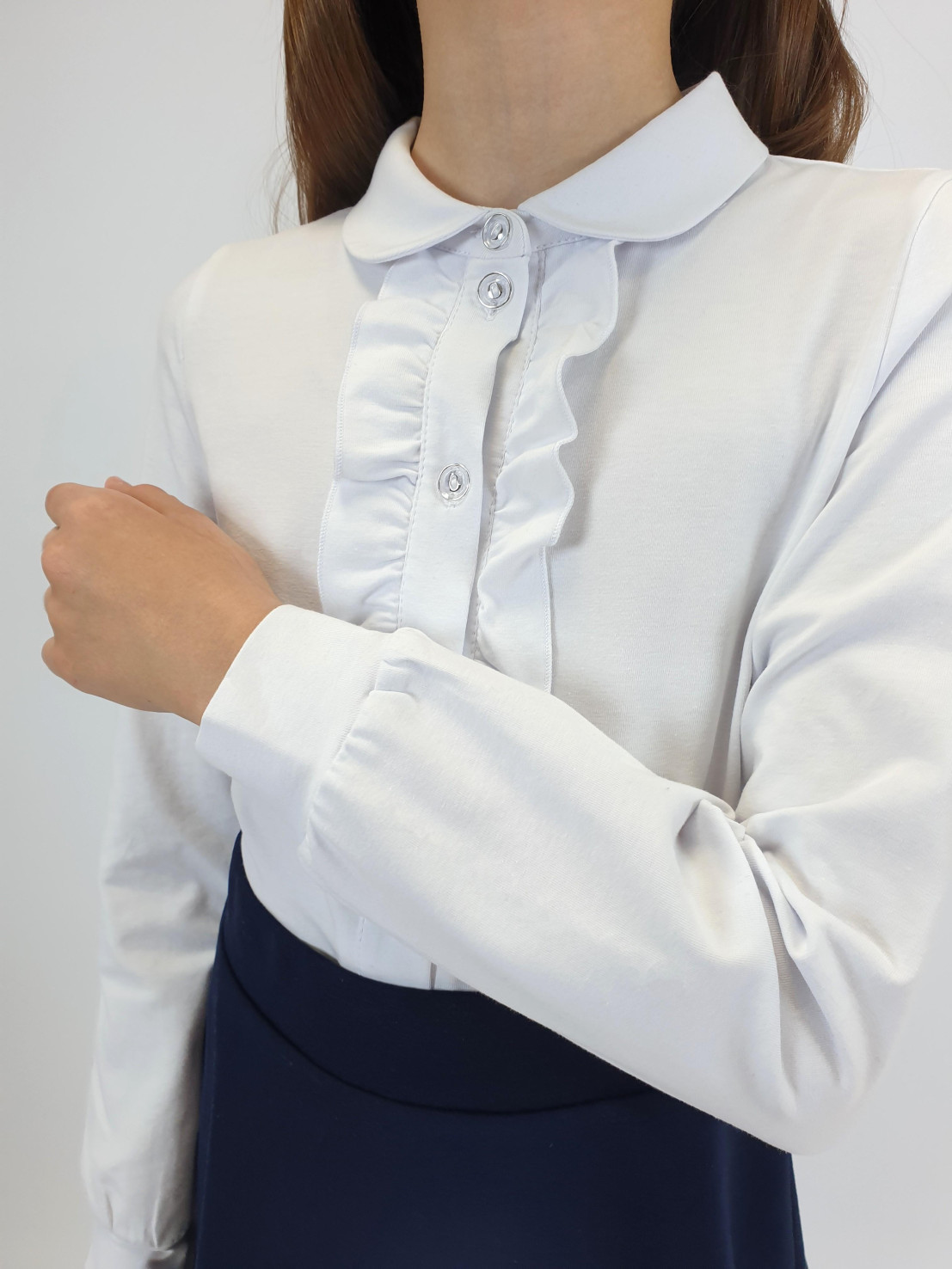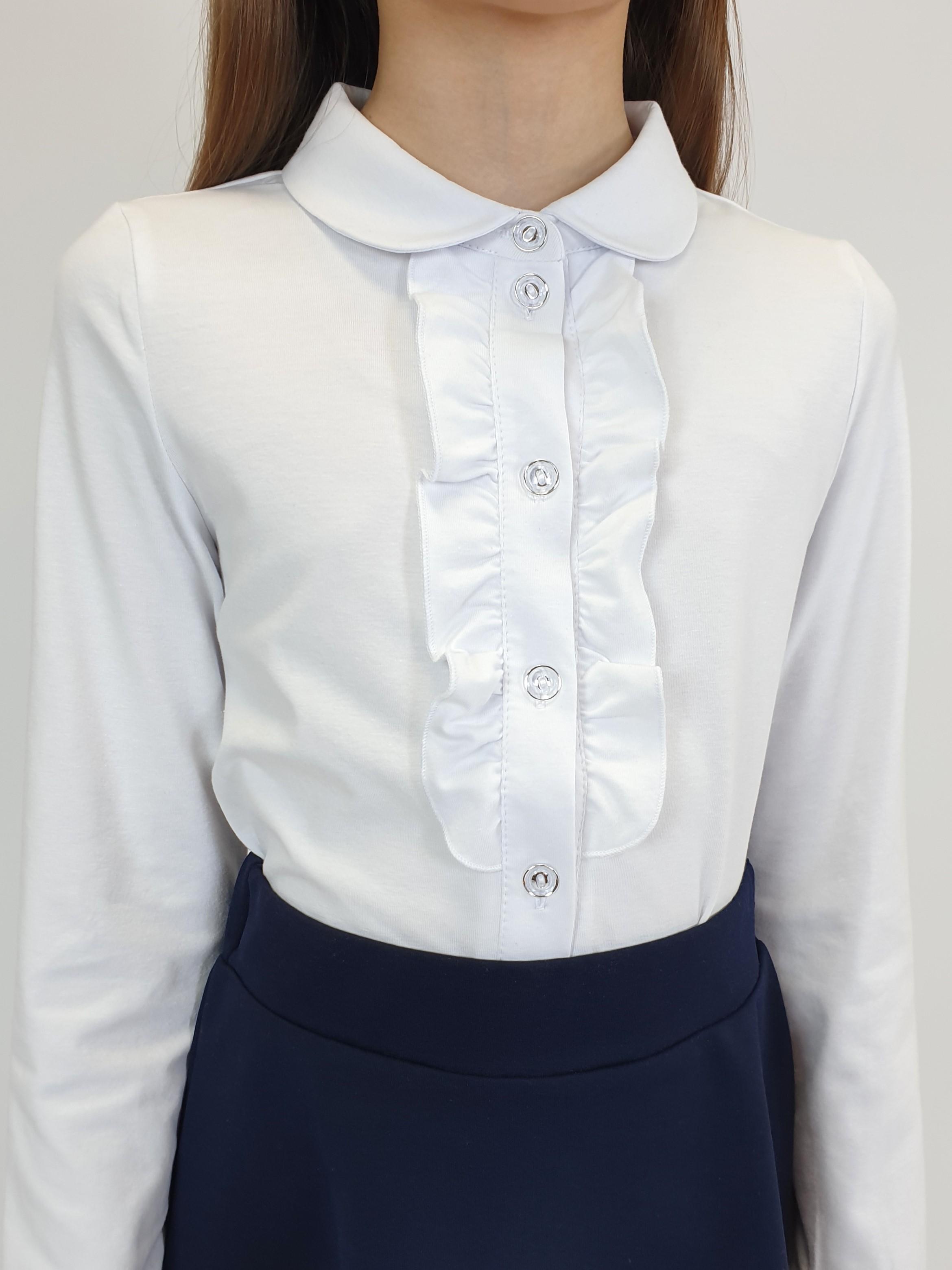 Кулирное полотно:95% х/б.,5% лайкра. Джемпер-прямой силуэт,длинный рукав,внизу на манжете.В горловине отложной воротник на стойке.Перед с планкой и рюшей,застежка центральная на пуговицы.