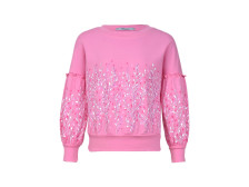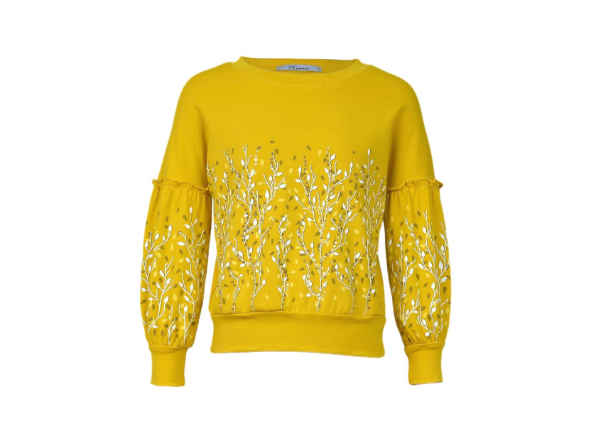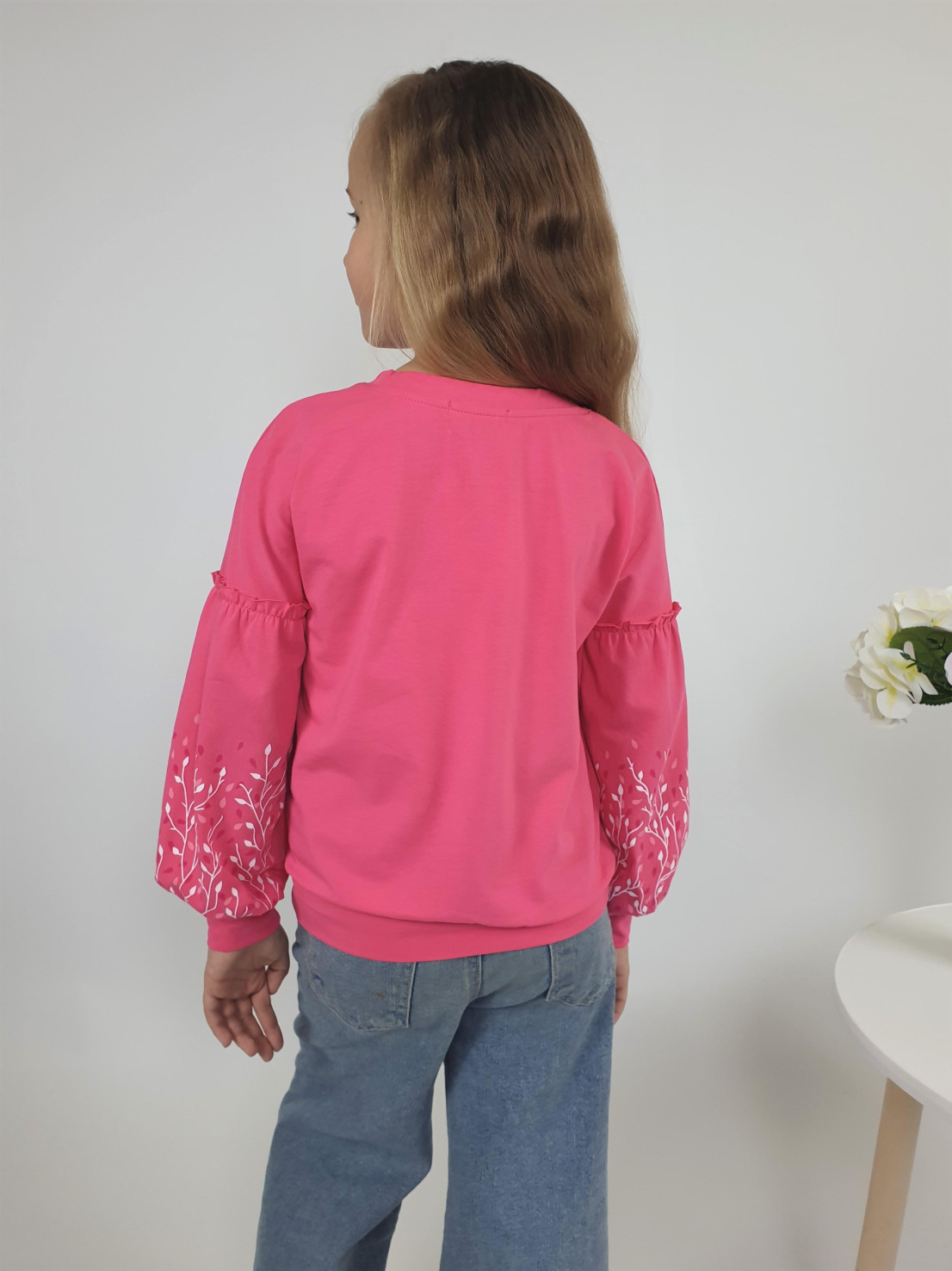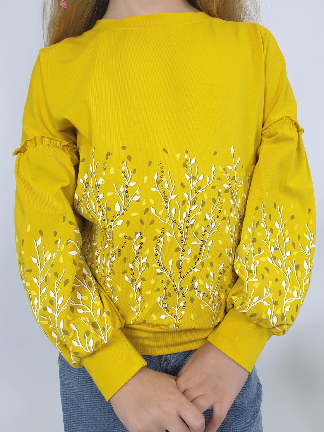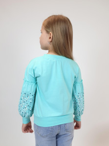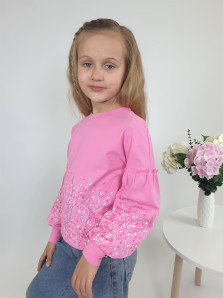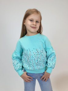 Кулирное полотно:95% х/б,5% лайкра. Джемпер-на поясе.Спущенное плечо,длинный рукав со сборкой,внизу на манжете.Перед и рукава с печатью.Вышивка(пайетки)на переде.Вырез горловины обработан планкой.