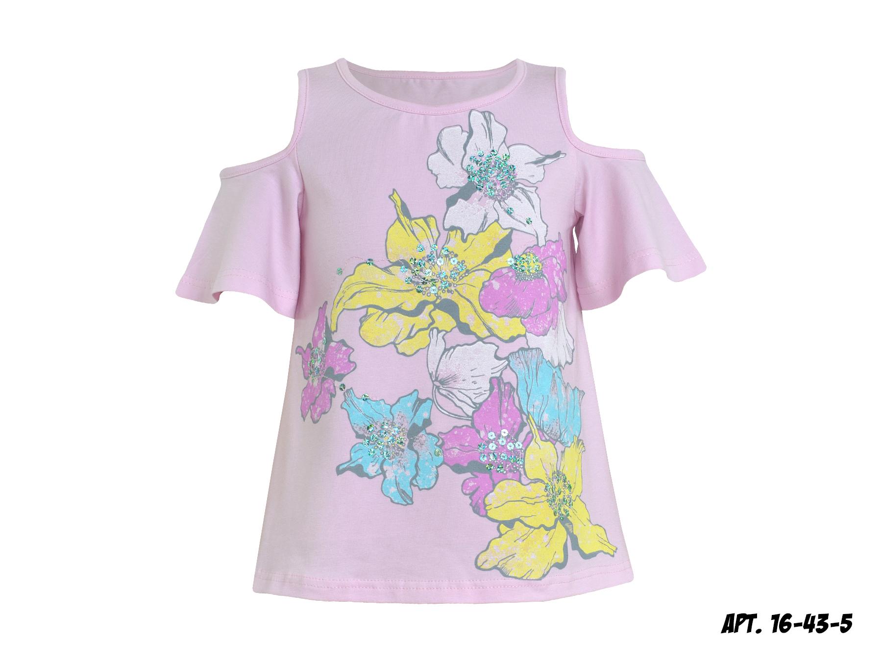 Футболка для девочки изготовлена из кулирного полотна ( 95% хлопок, 5% лайкра).Модель силуэта трапеция, декорирована оригинальным принтом с вышивкой. Рукав с вырезом на плече. Материал легкий, приятный на ощупь, устойчивый к частым стиркам.