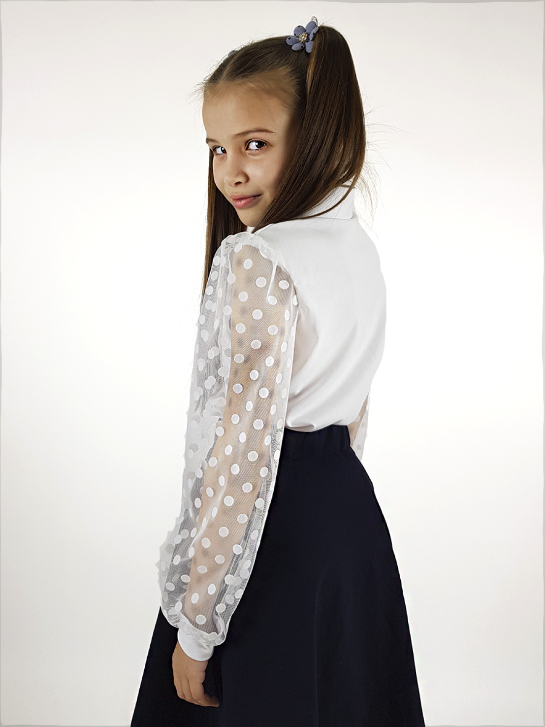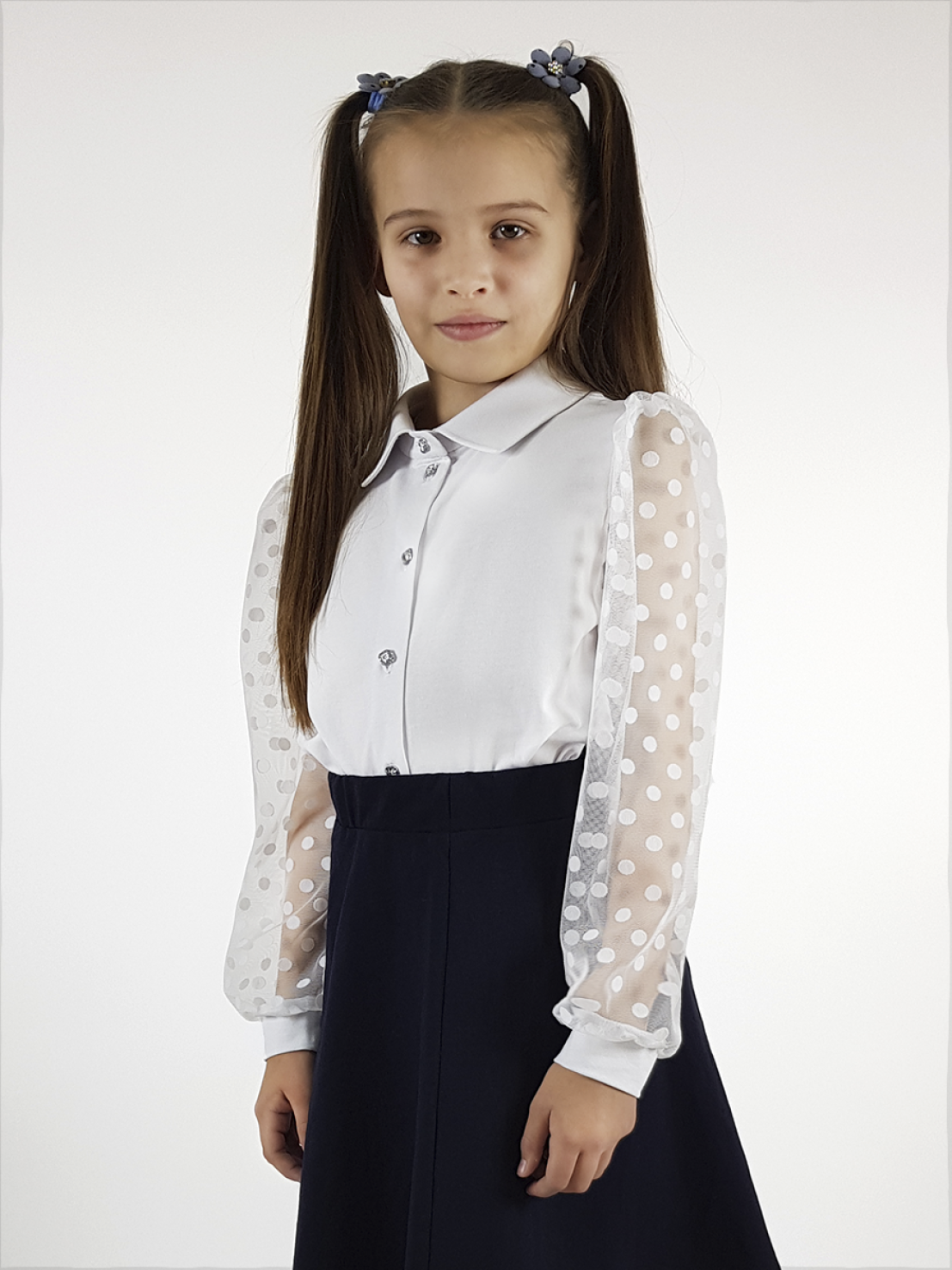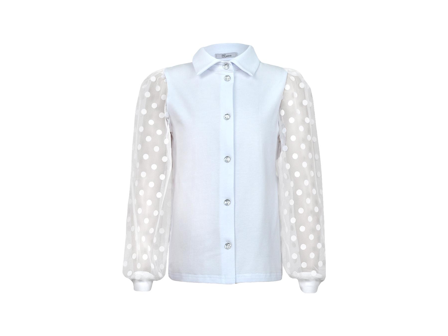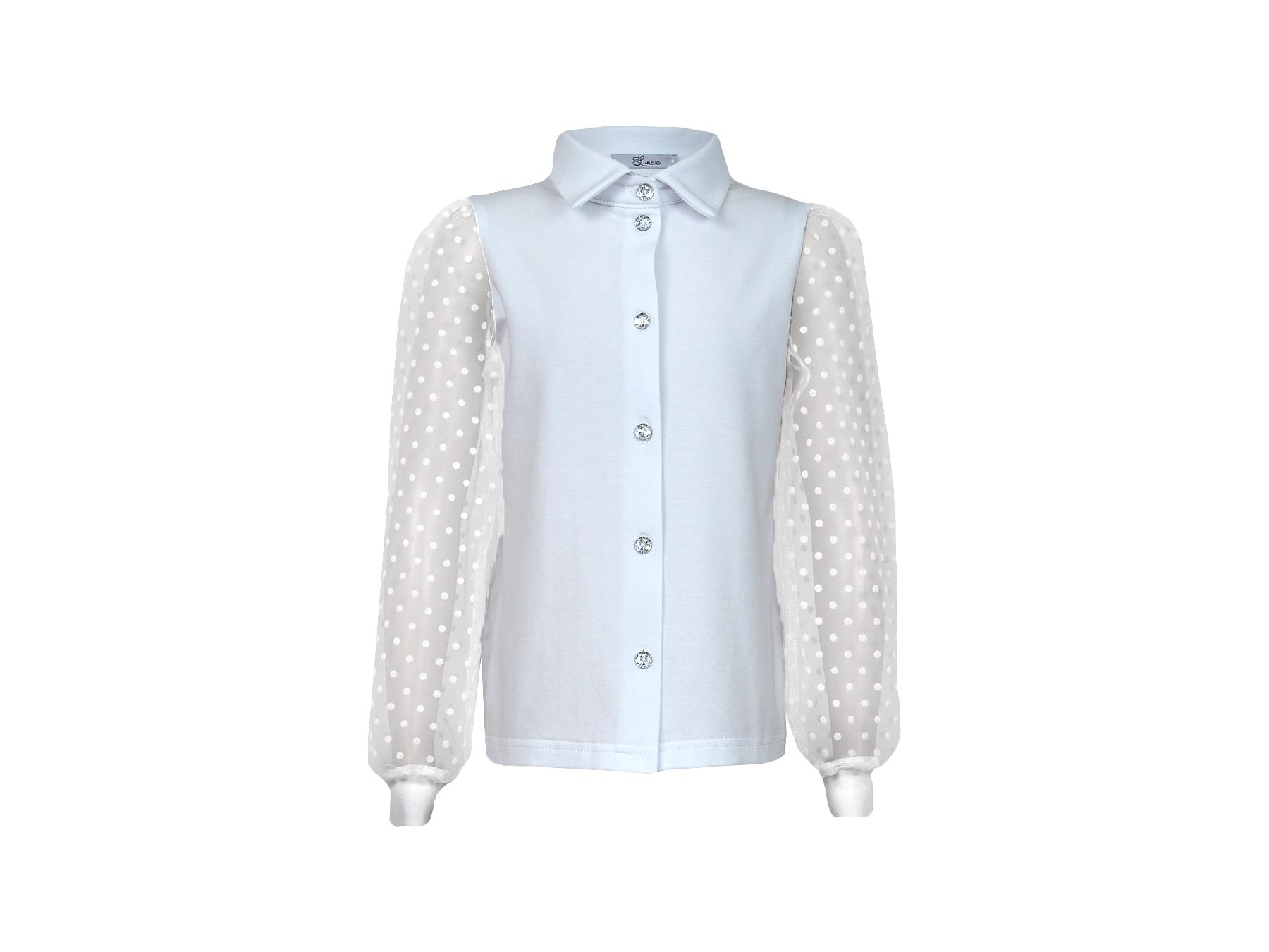 Кулирное полотно:95% х/б.,5% лайкра,сетка-горох (флок напыление):100% п/э. Джемпер-прямой силуэт,длинный рукав из сетки со сборкой по окату,внизу на манжете.В горловине отложной воротник на стойке,застежка центральная на пуговицы.