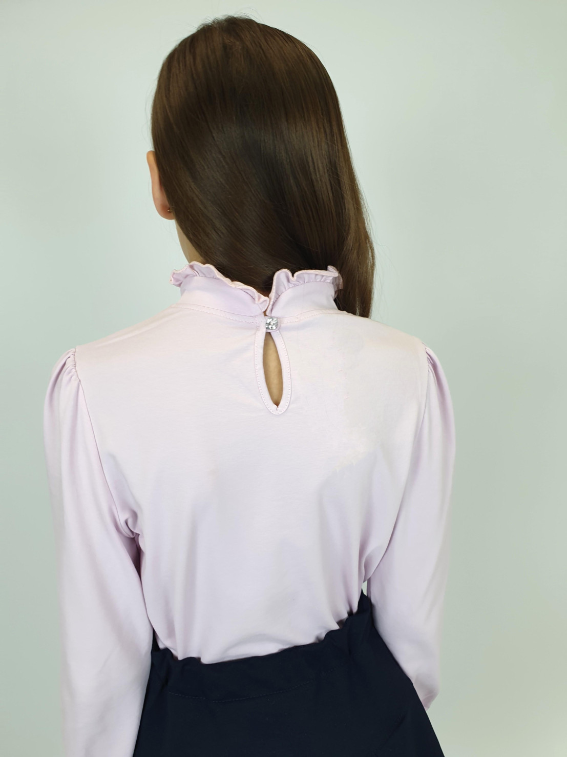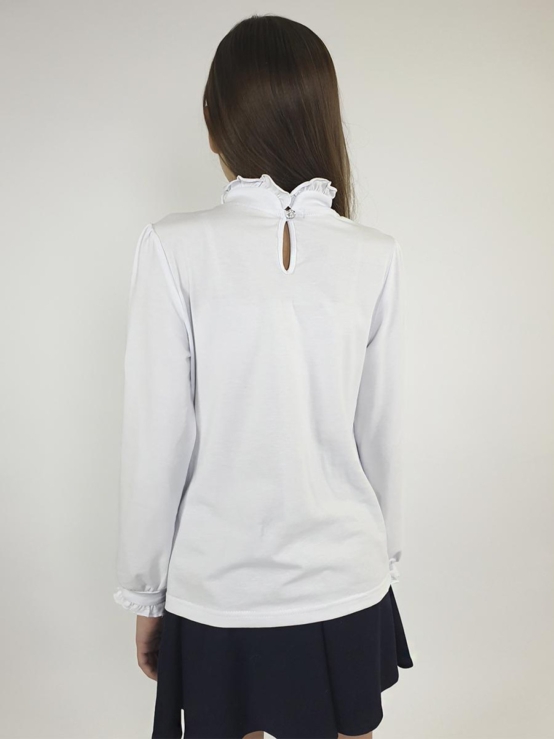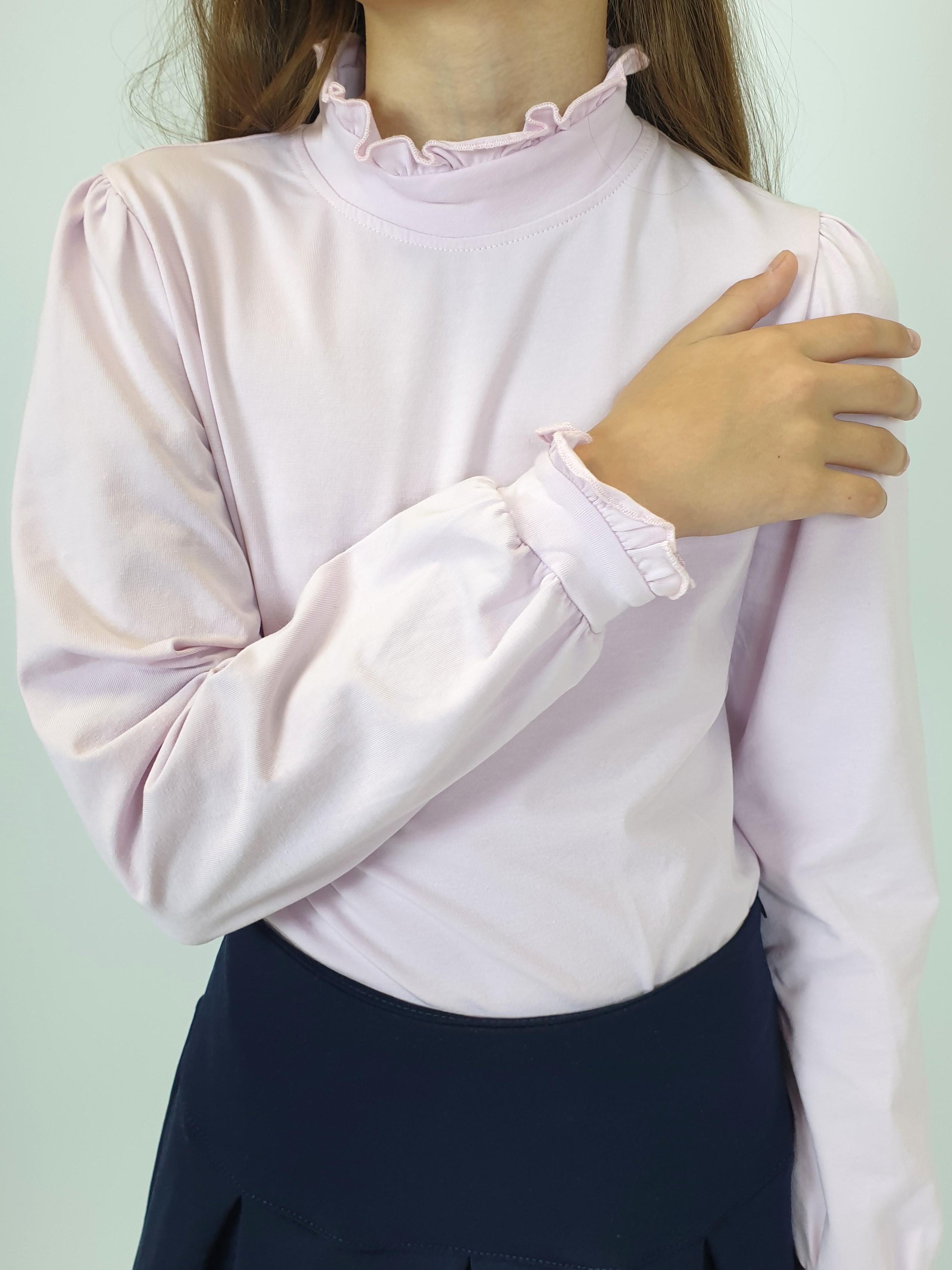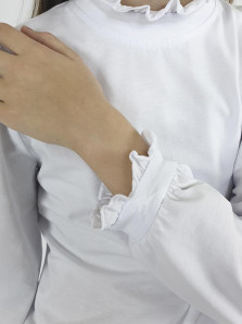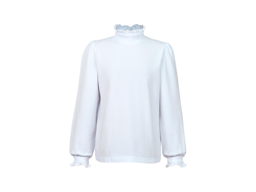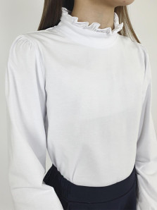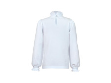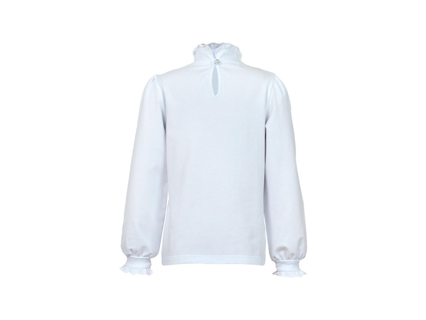 Кулирное полотно:95% х/б.,5% лайкра. Джемпер-прямой силуэт,длинный рукав со сборкой по окату и внизу,на манжете с рюшей.В горловине стойка с рюшей,застежка "капелька"на спинке с пуговицей.