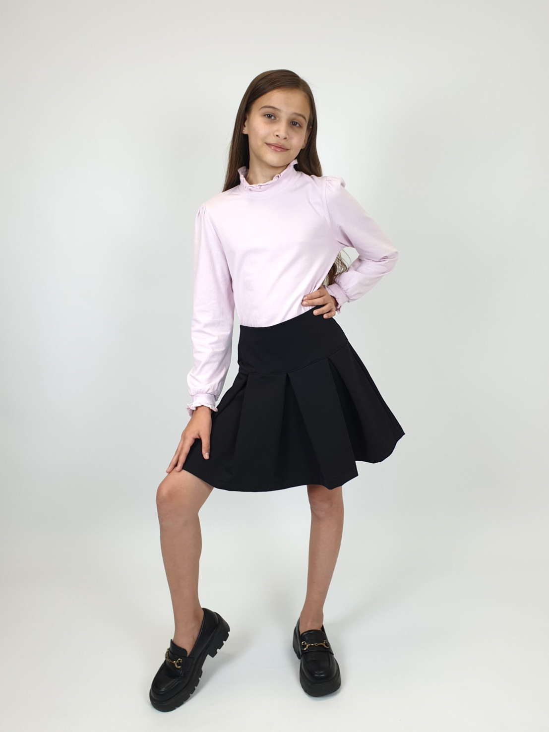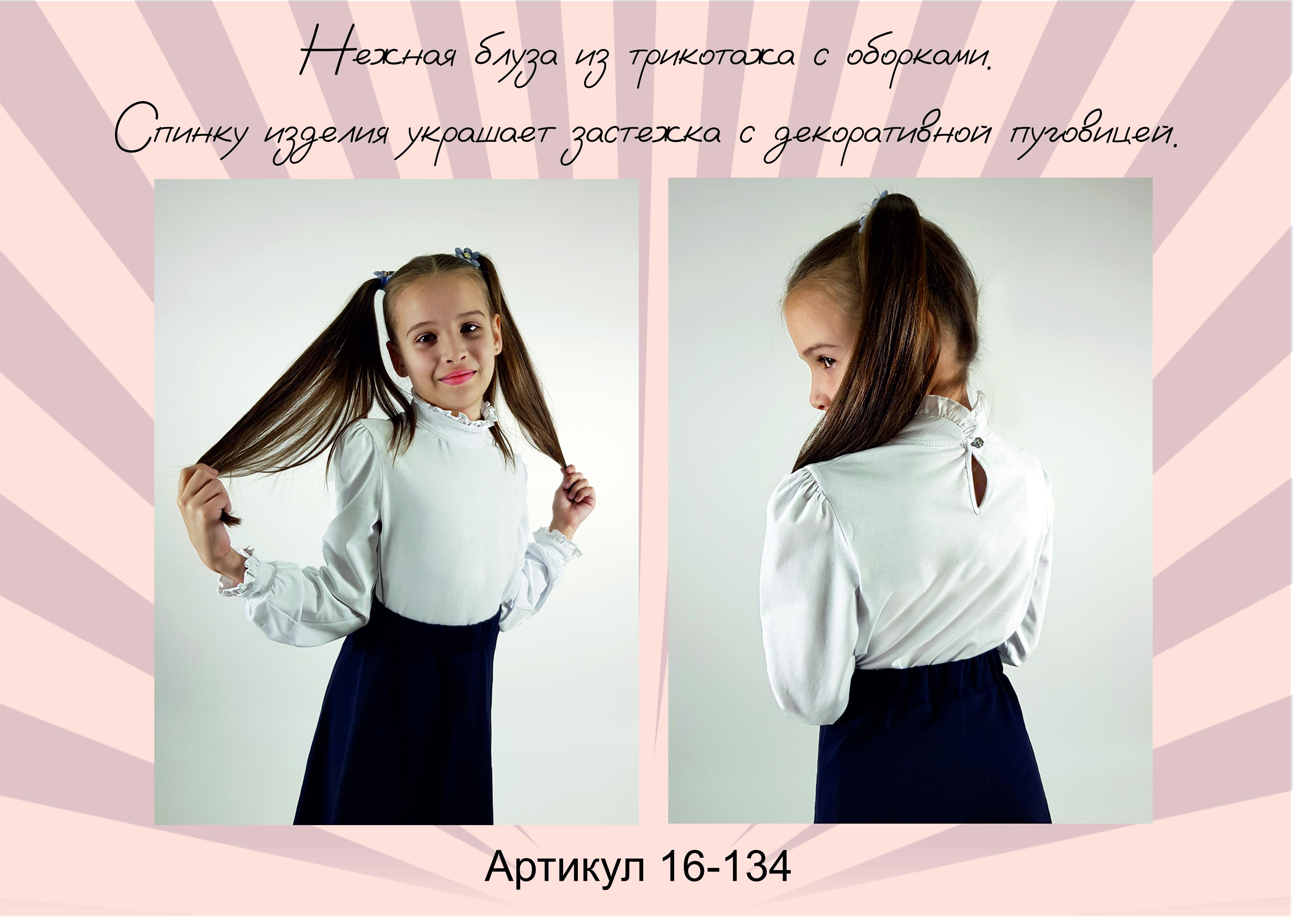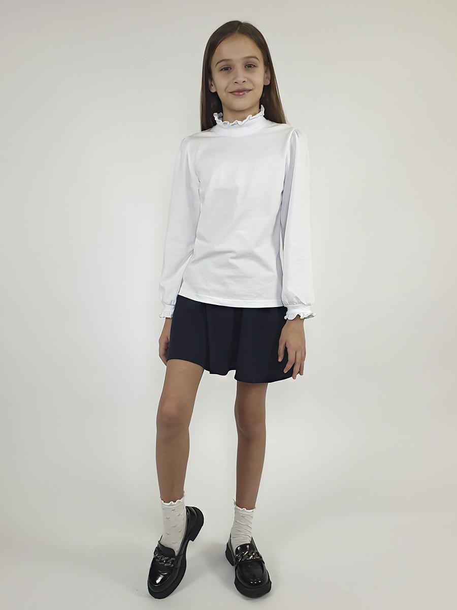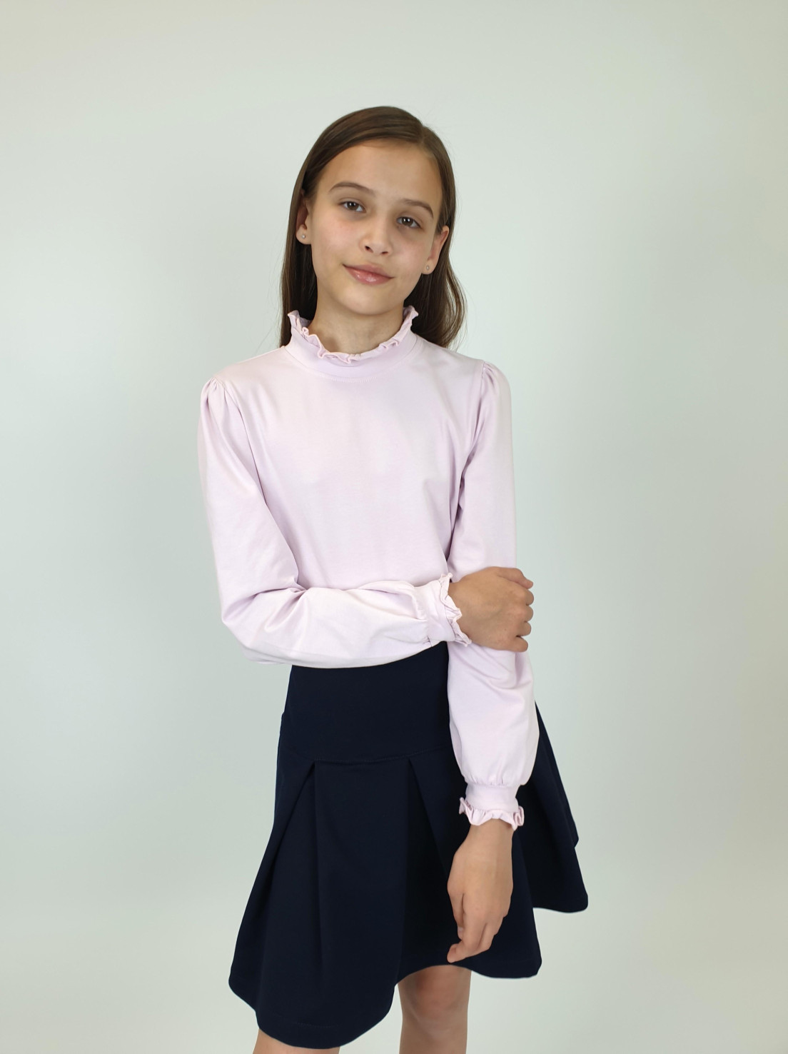 Кулирное полотно:95% х/б.,5% лайкра. Джемпер-прямой силуэт,длинный рукав со сборкой по окату и внизу,на манжете с рюшей.В горловине стойка с рюшей,застежка "капелька"на спинке с пуговицей.