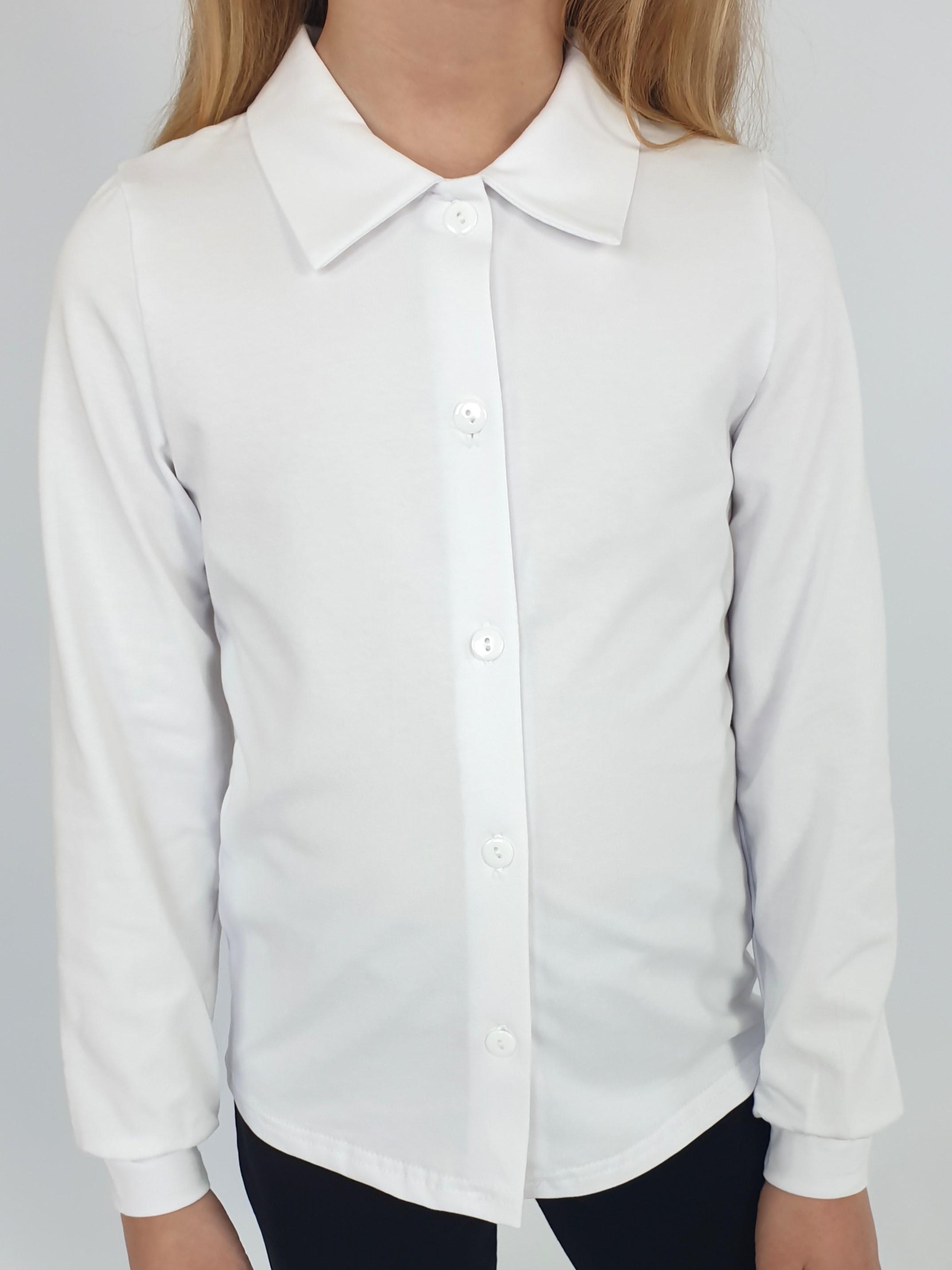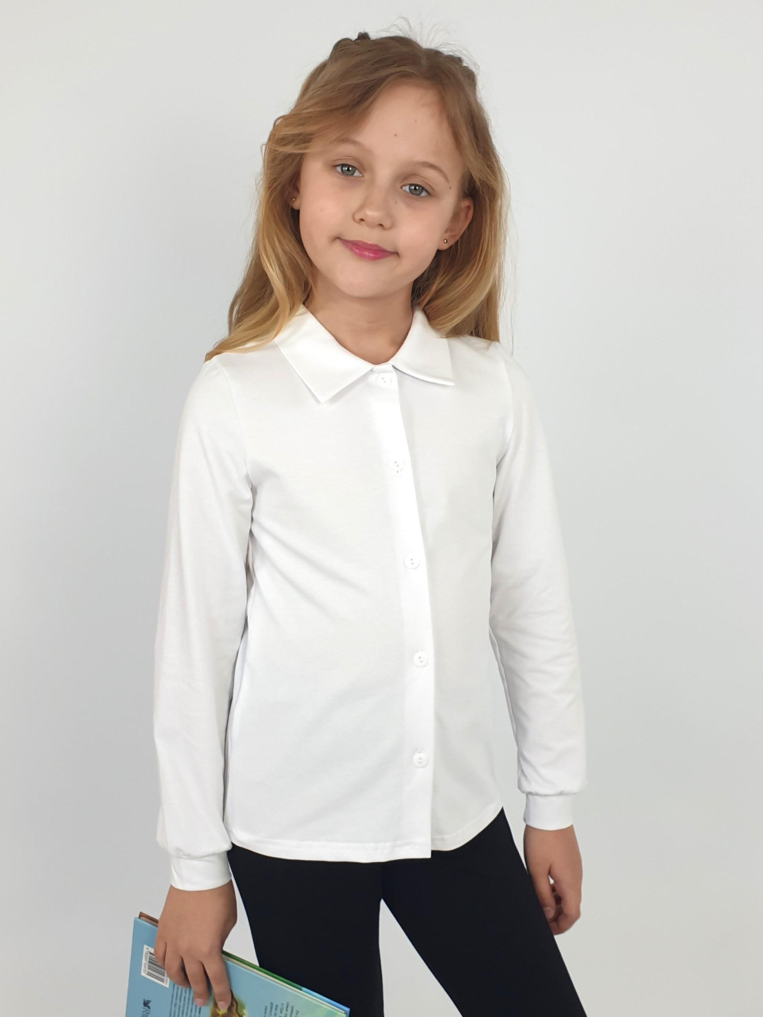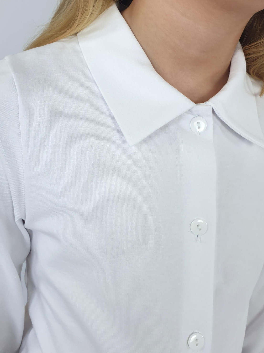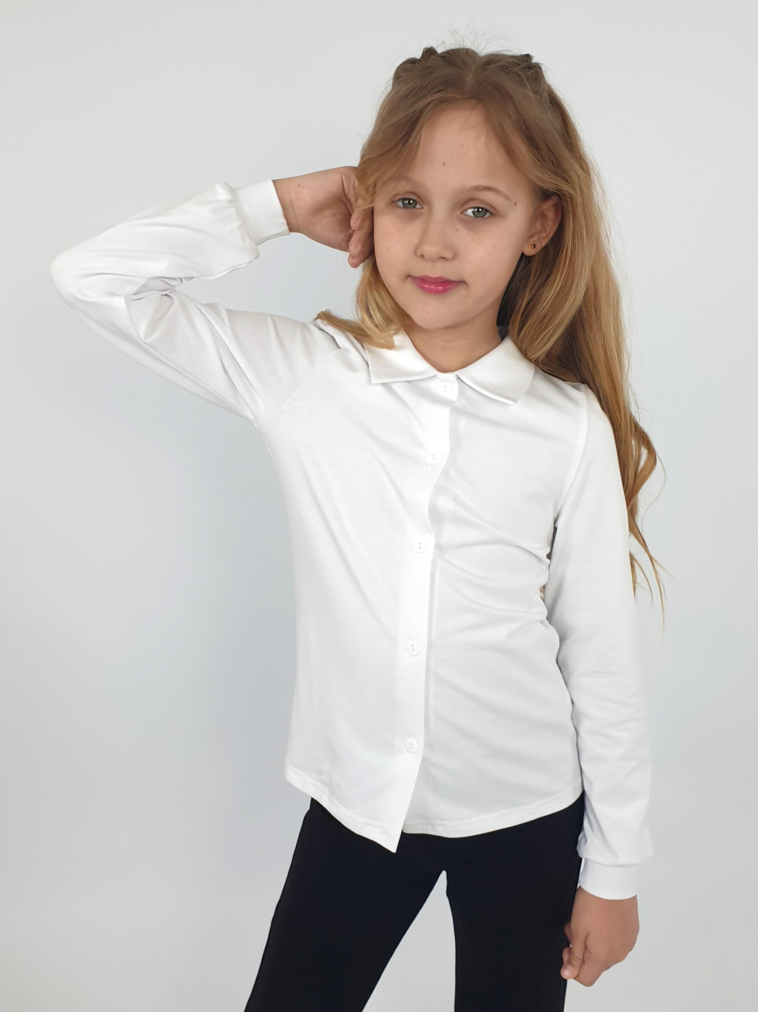 Кулирное полотно:95% х/б.,5% лайкра. Джемпер-прямой силуэт,длинный рукав,внизу на манжете.В горловине отложной воротник,застежка центральная на пуговицы.