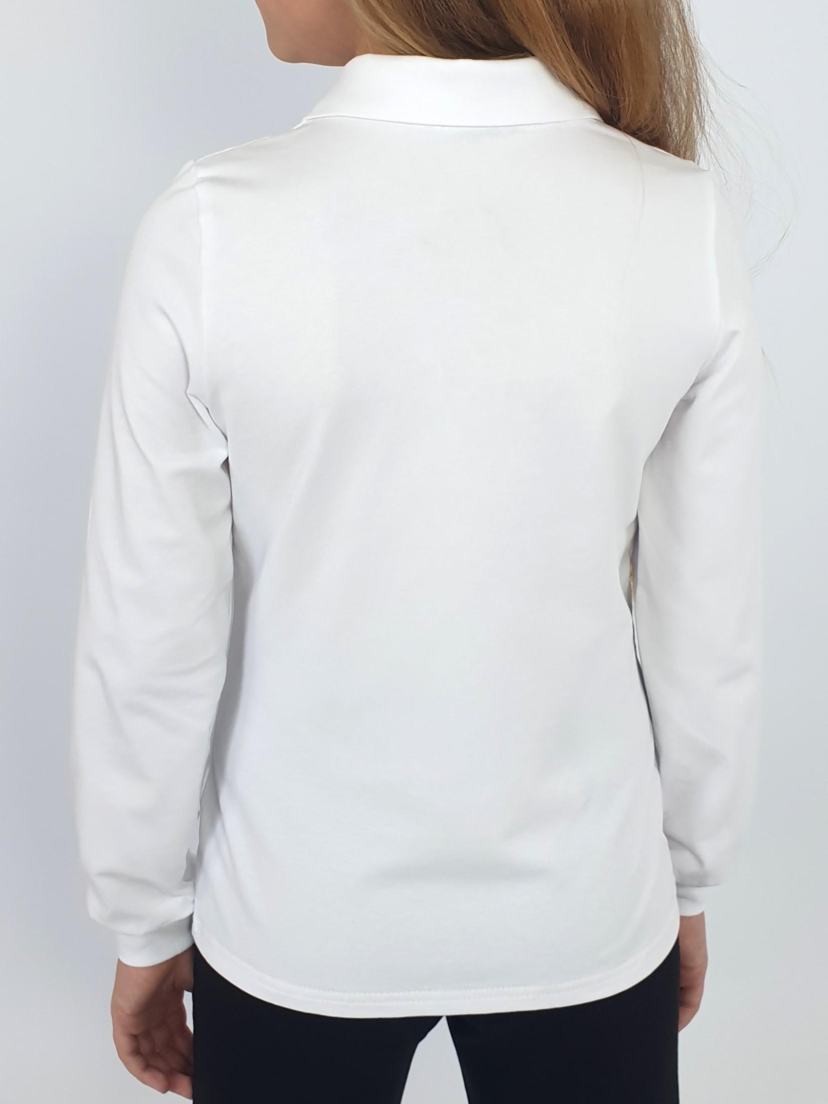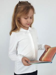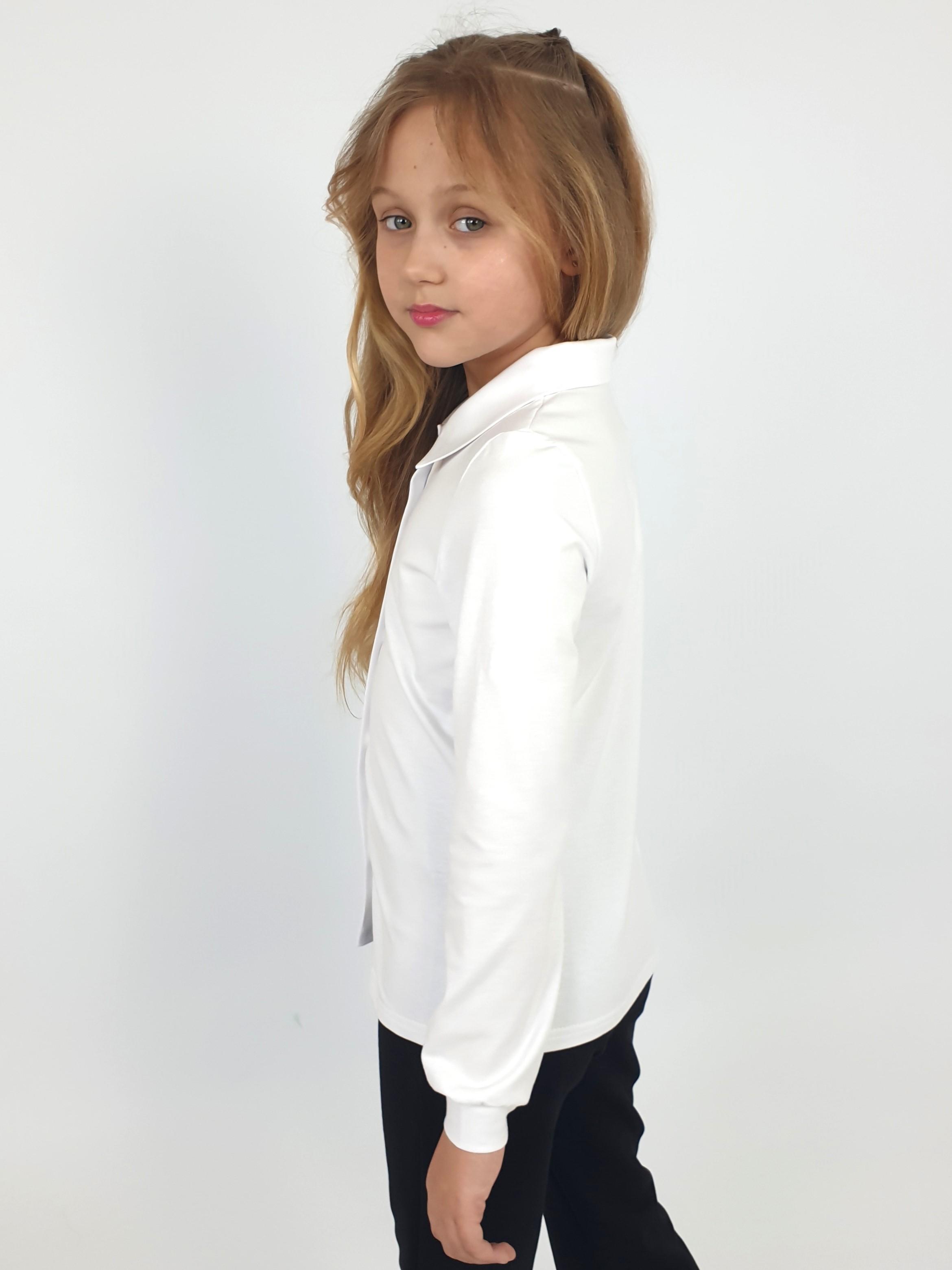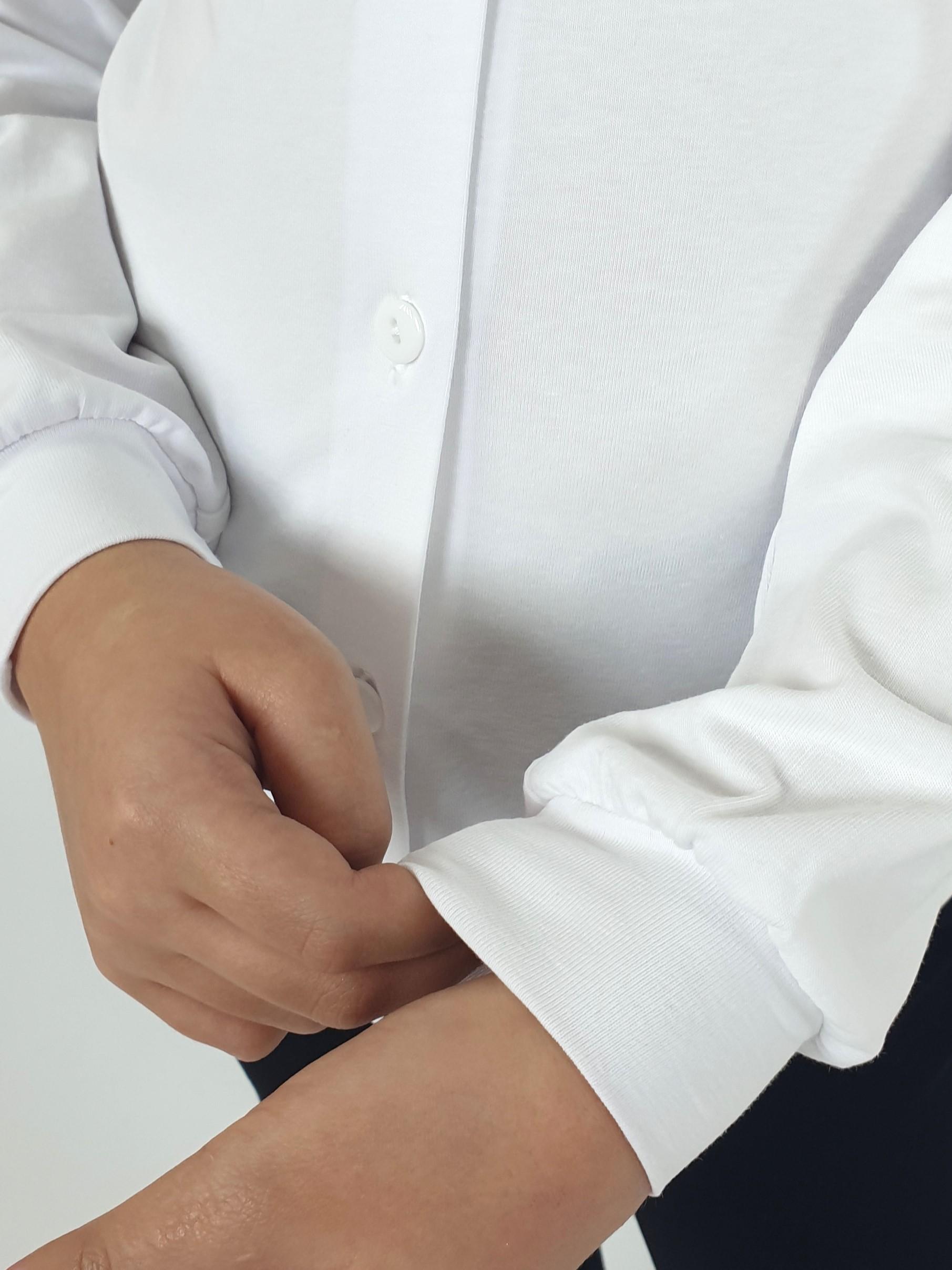 Кулирное полотно:95% х/б.,5% лайкра. Джемпер-прямой силуэт,длинный рукав,внизу на манжете.В горловине отложной воротник,застежка центральная на пуговицы.