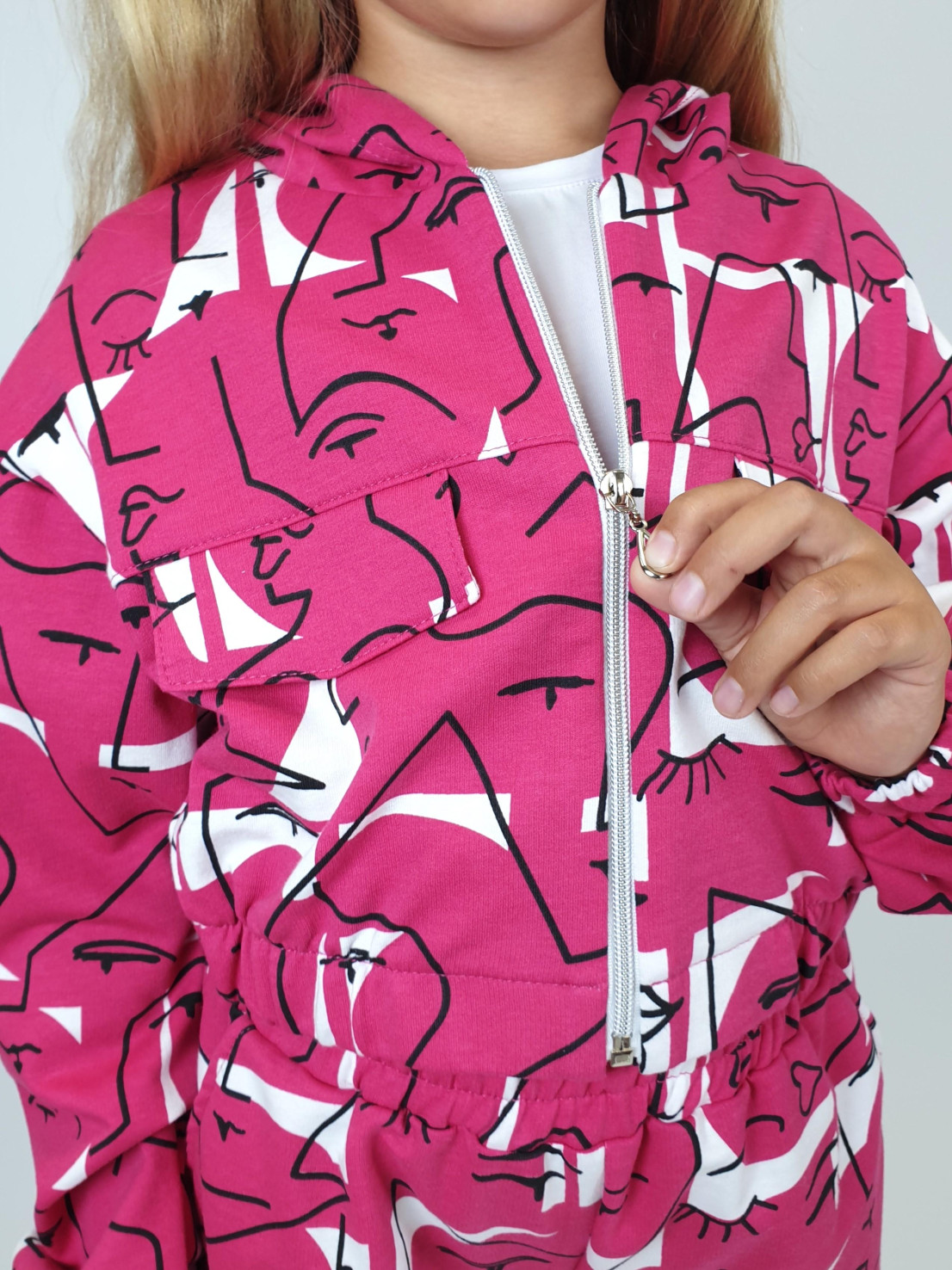 Футер 2-нитка:75% х/б,25% п/э. Джемпер-укороченный,спущенное плечо,центральная застежка на "молнию".Рукав и низ изделия на резинке.В горловине капюшон.Перед с кокеткой и отделочными клапанами.