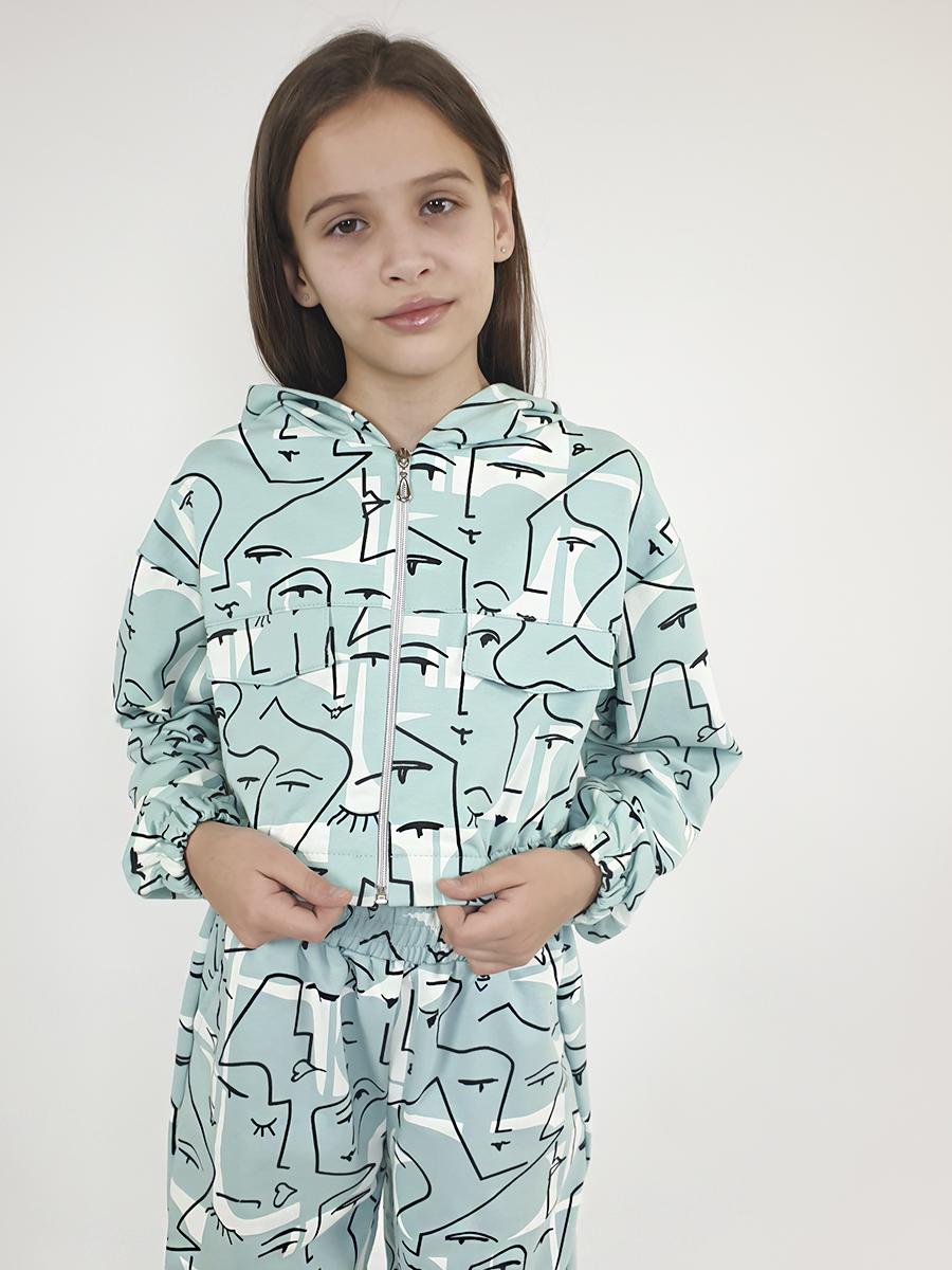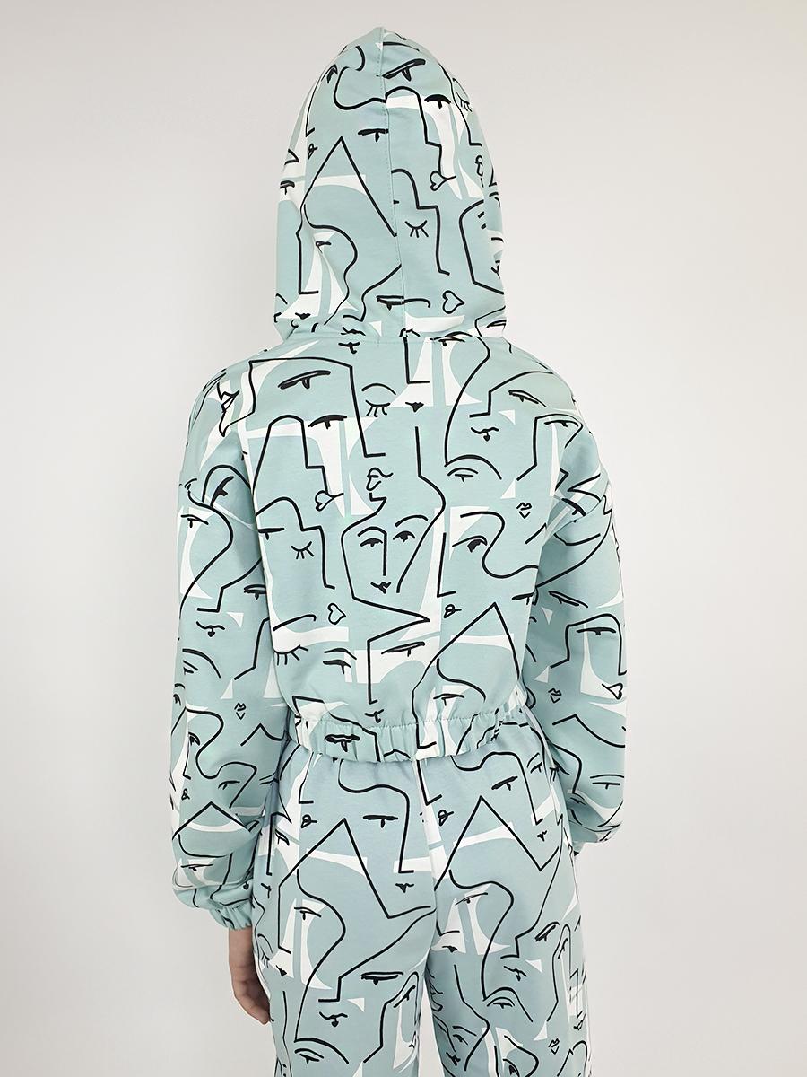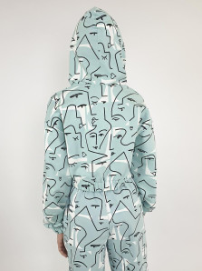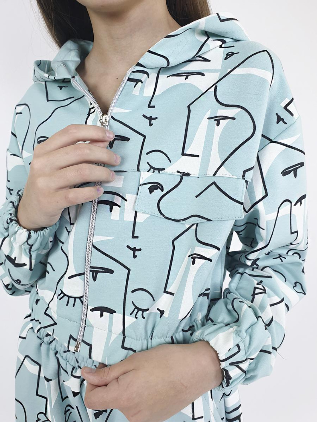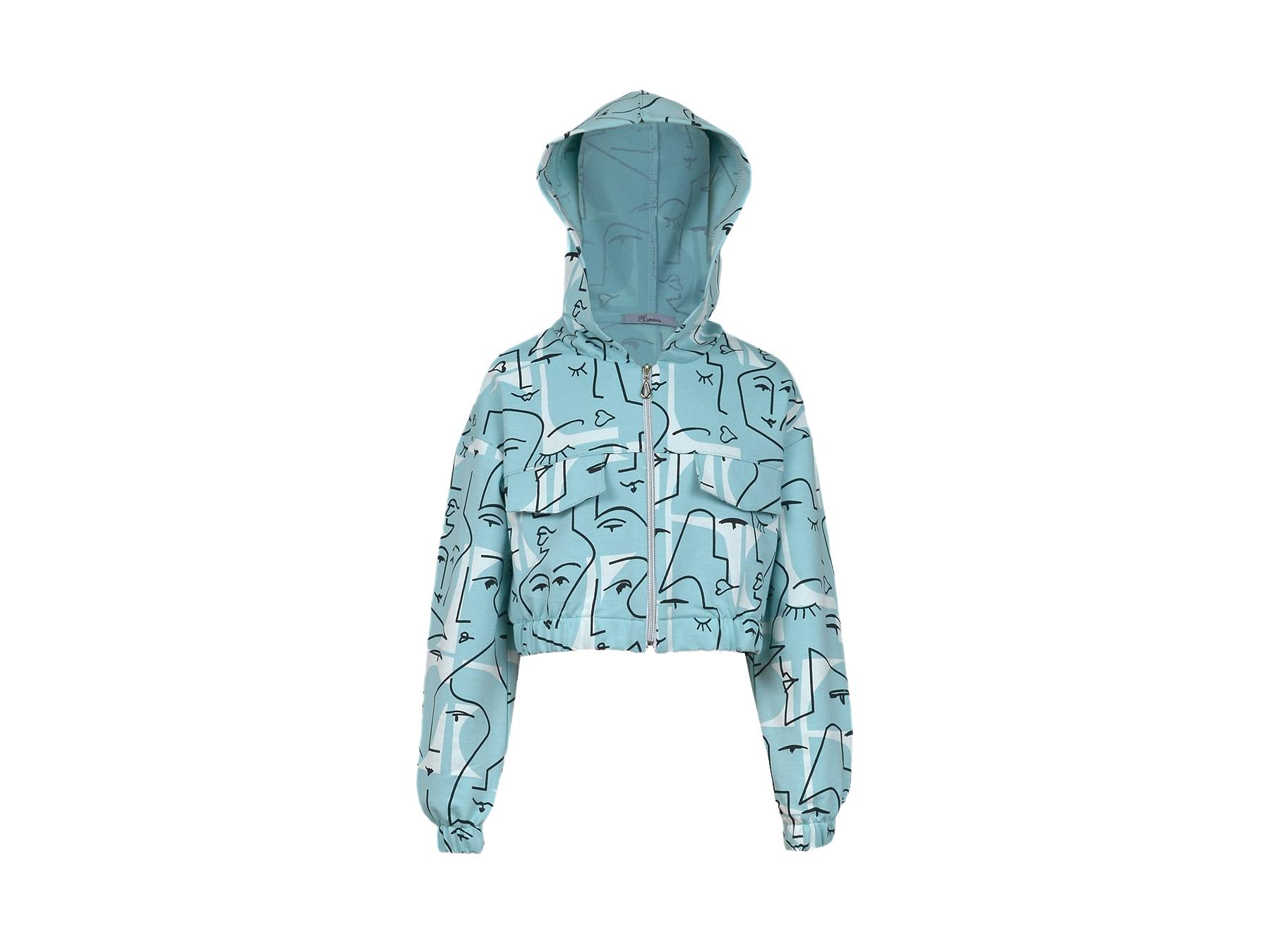 Футер 2-нитка:75% х/б,25% п/э. Джемпер-укороченный,спущенное плечо,центральная застежка на "молнию".Рукав и низ изделия на резинке.В горловине капюшон.Перед с кокеткой и отделочными клапанами.