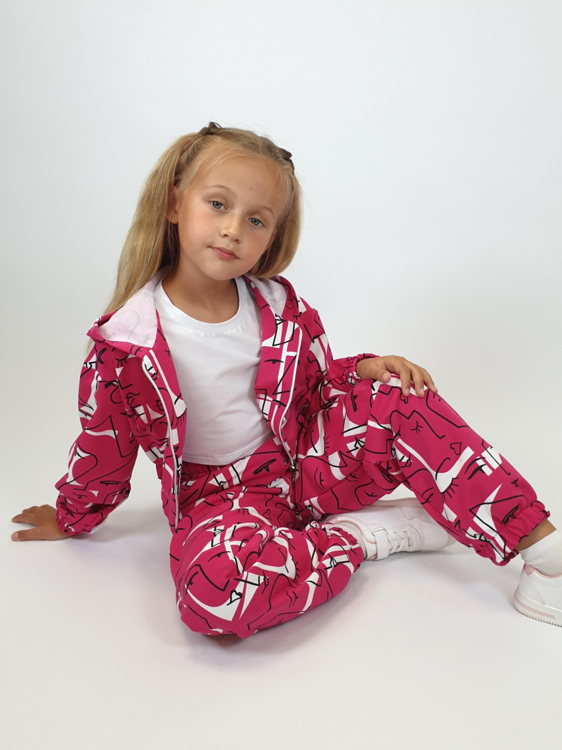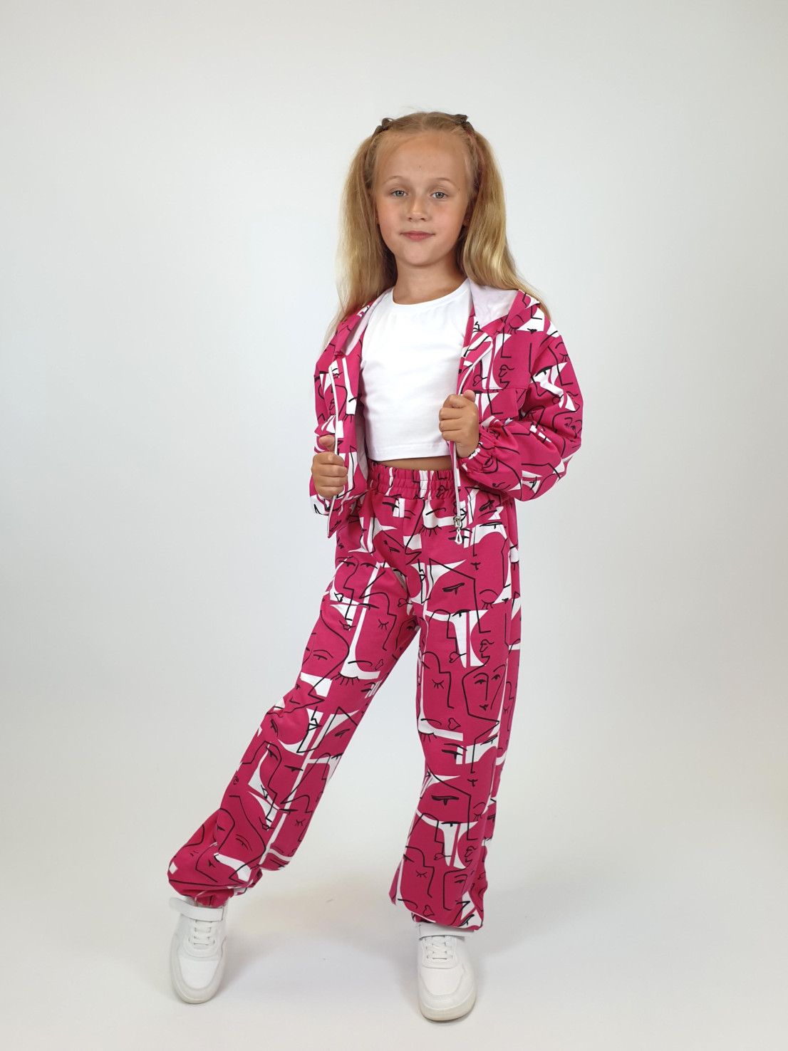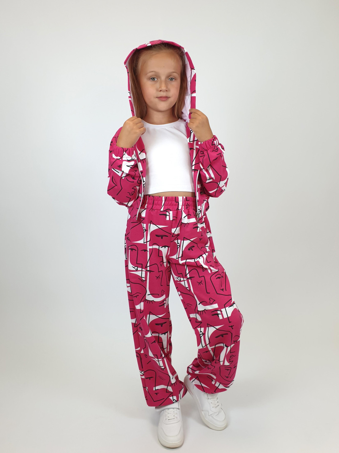 Футер 2-нитка:75% х/б,25% п/э. Джемпер-укороченный,спущенное плечо,центральная застежка на "молнию".Рукав и низ изделия на резинке.В горловине капюшон.Перед с кокеткой и отделочными клапанами.