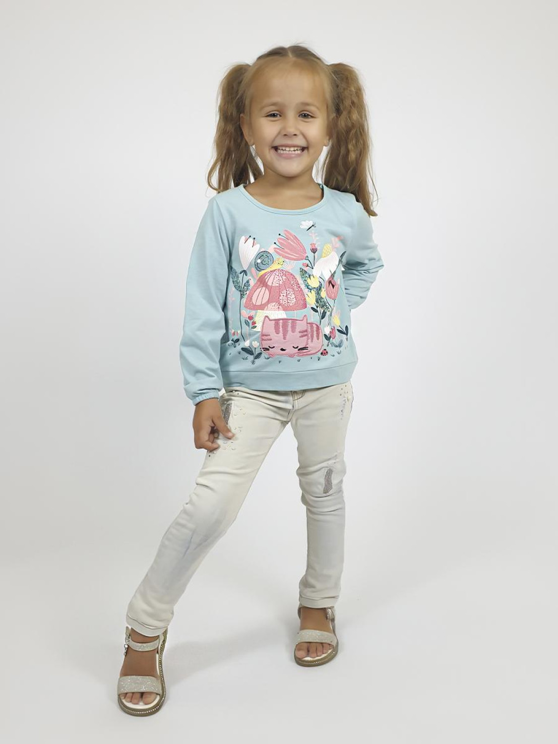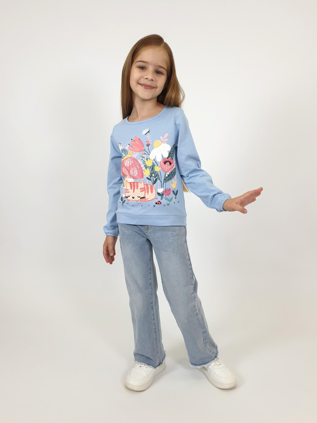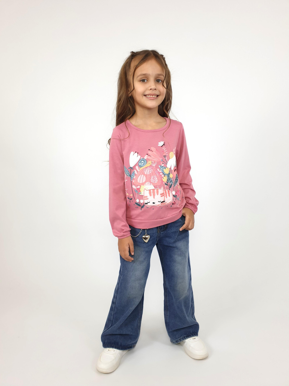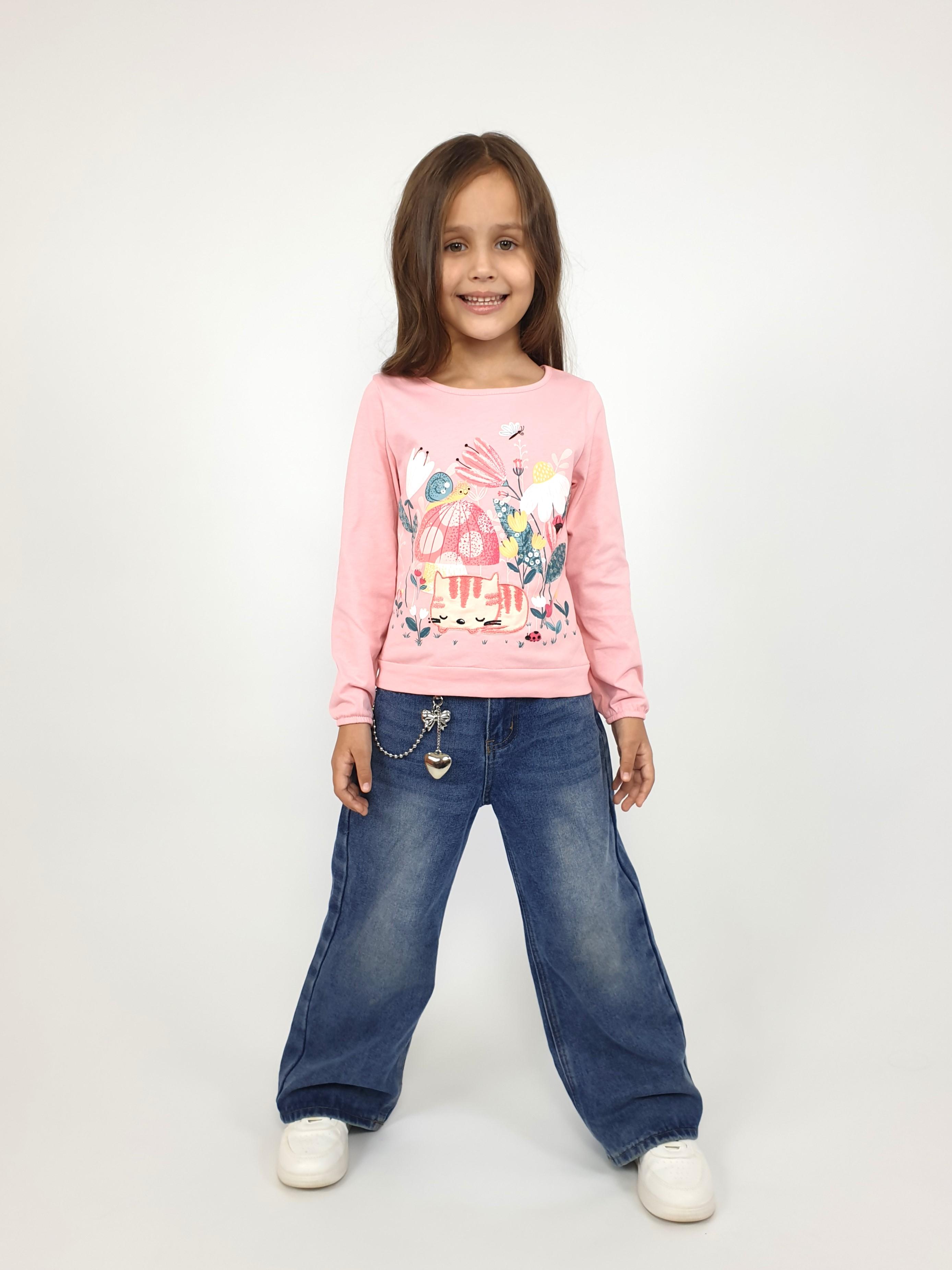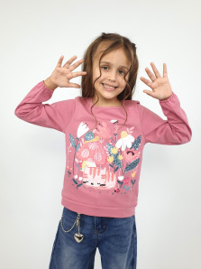 Кулирное полотно:100% х/б. Джемпер-прямого силуэта,на поясе.Печать на переде и вышивка(пайетки) с апликацией,втачной длинный рукав на резинке.Горловина окантована.