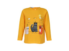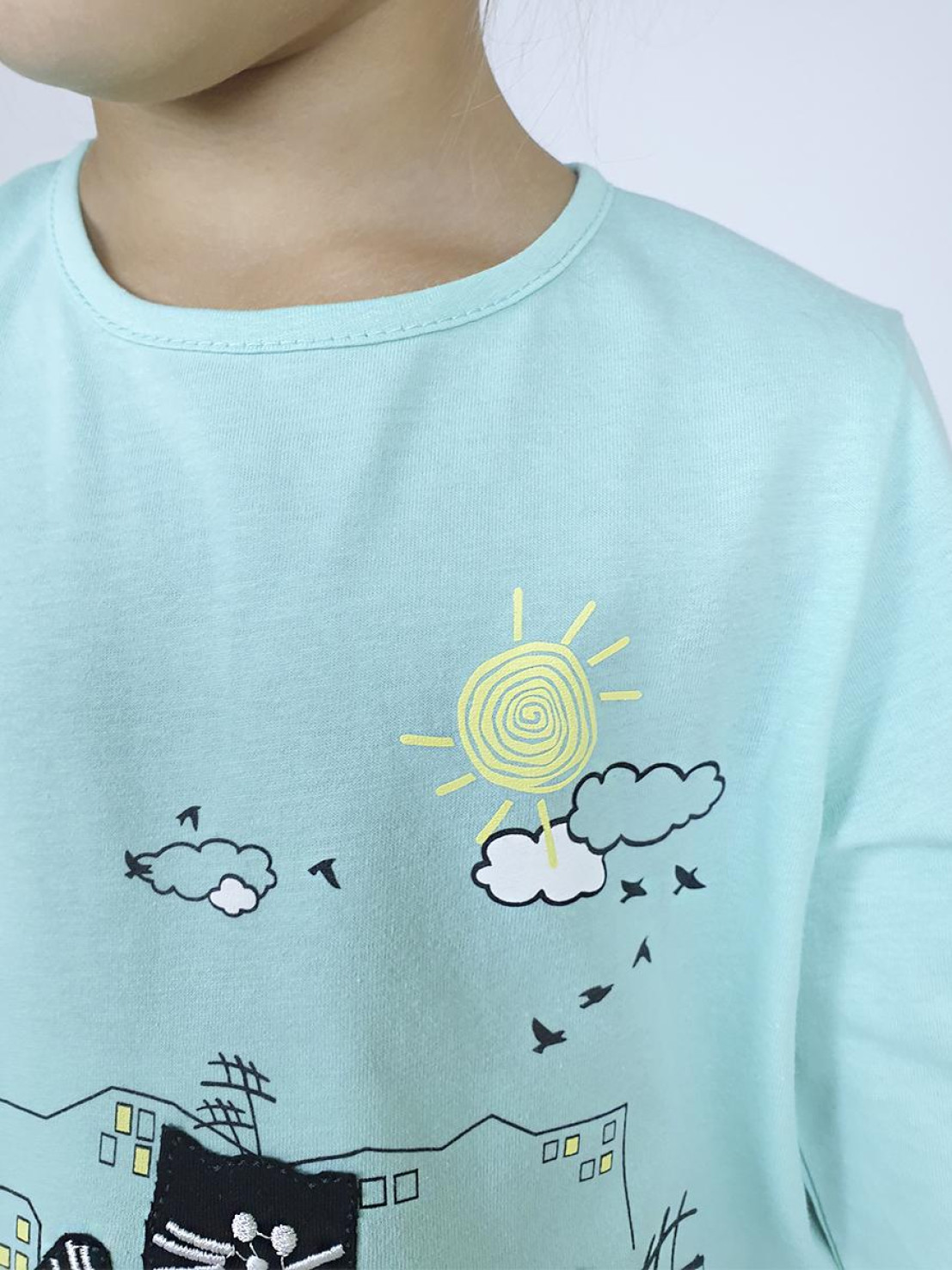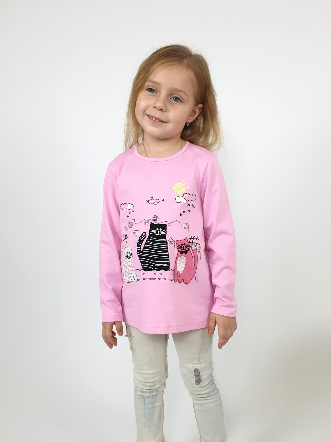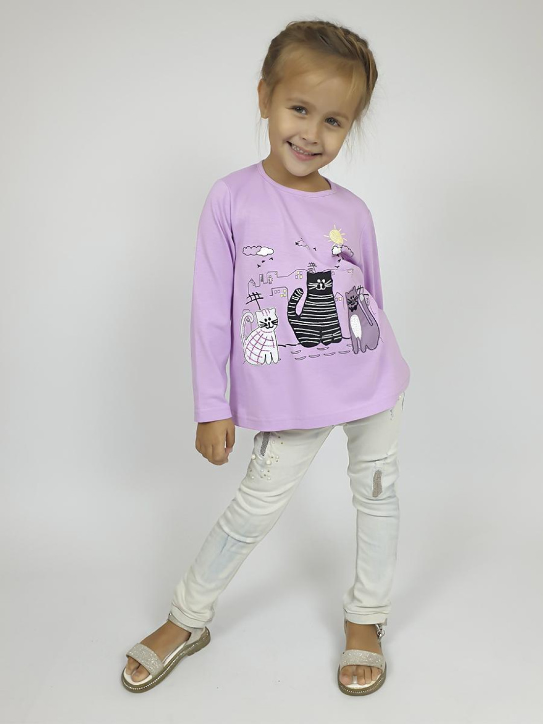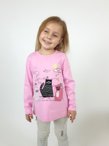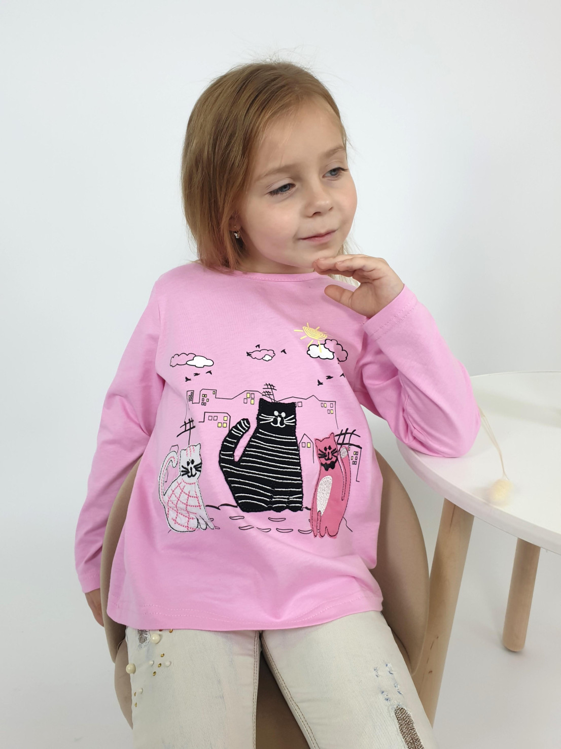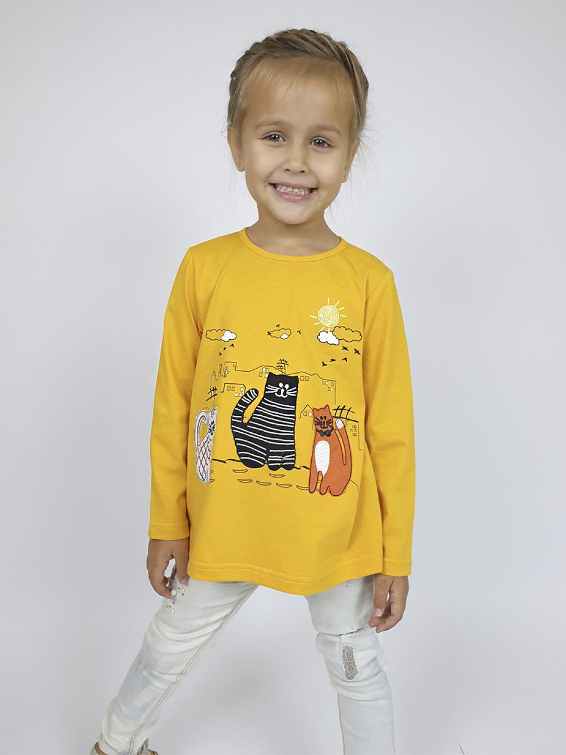 Кулирное полотно:100% х/б. Джемпер-силуэт трапеция,длинный втачной рукав.Горловина окантована,застежка на пуговицу по спинке.Печать на переде и вышивка(аппликация).