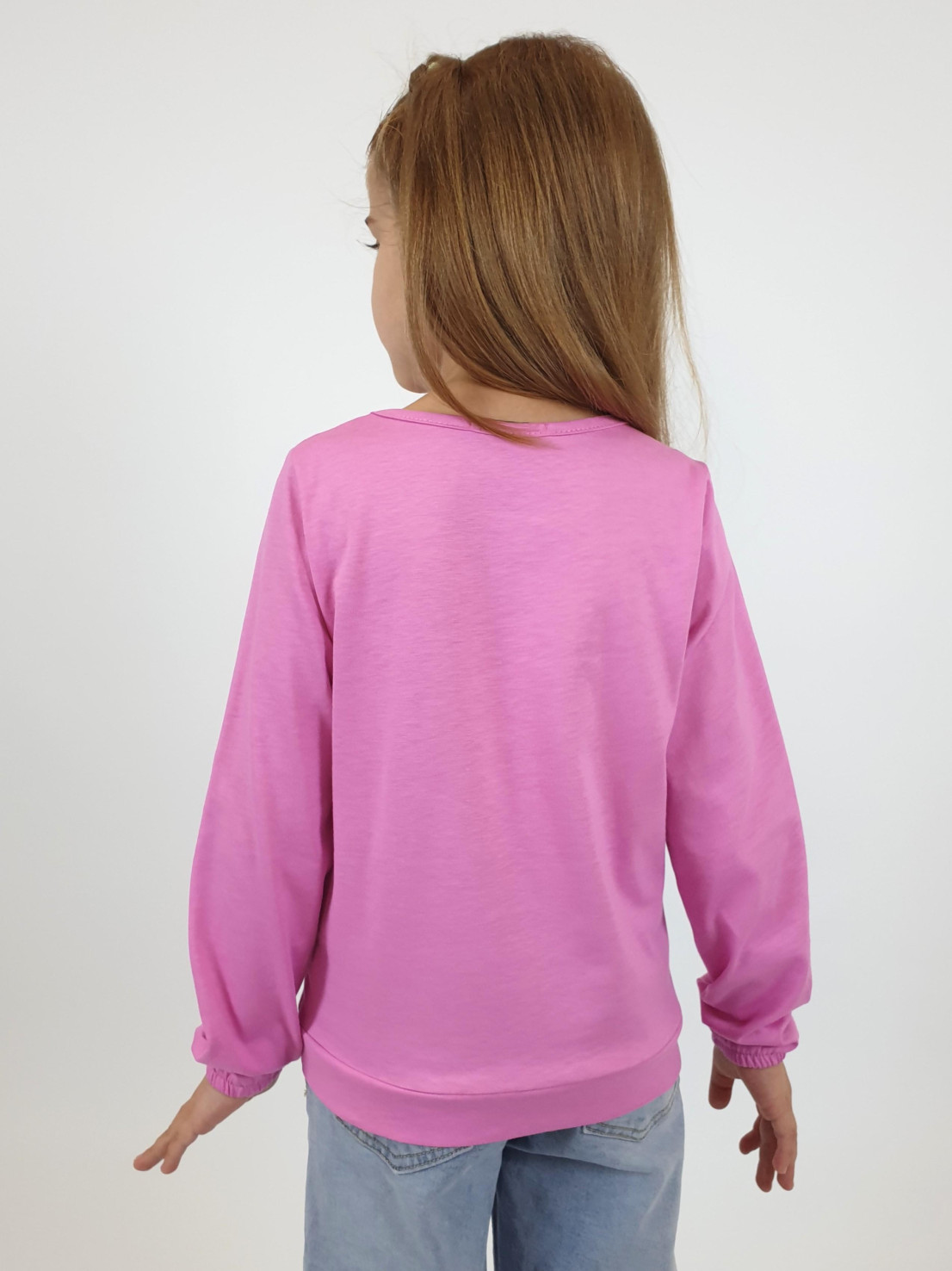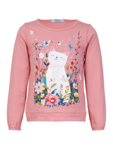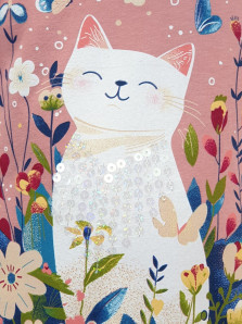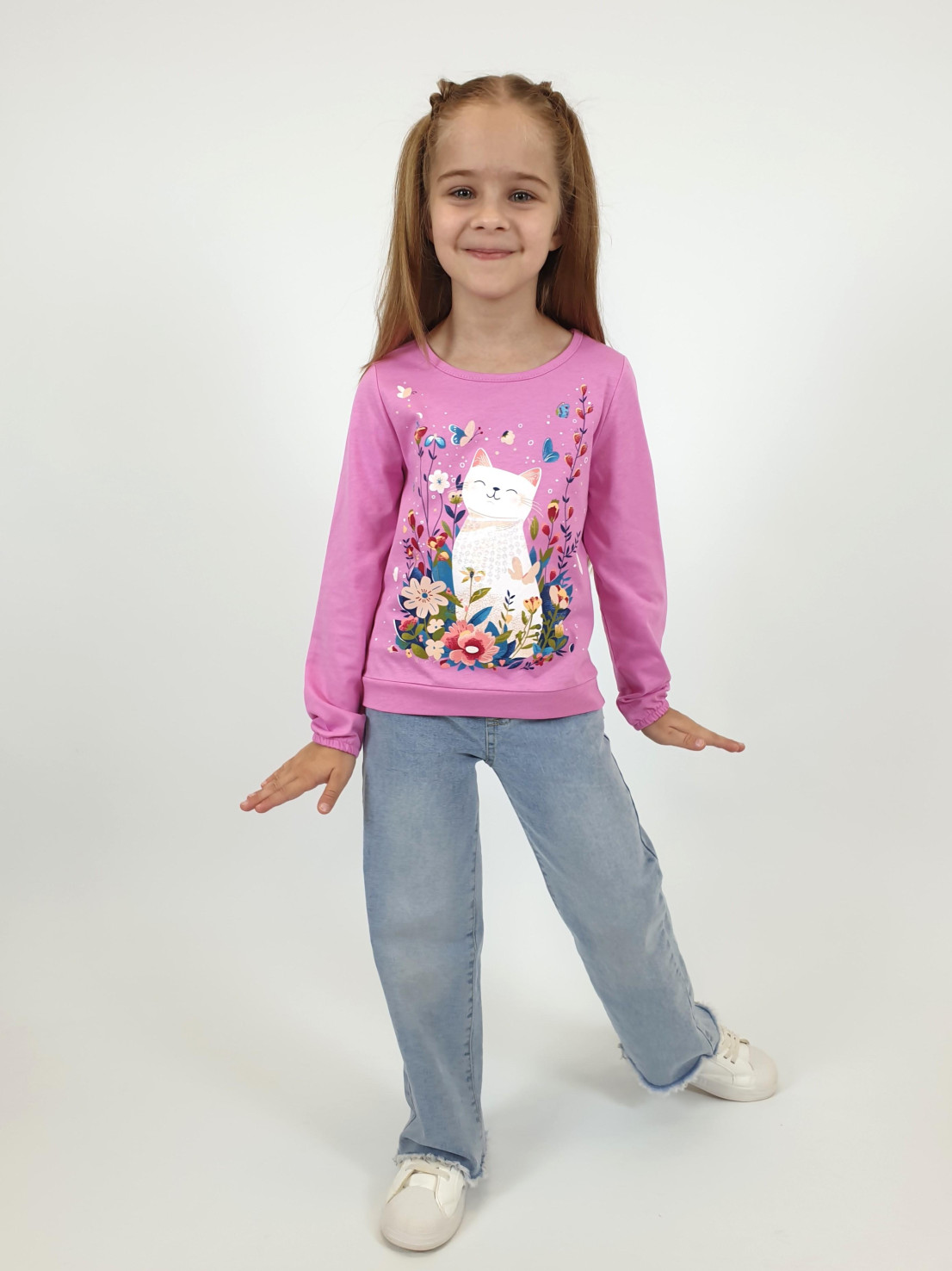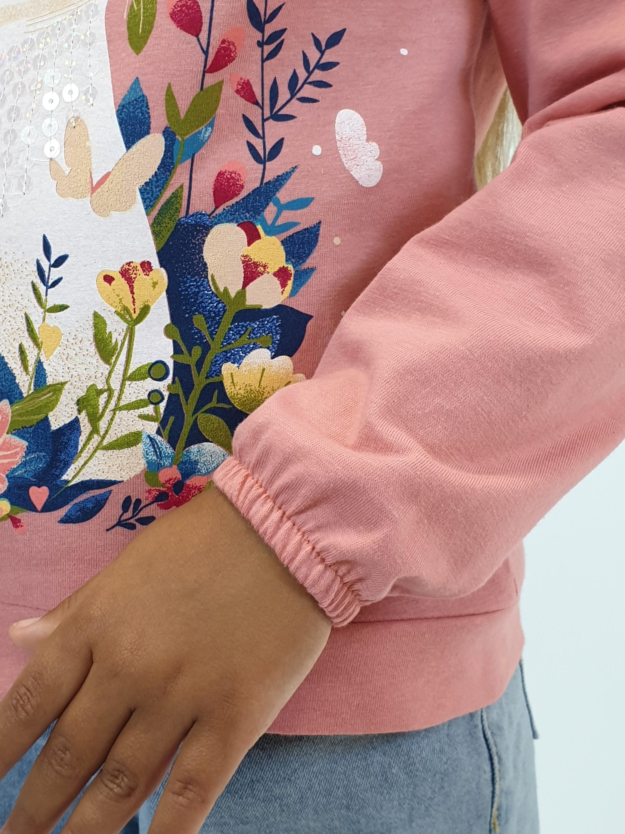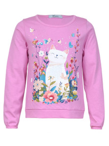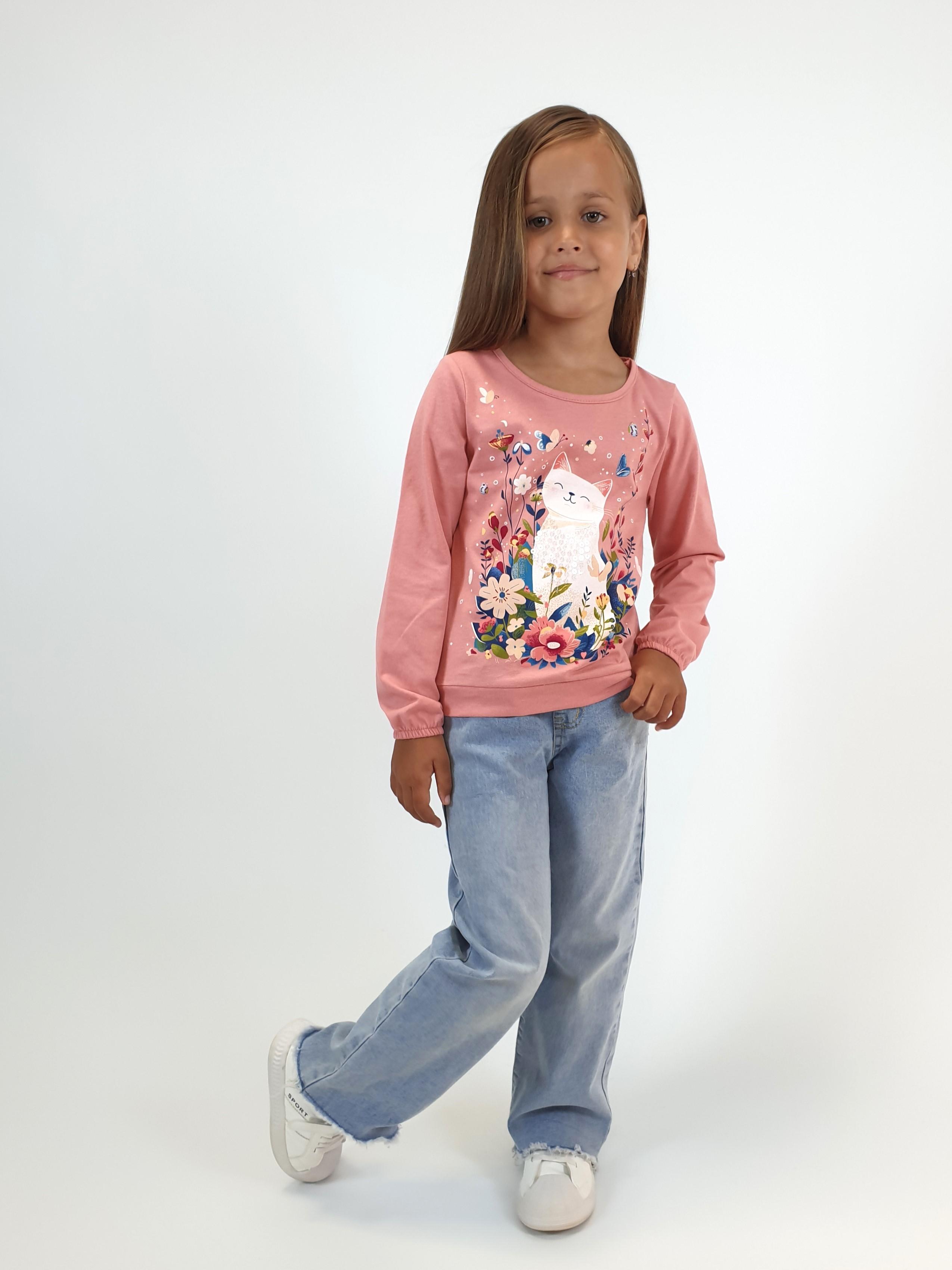 Кулирное полотно:100% х/б. Джемпер-прямого силуэта,на поясе.На переде печать и вышивка(пайетки),втачной длинный рукав на резинке.Горловина окантована.