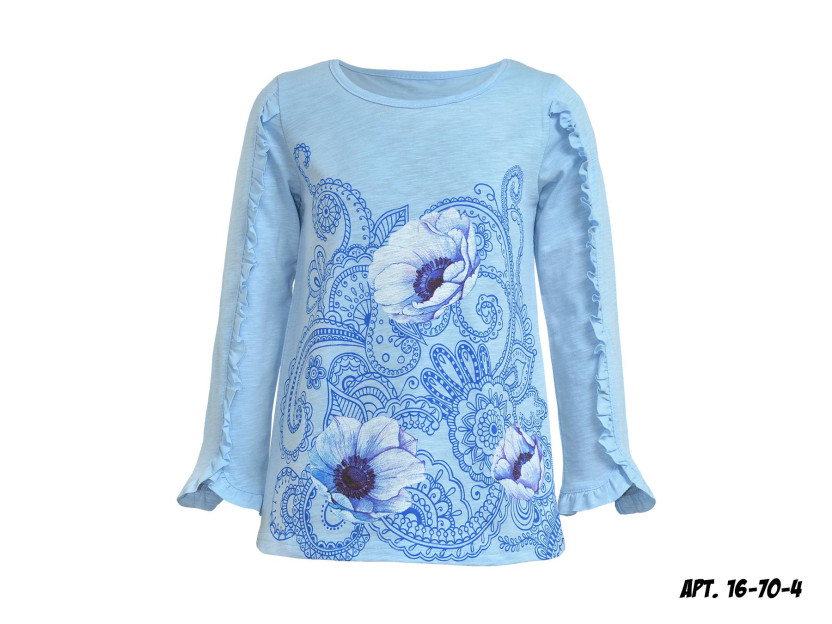 Вид полотна: Кулирное полотно 100% х/б. Джемпер-прямого силуэта с печатью по переду. Рукав втачной, длинный, двушовный с отделочной рюшей. Горловина окантована.