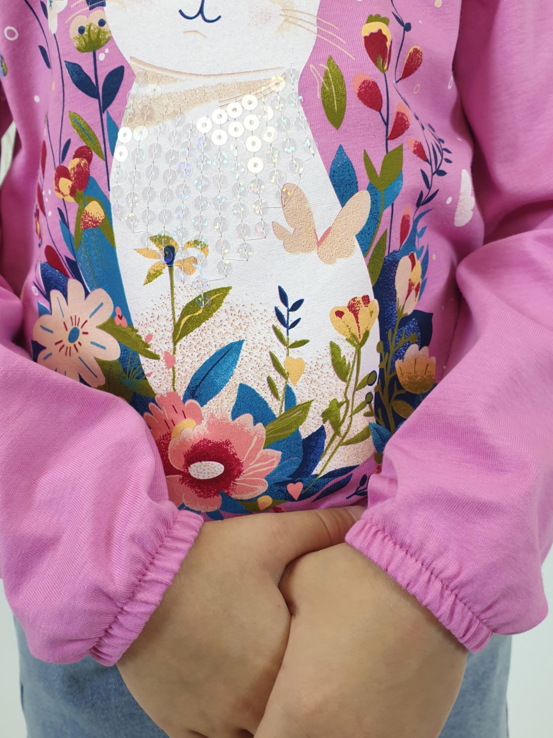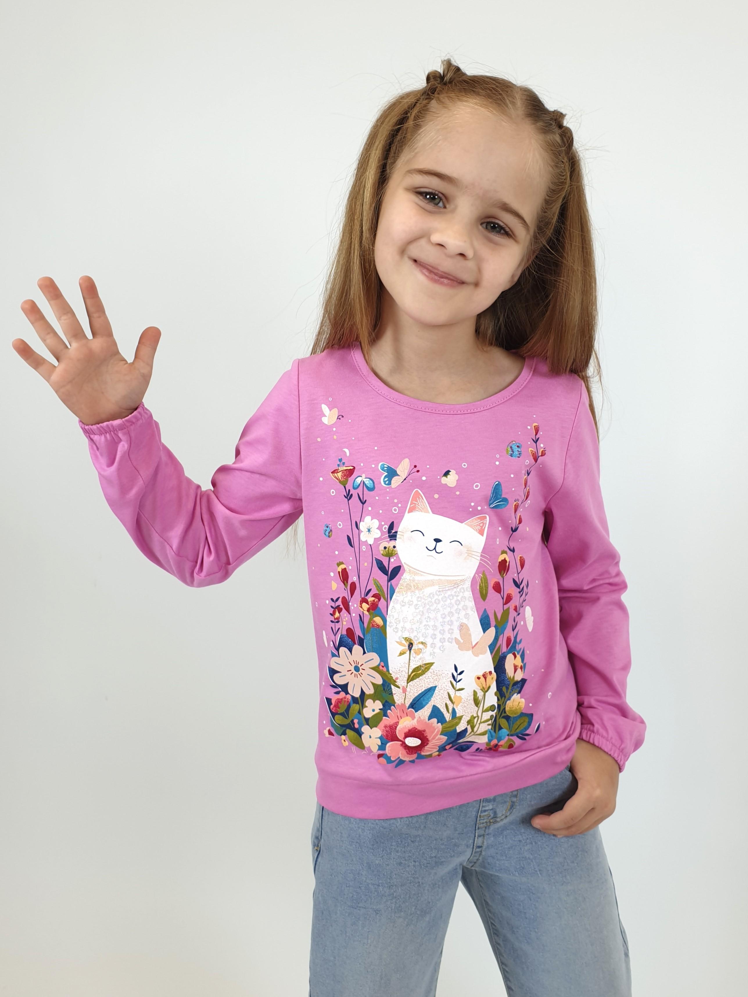 Кулирное полотно:100% х/б. Джемпер-прямого силуэта,на поясе.На переде печать и вышивка(пайетки),втачной длинный рукав на резинке.Горловина окантована.