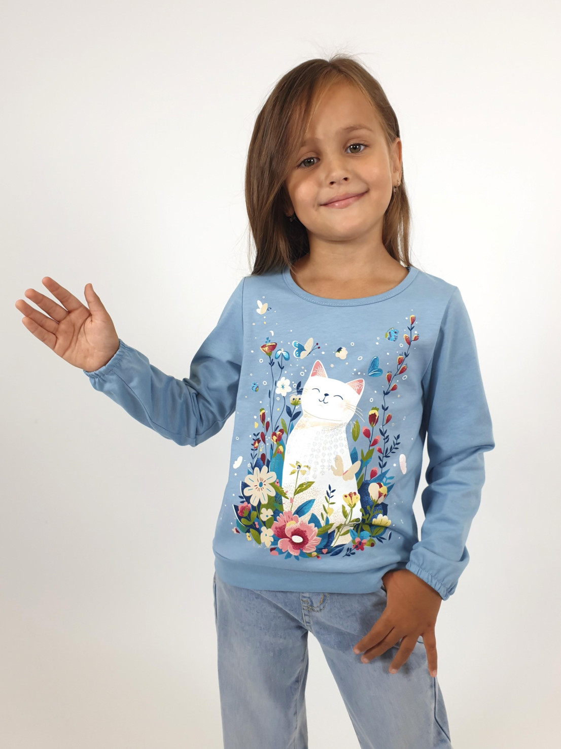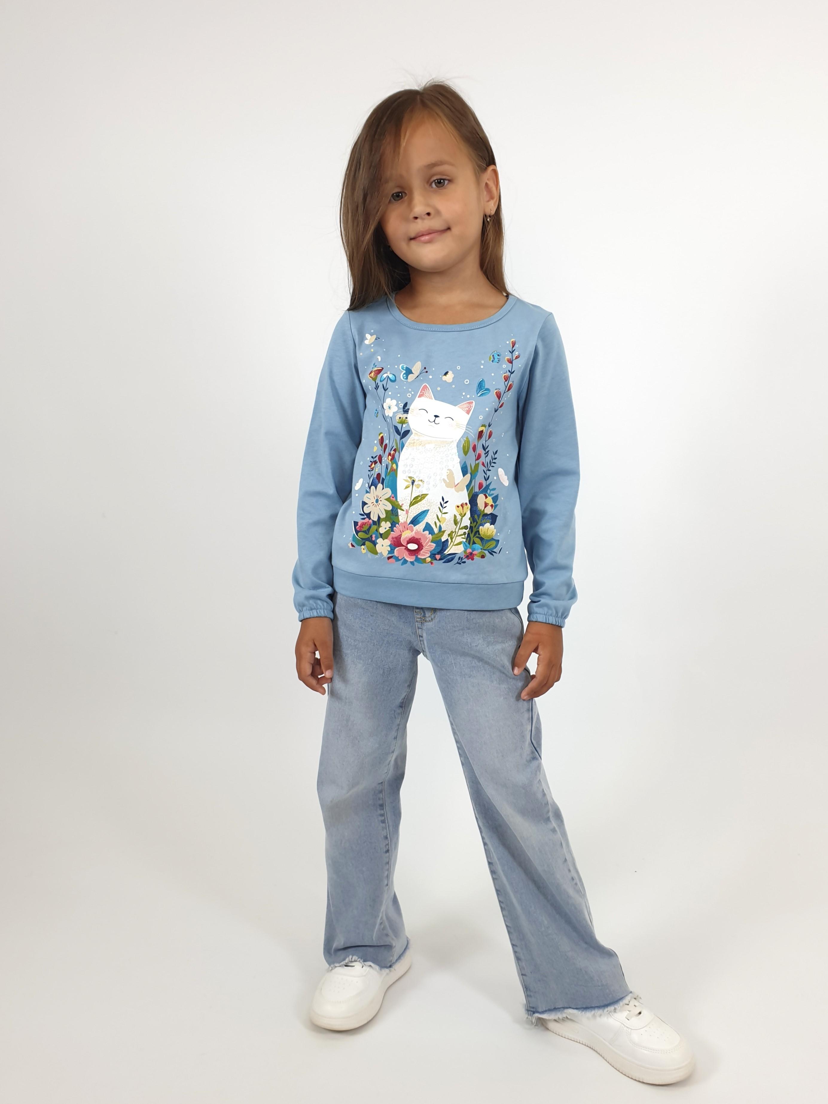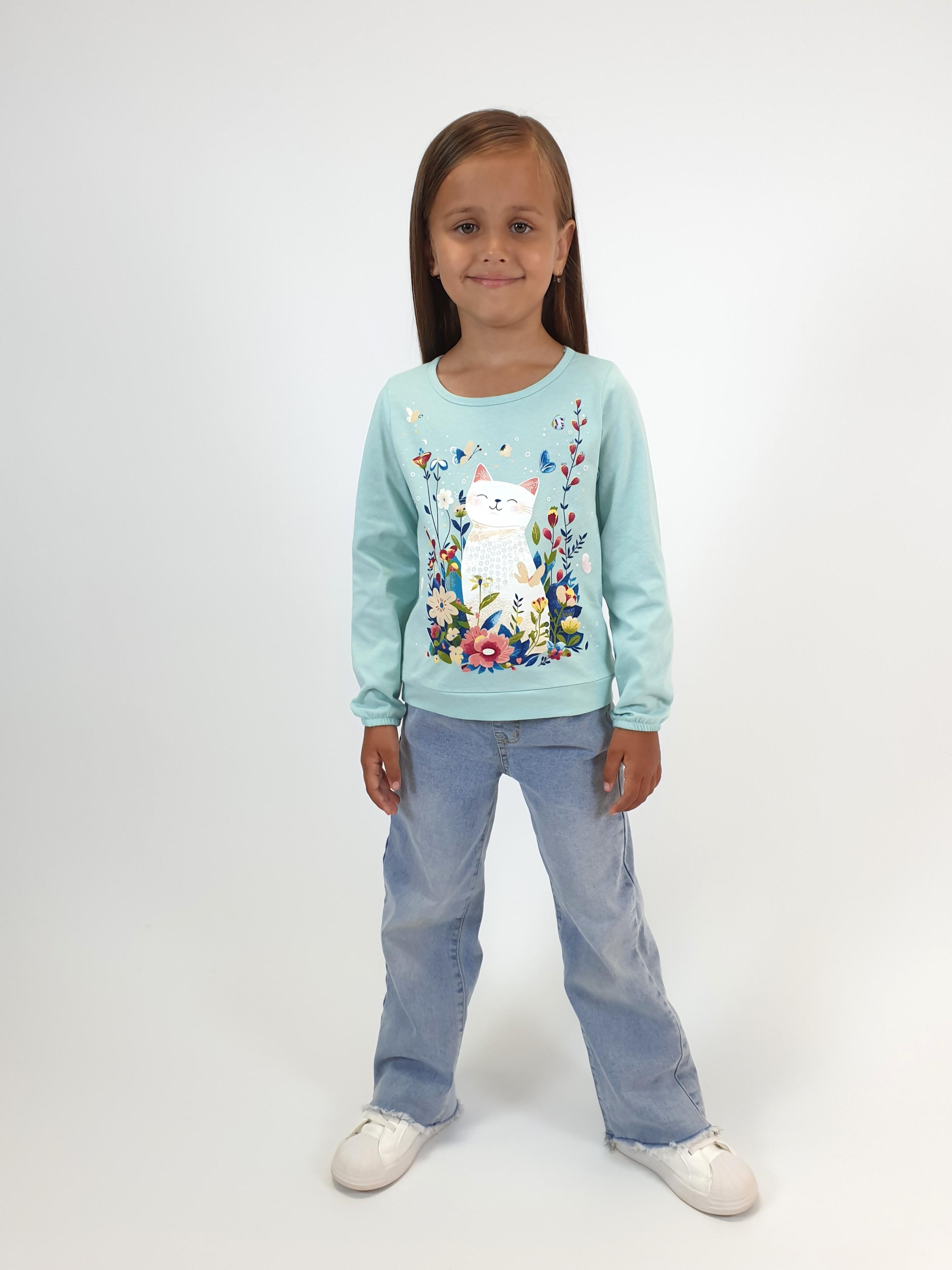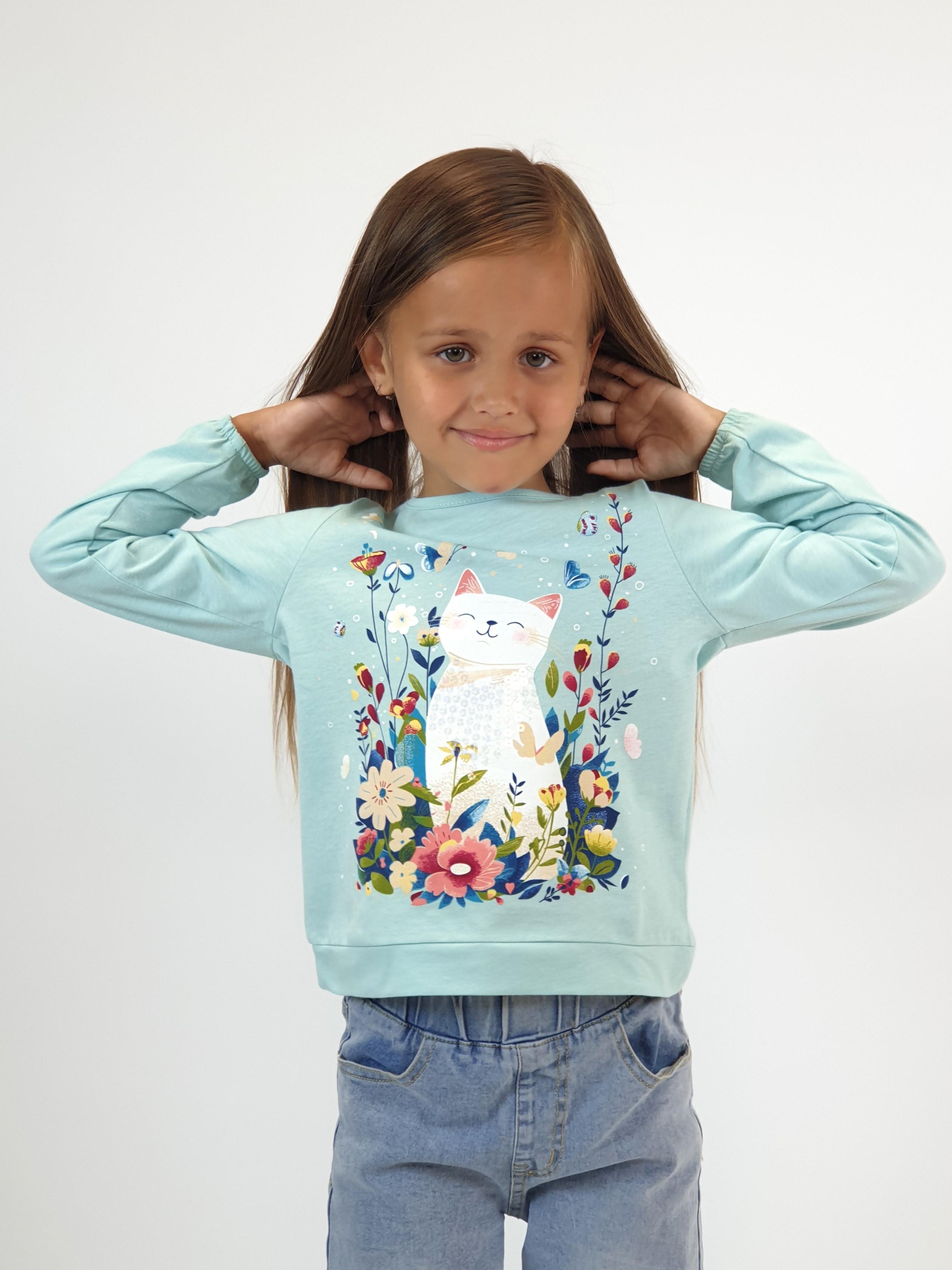 Кулирное полотно:100% х/б. Джемпер-прямого силуэта,на поясе.На переде печать и вышивка(пайетки),втачной длинный рукав на резинке.Горловина окантована.