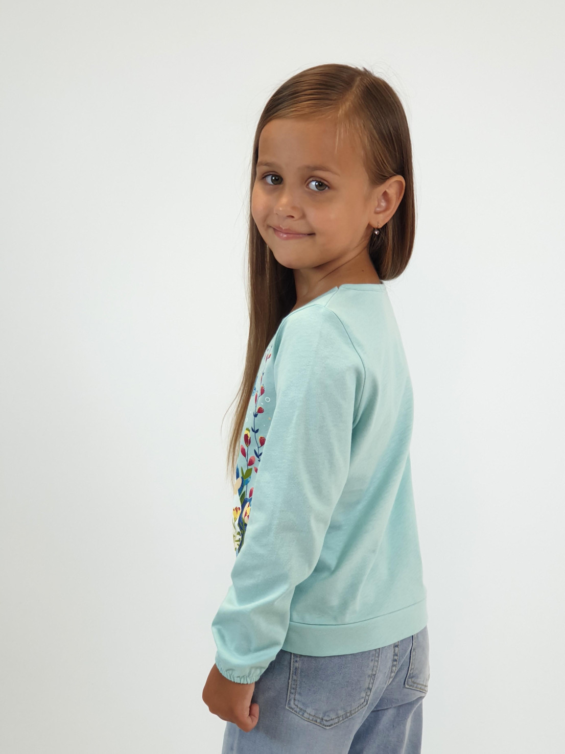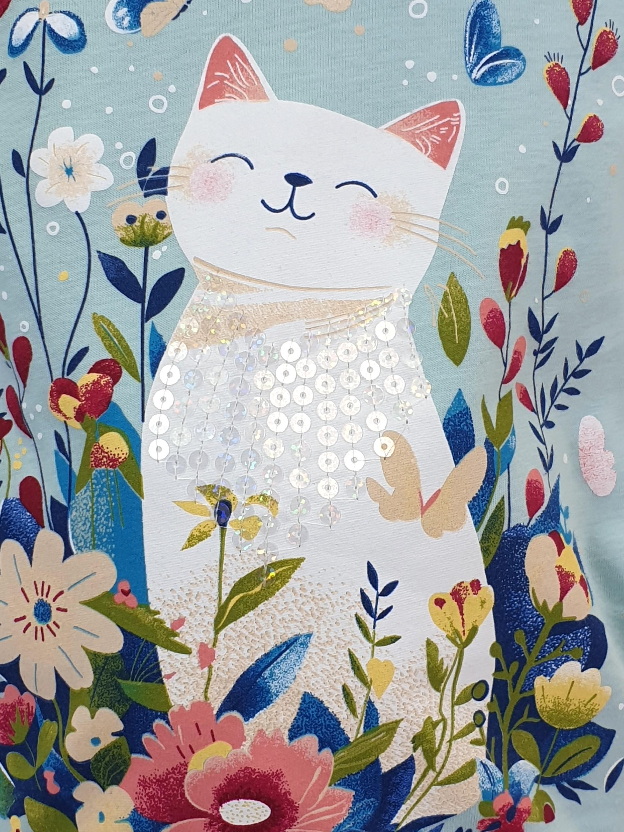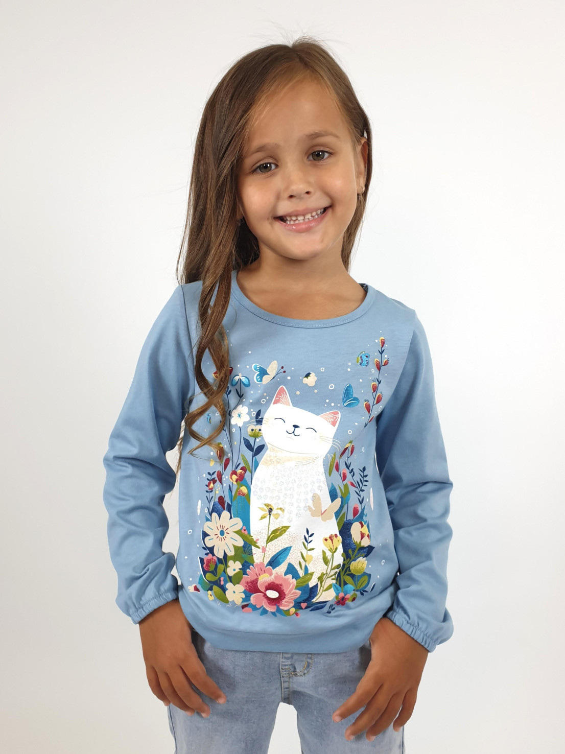 Кулирное полотно:100% х/б. Джемпер-прямого силуэта,на поясе.На переде печать и вышивка(пайетки),втачной длинный рукав на резинке.Горловина окантована.