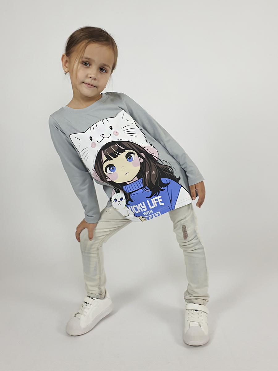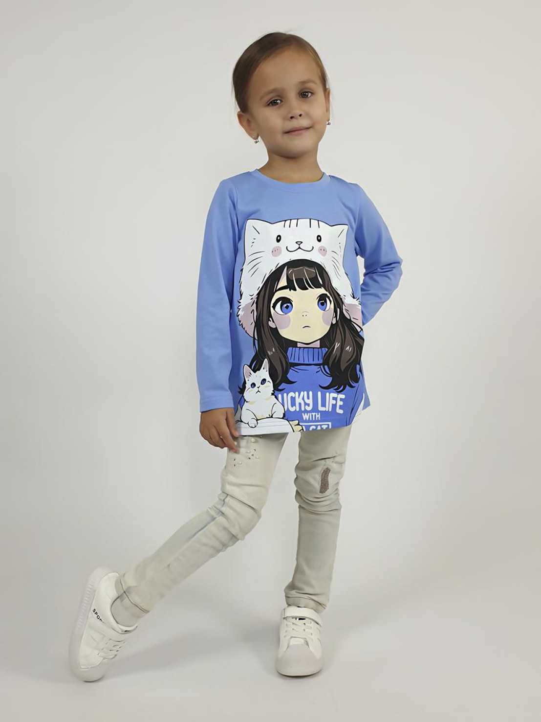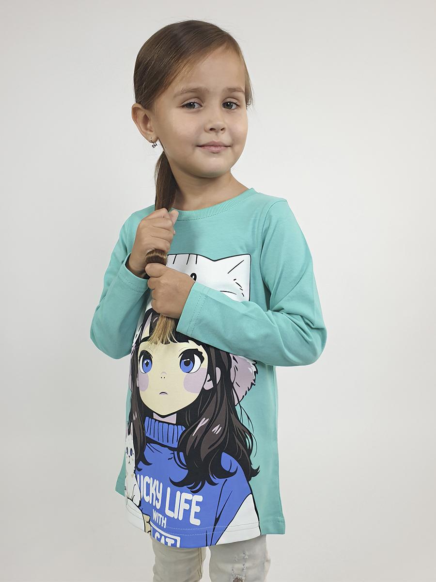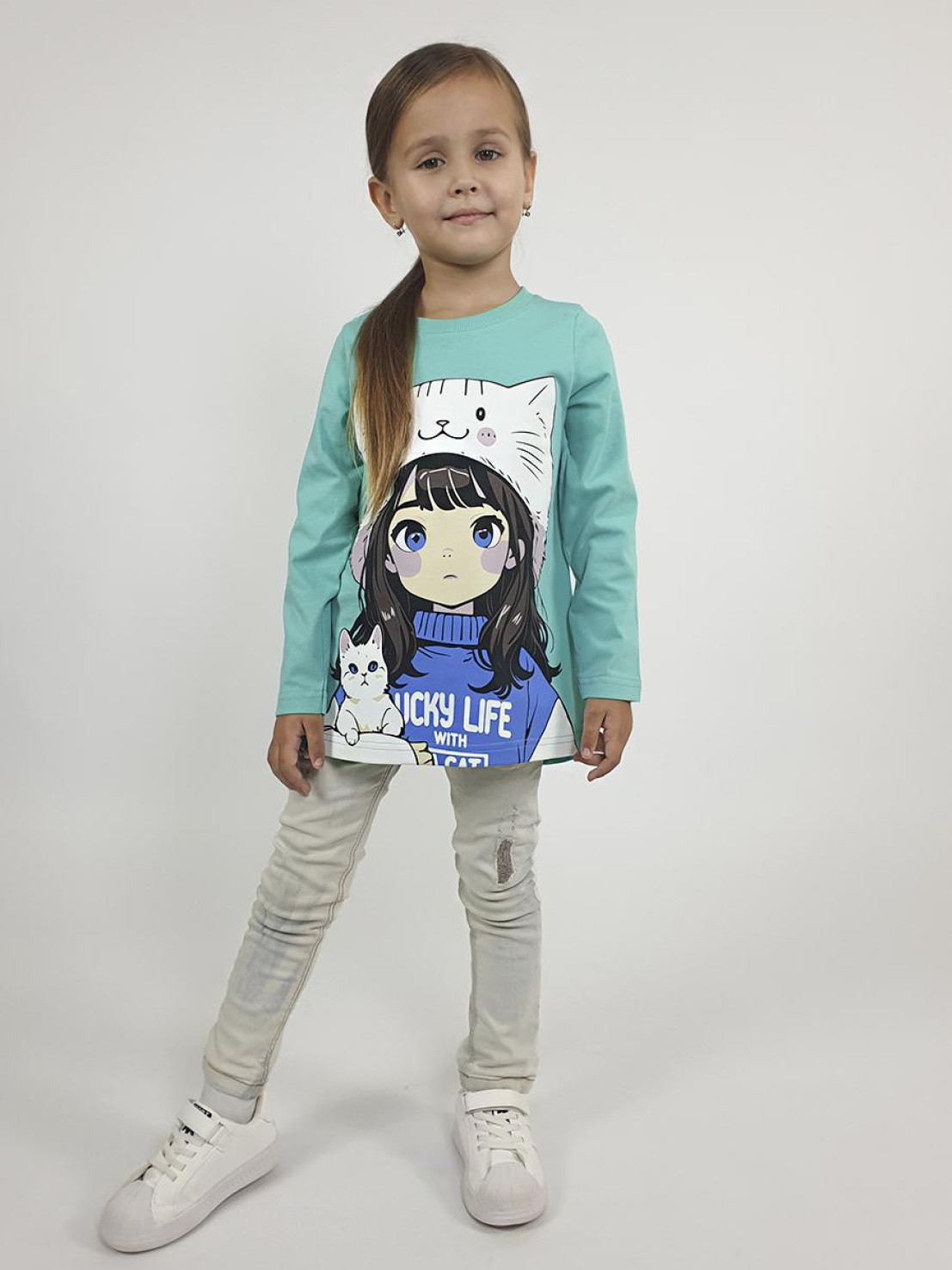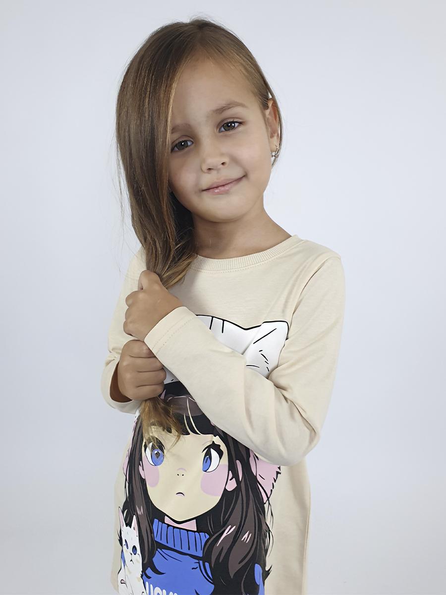 Кулирное полотно:100% х/б. Джемпер-силуэт трапеция,перед с печатью.Рукав втачной,длинный.Горловина обработана ластиком,низ изделия и рукава подшиты.