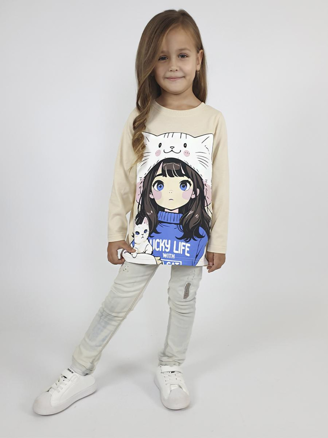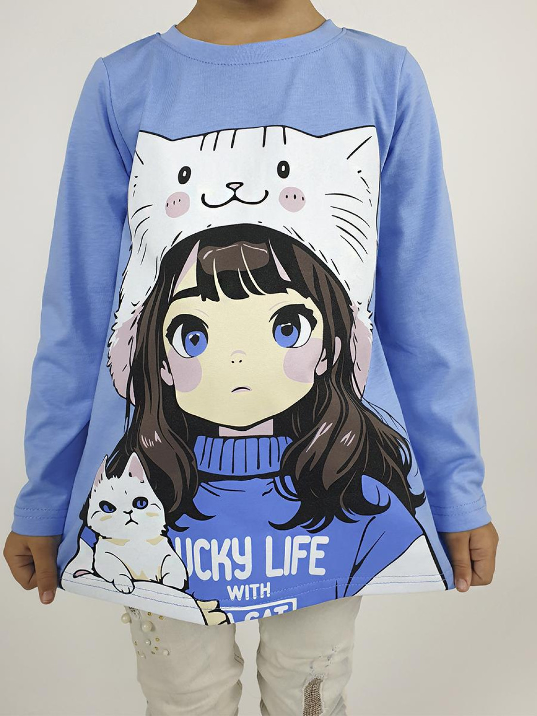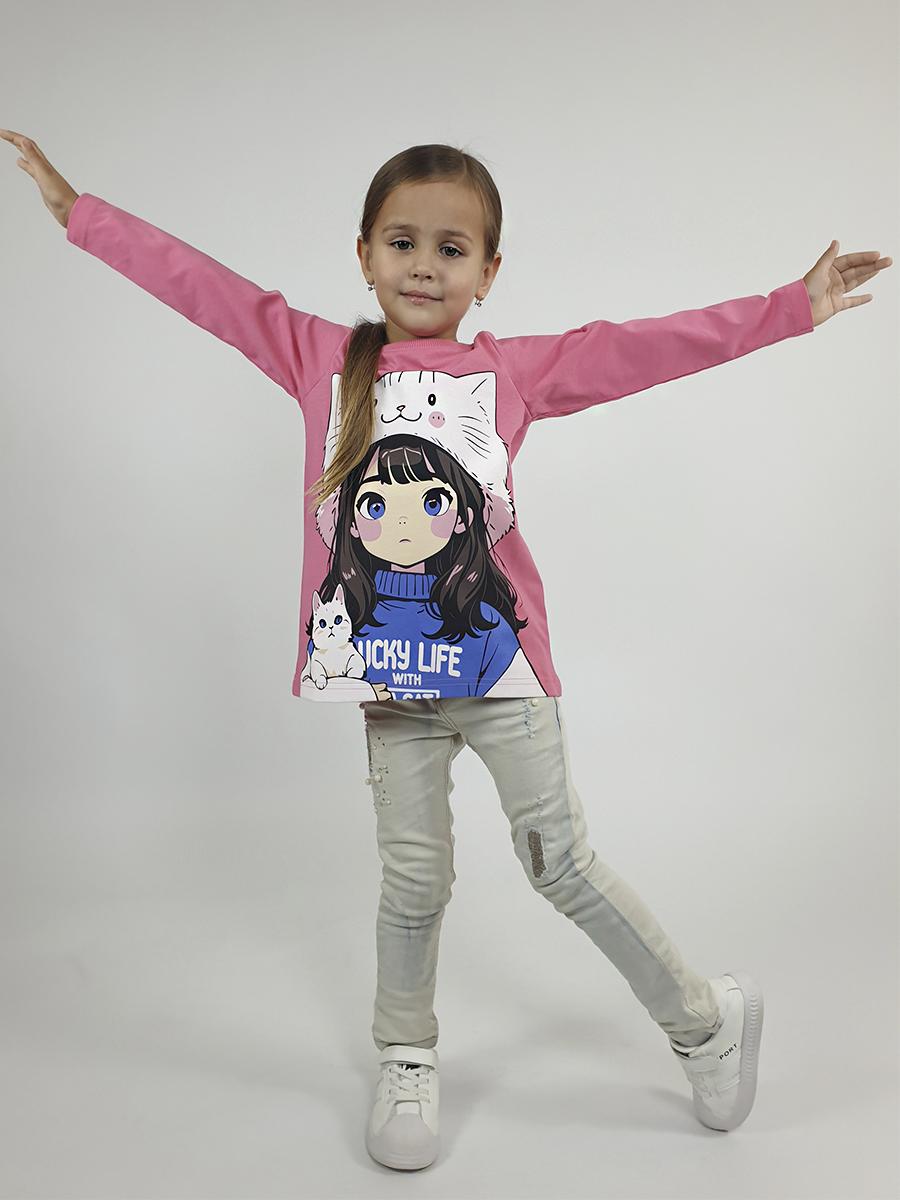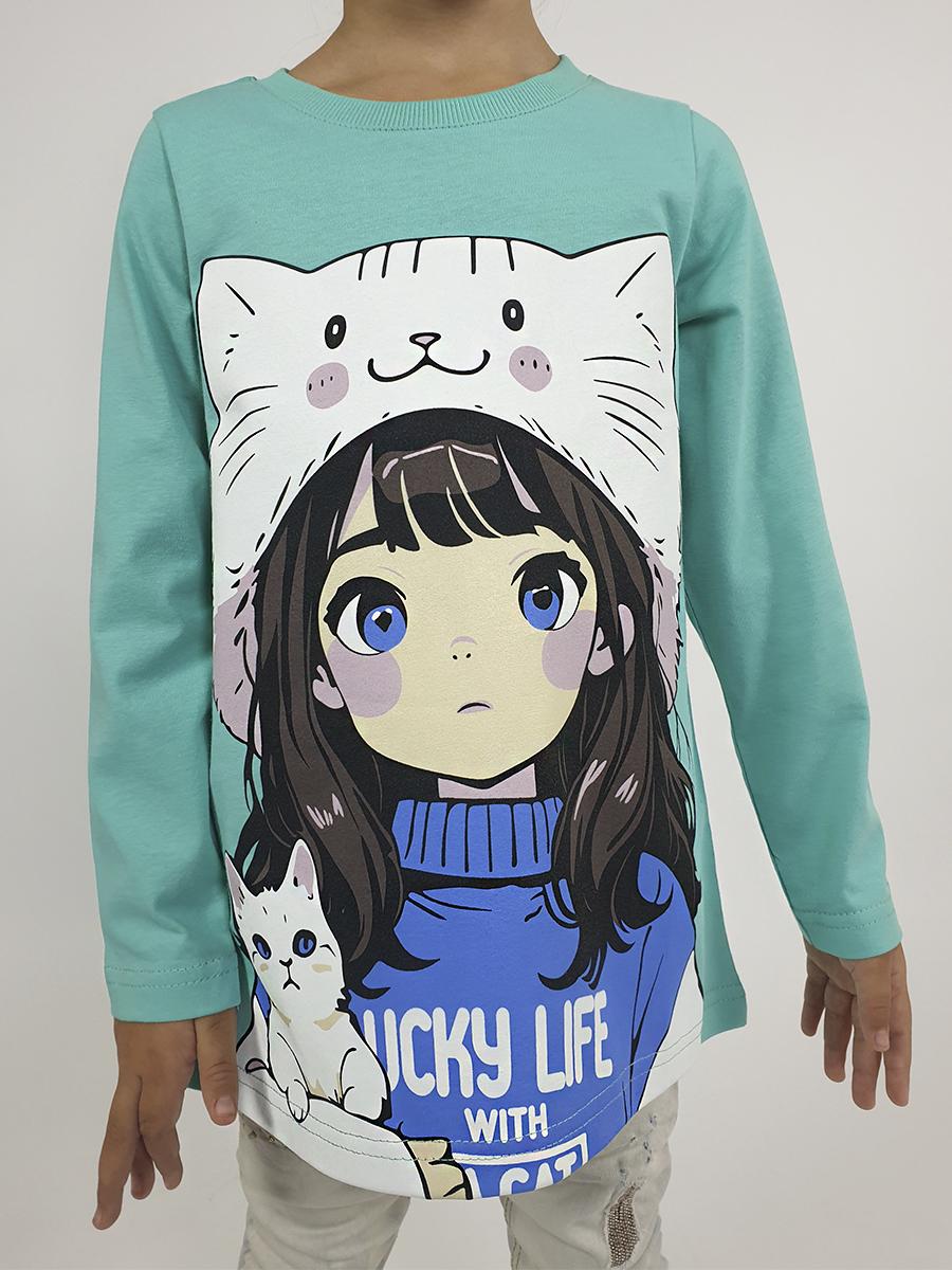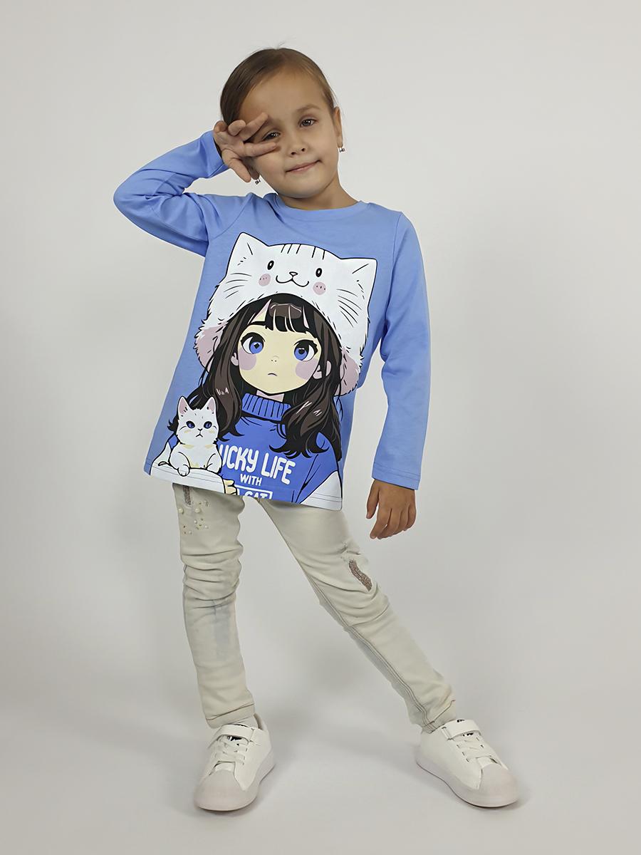 Кулирное полотно:100% х/б. Джемпер-силуэт трапеция,перед с печатью.Рукав втачной,длинный.Горловина обработана ластиком,низ изделия и рукава подшиты.