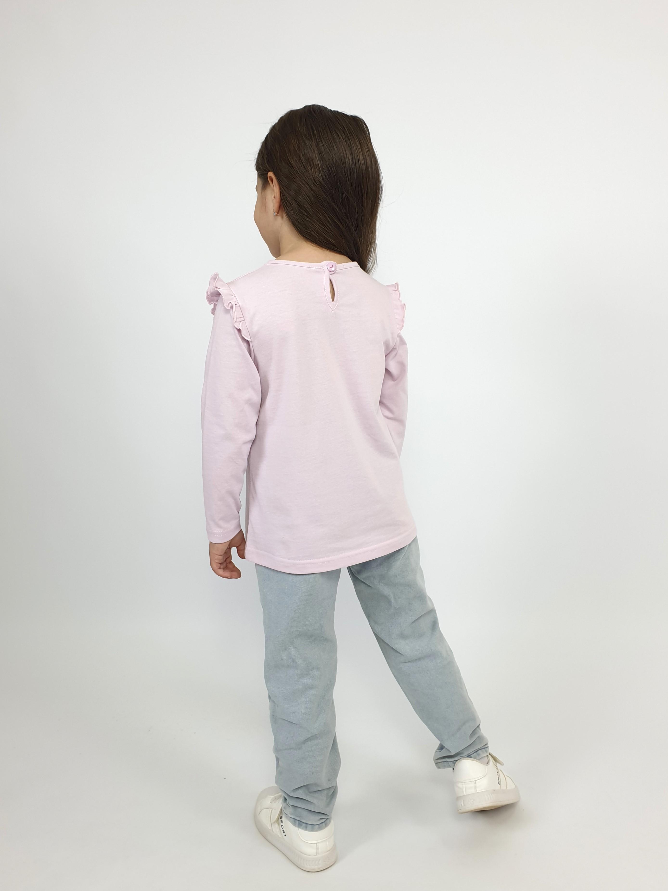 Кулирное полотно:100% х/б. Джемпер-силуэт трапеция,длинный втачной рукав,в пройме рюша.Горловина окантована,застежка на пуговицу по спинке.Печать на переде.