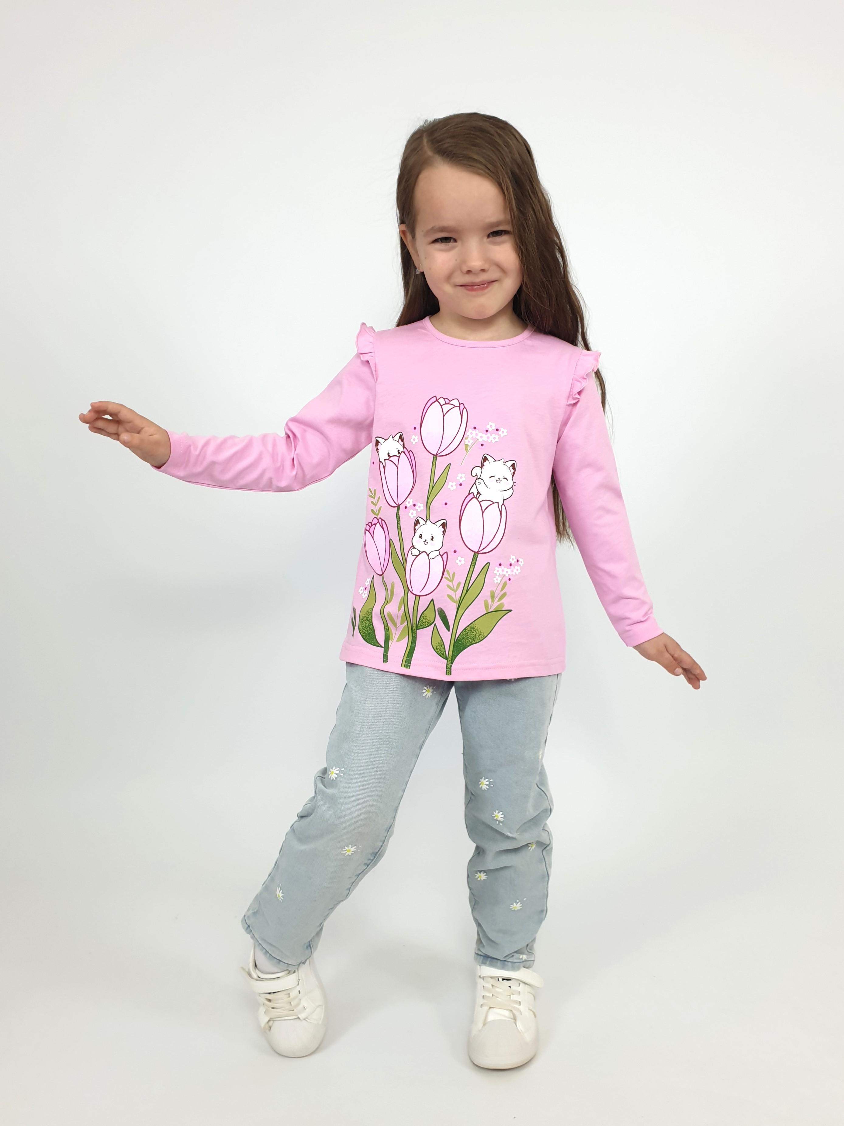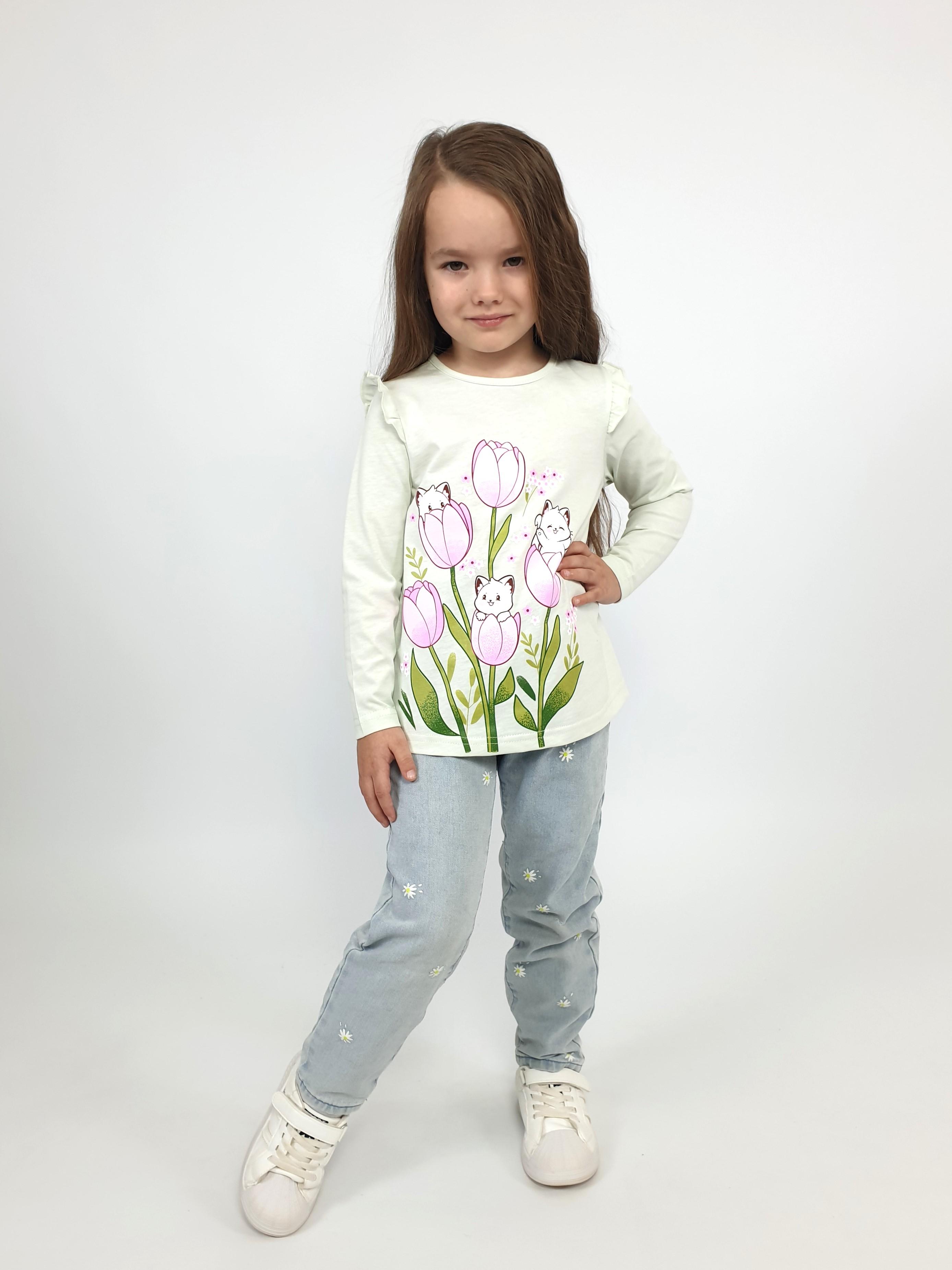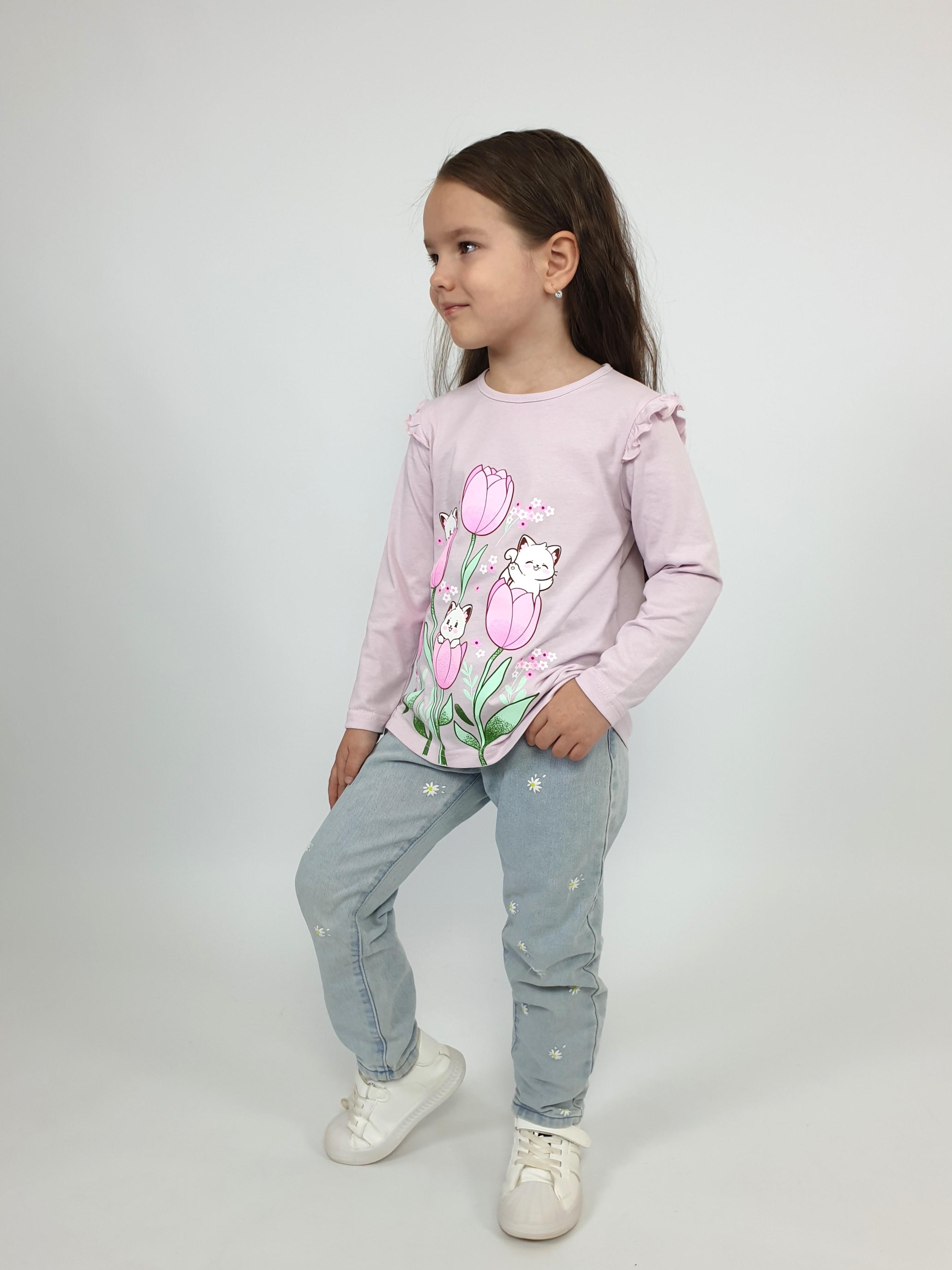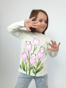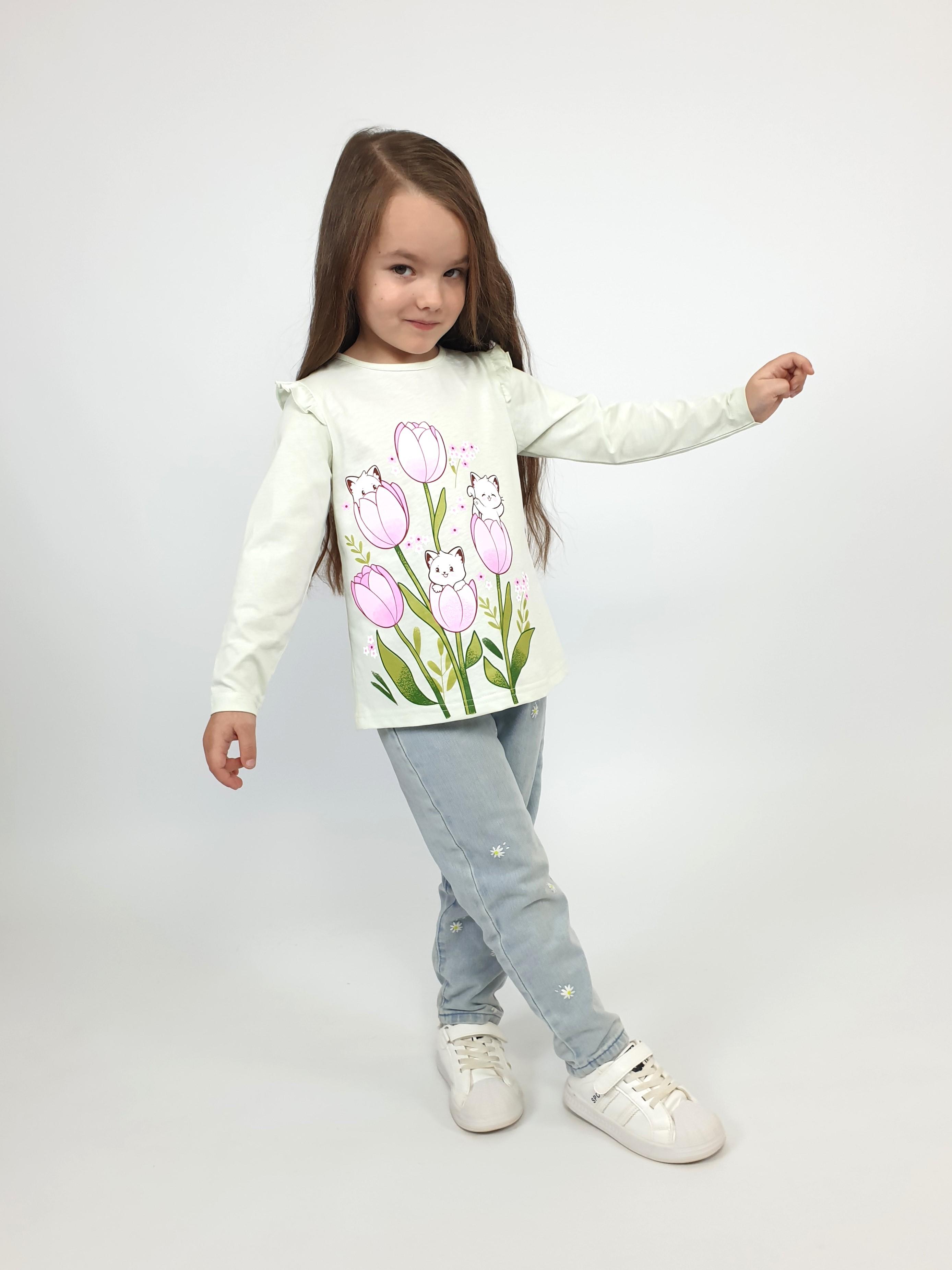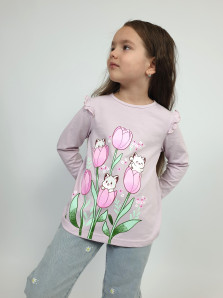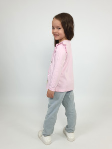 Кулирное полотно:100% х/б. Джемпер-силуэт трапеция,длинный втачной рукав,в пройме рюша.Горловина окантована,застежка на пуговицу по спинке.Печать на переде.