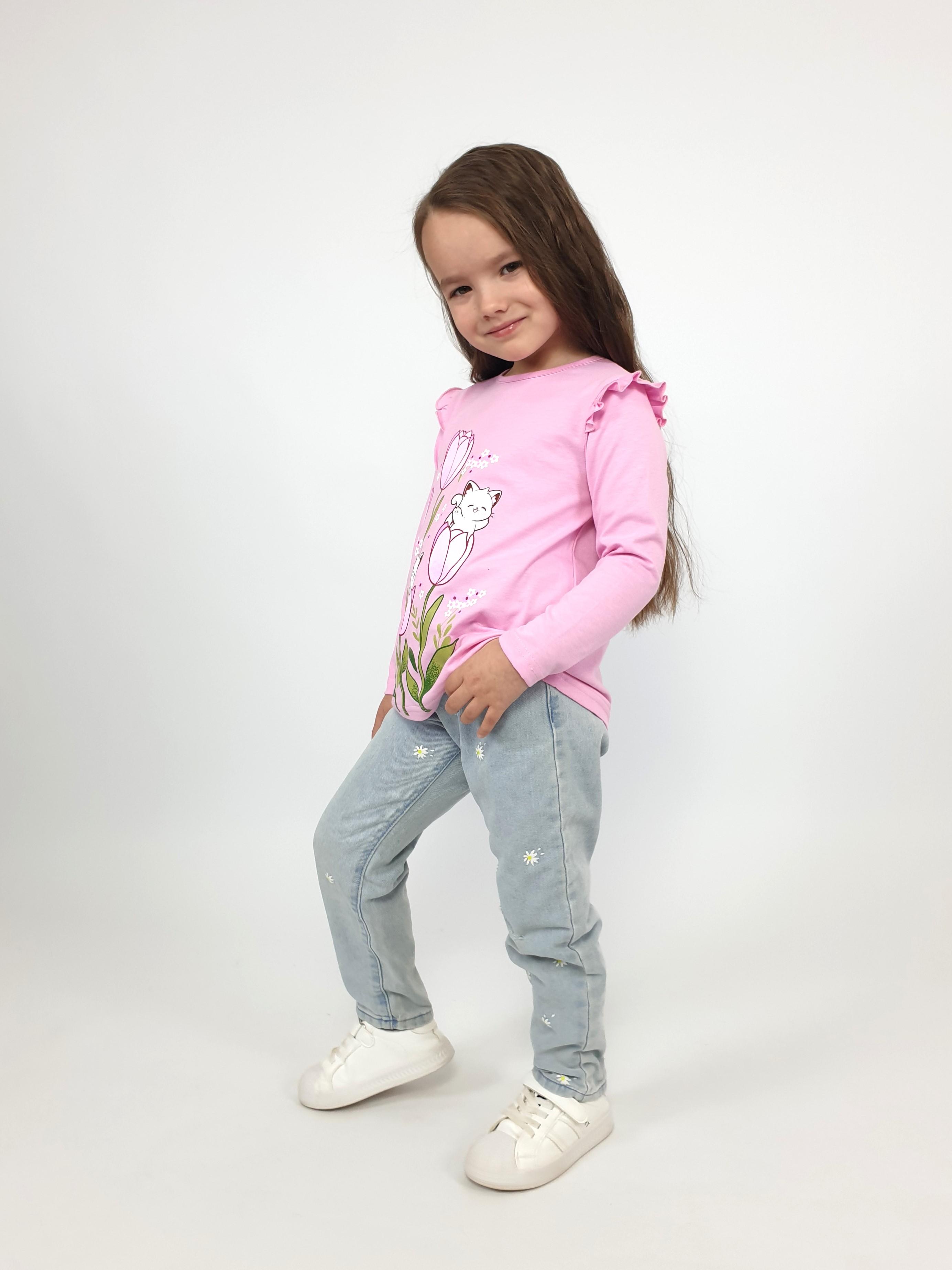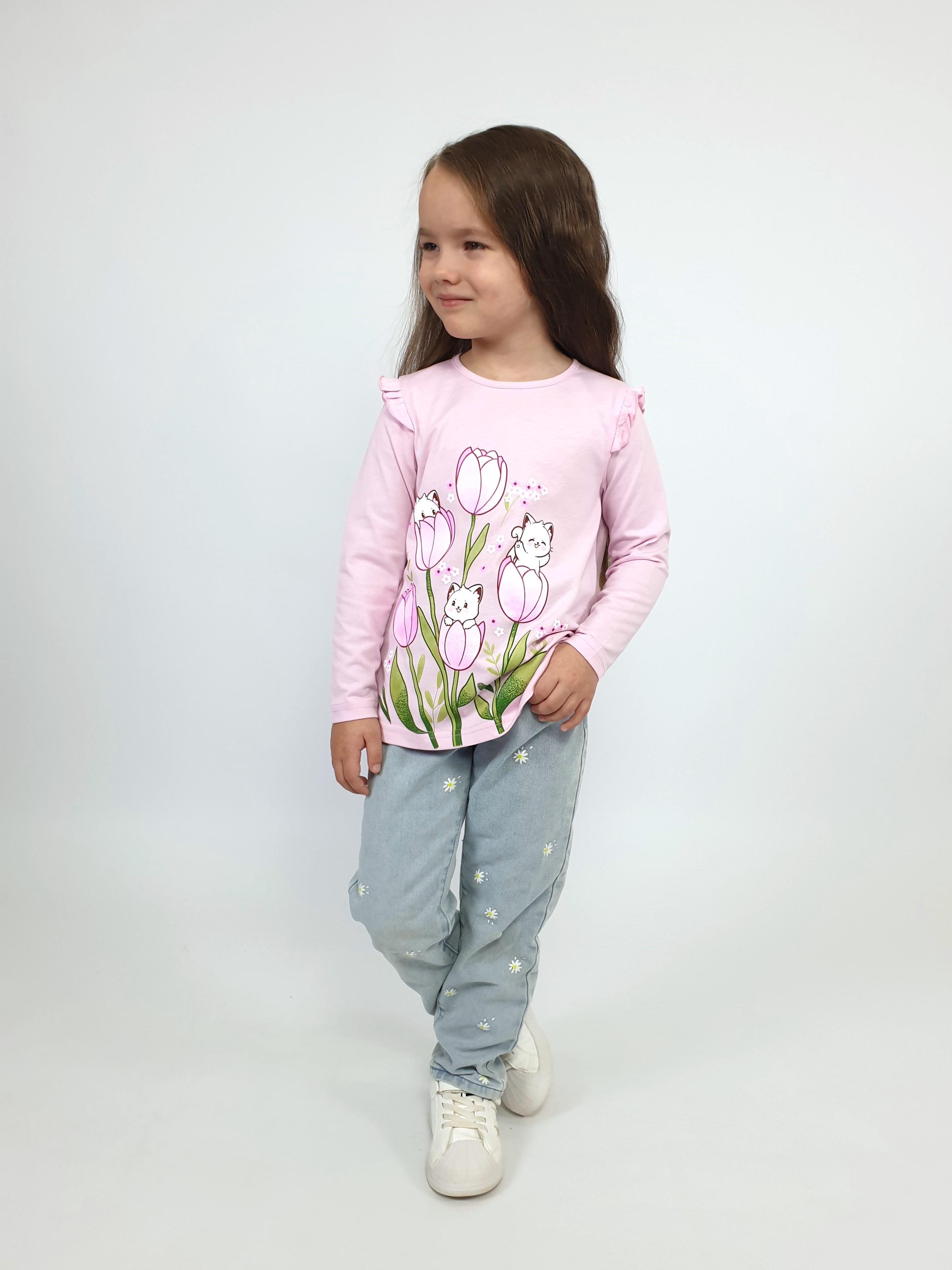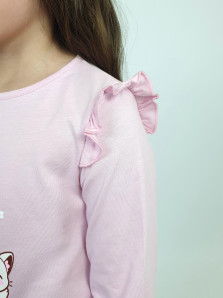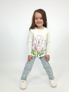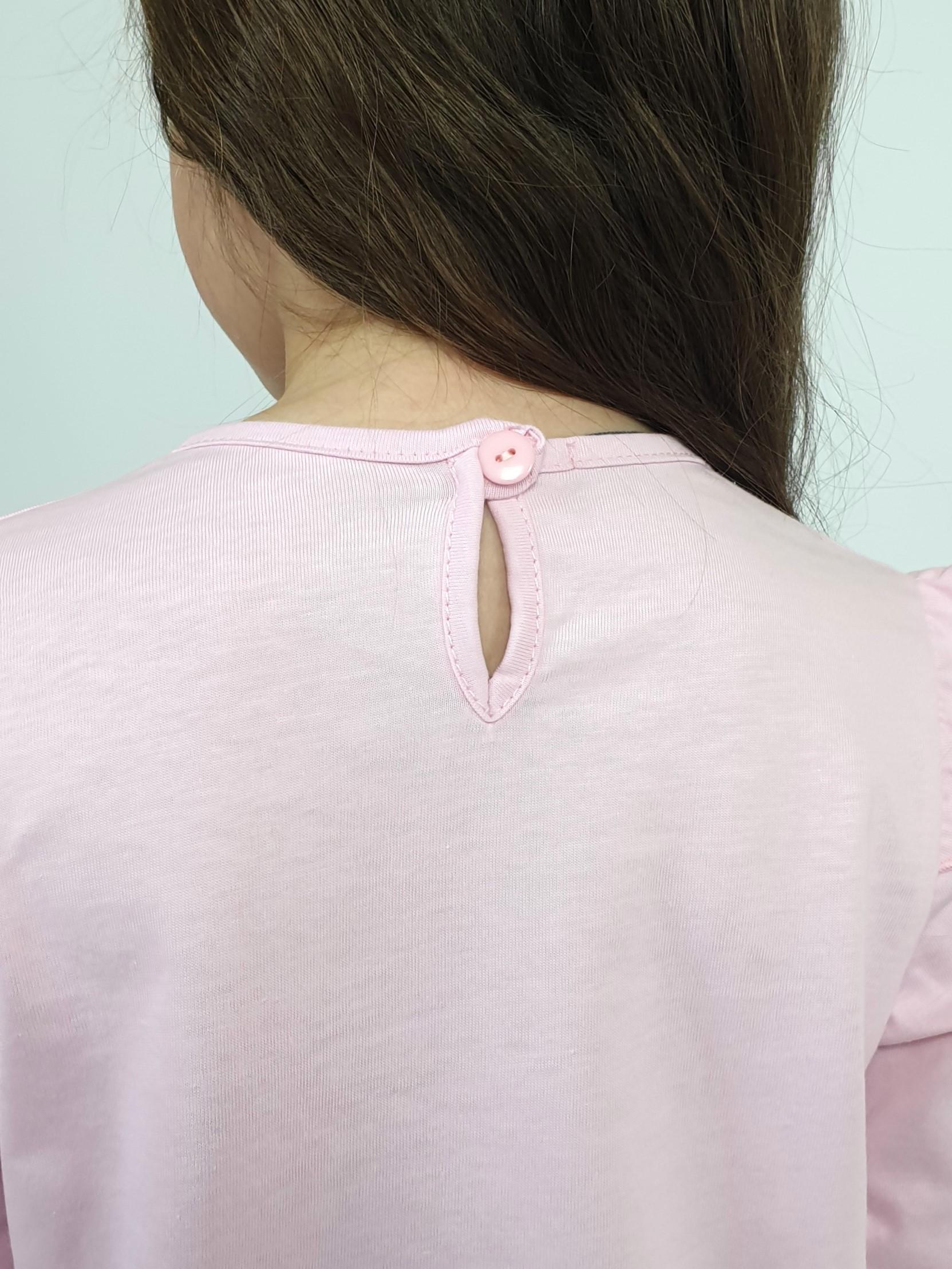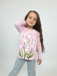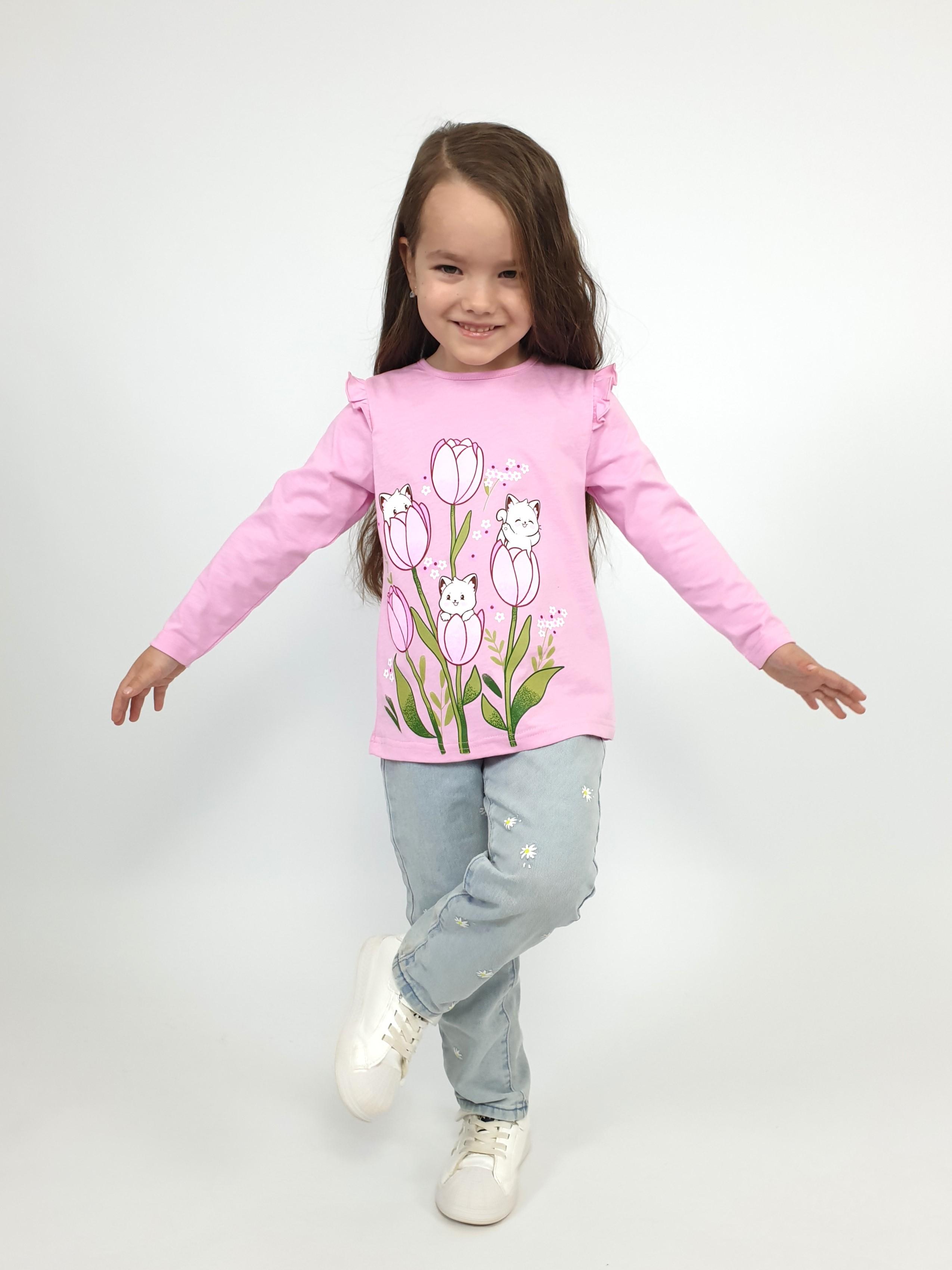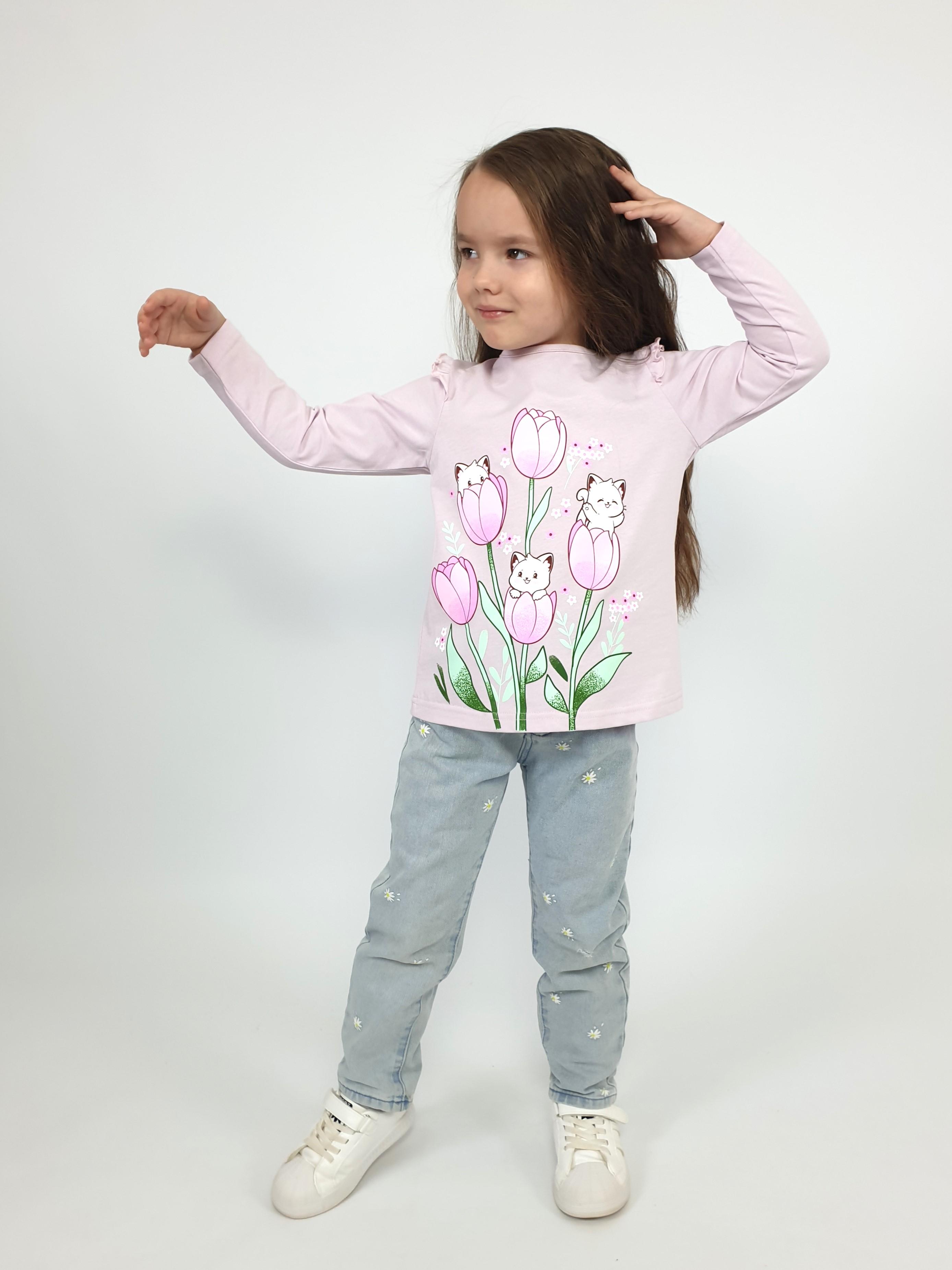 Кулирное полотно:100% х/б. Джемпер-силуэт трапеция,длинный втачной рукав,в пройме рюша.Горловина окантована,застежка на пуговицу по спинке.Печать на переде.