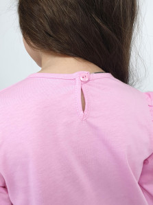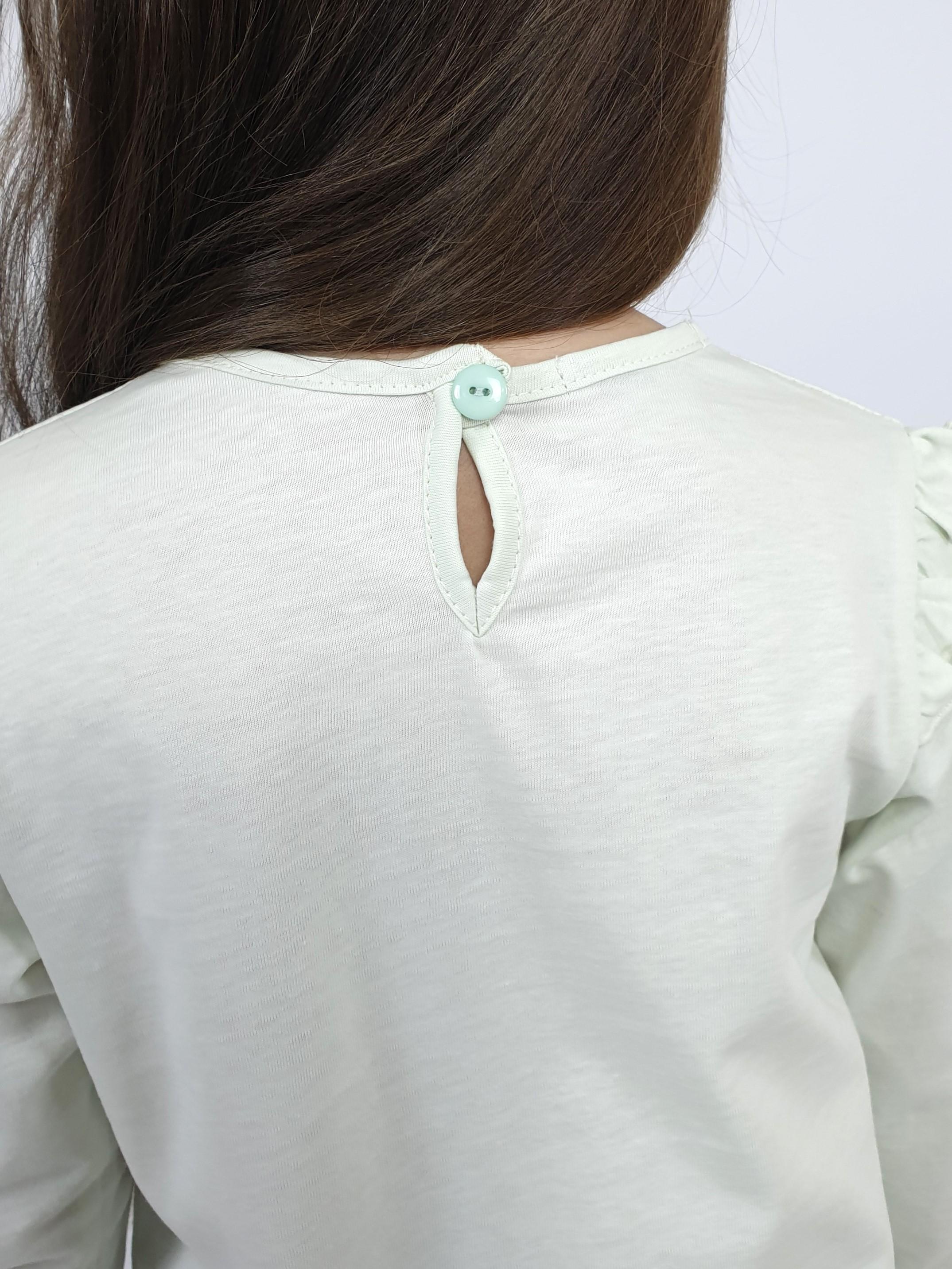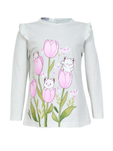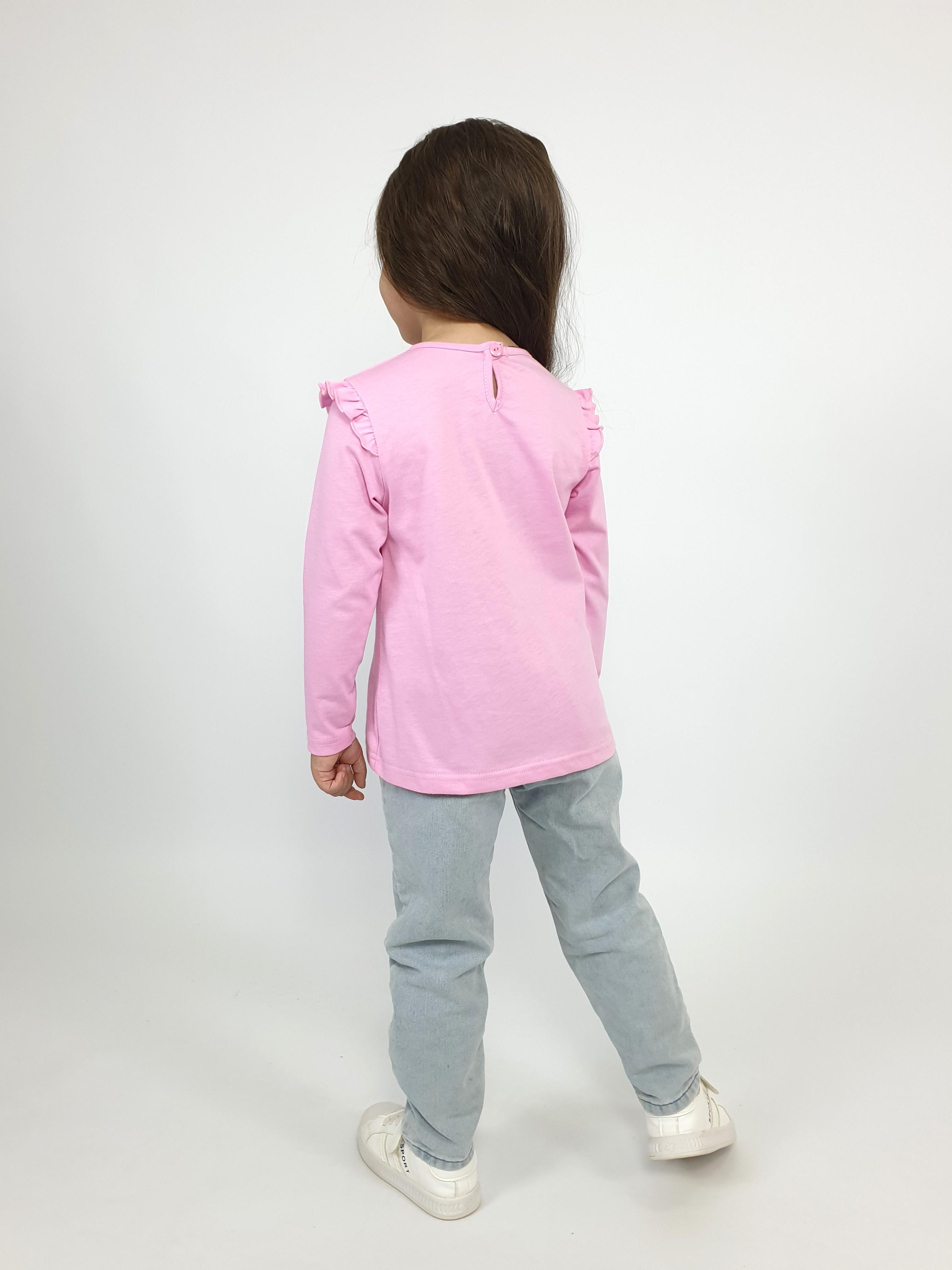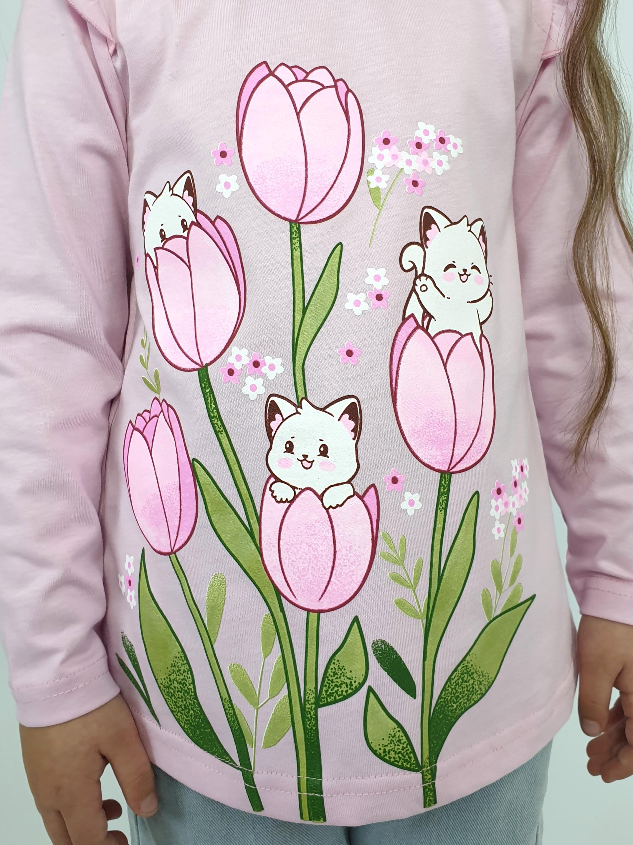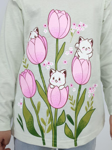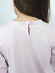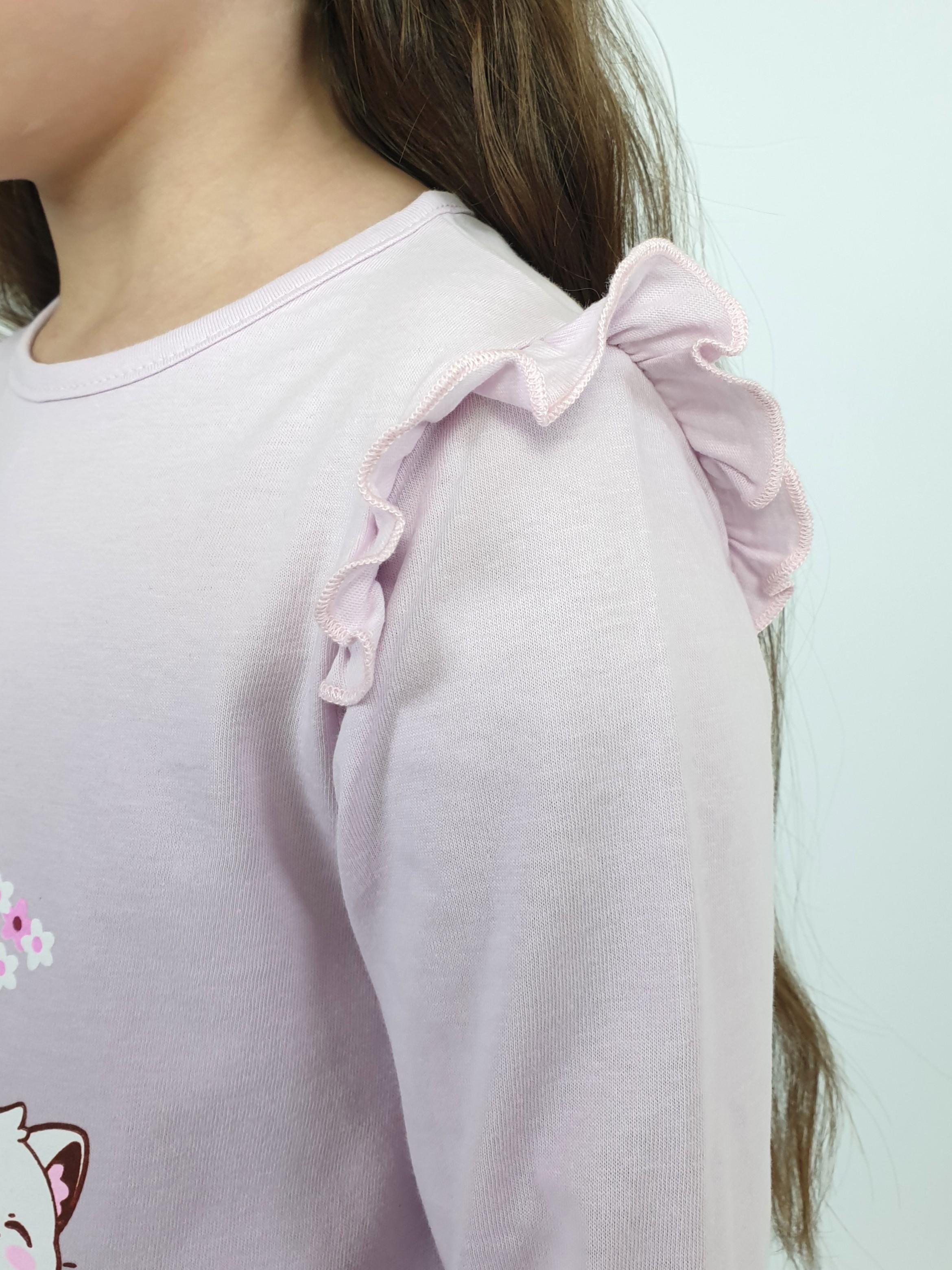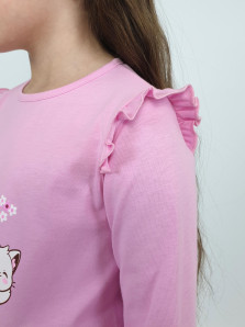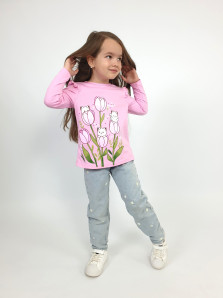 Кулирное полотно:100% х/б. Джемпер-силуэт трапеция,длинный втачной рукав,в пройме рюша.Горловина окантована,застежка на пуговицу по спинке.Печать на переде.