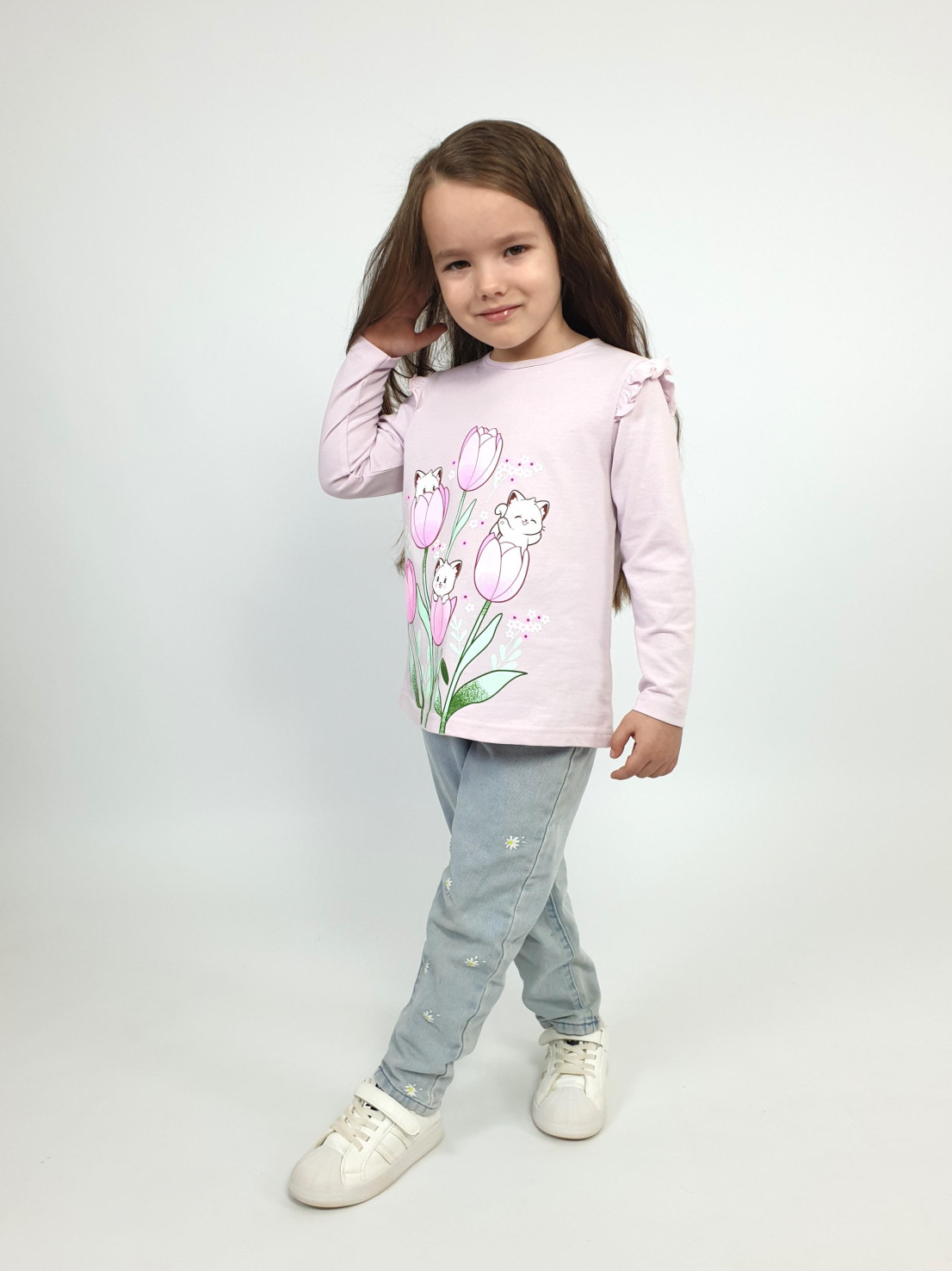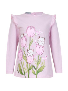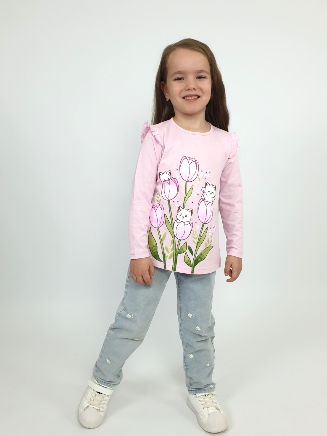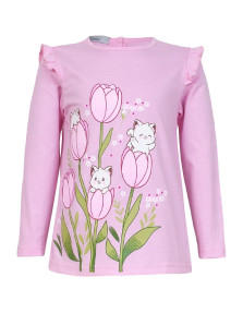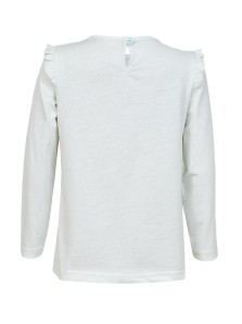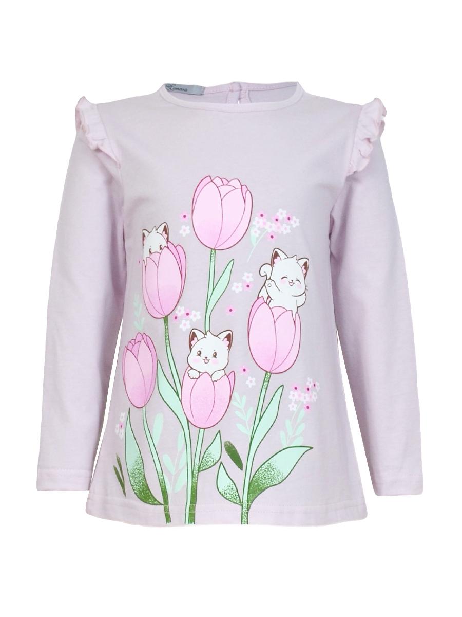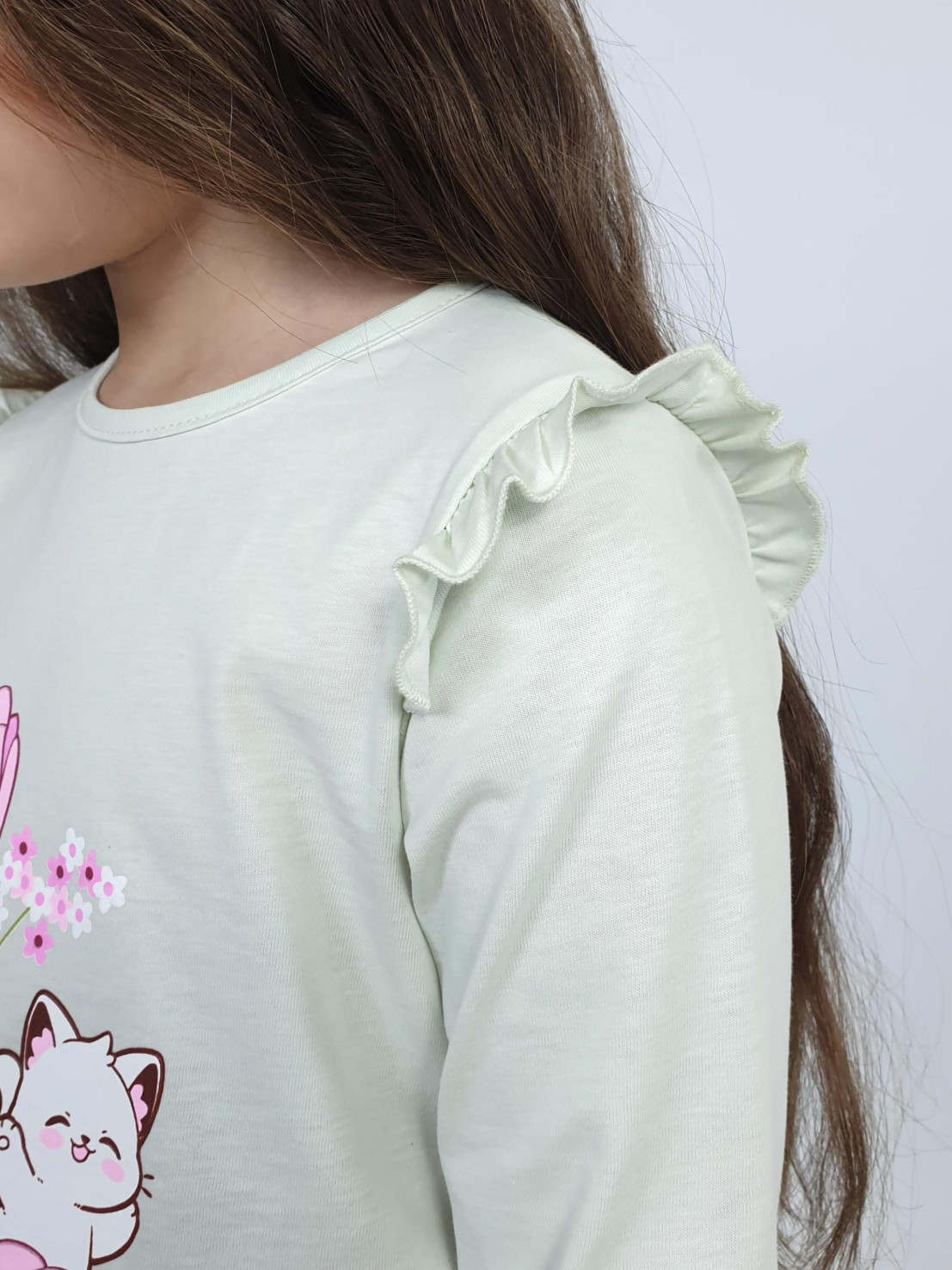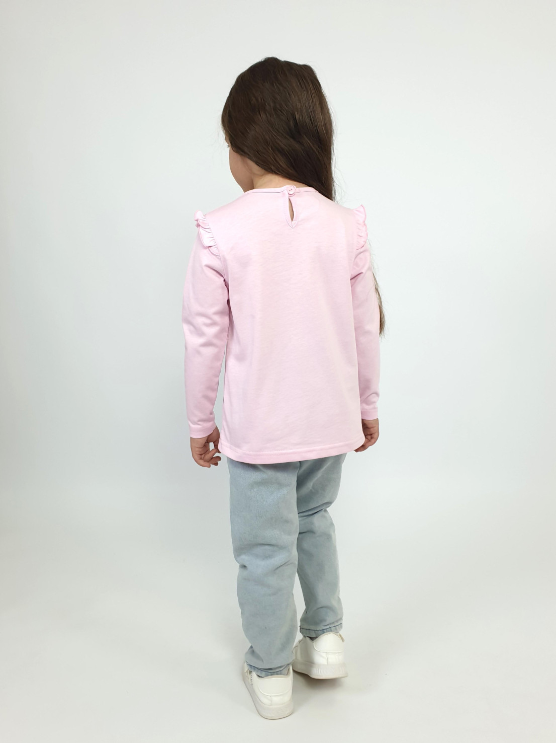 Кулирное полотно:100% х/б. Джемпер-силуэт трапеция,длинный втачной рукав,в пройме рюша.Горловина окантована,застежка на пуговицу по спинке.Печать на переде.