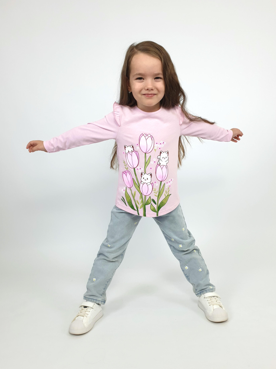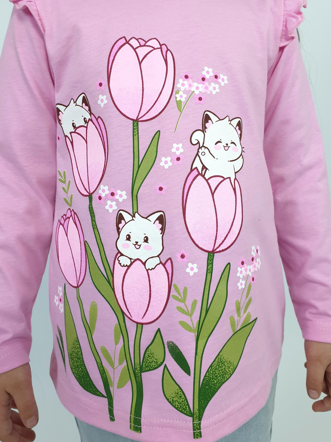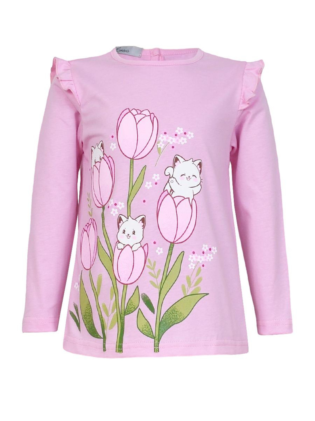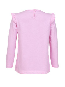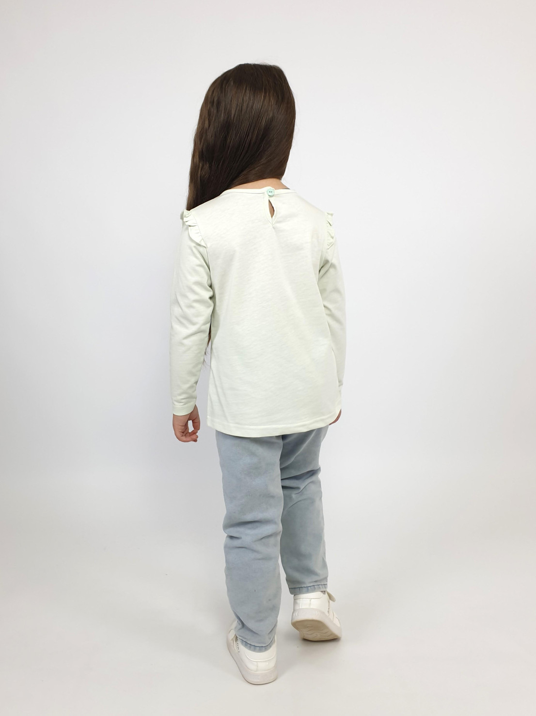 Кулирное полотно:100% х/б. Джемпер-силуэт трапеция,длинный втачной рукав,в пройме рюша.Горловина окантована,застежка на пуговицу по спинке.Печать на переде.