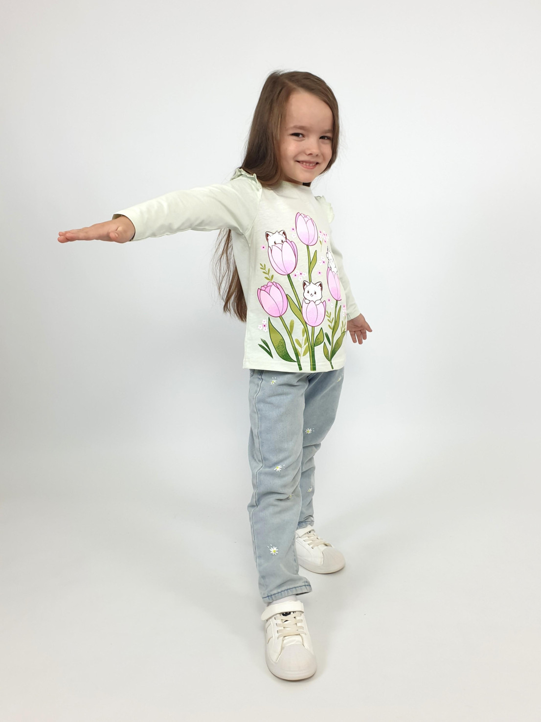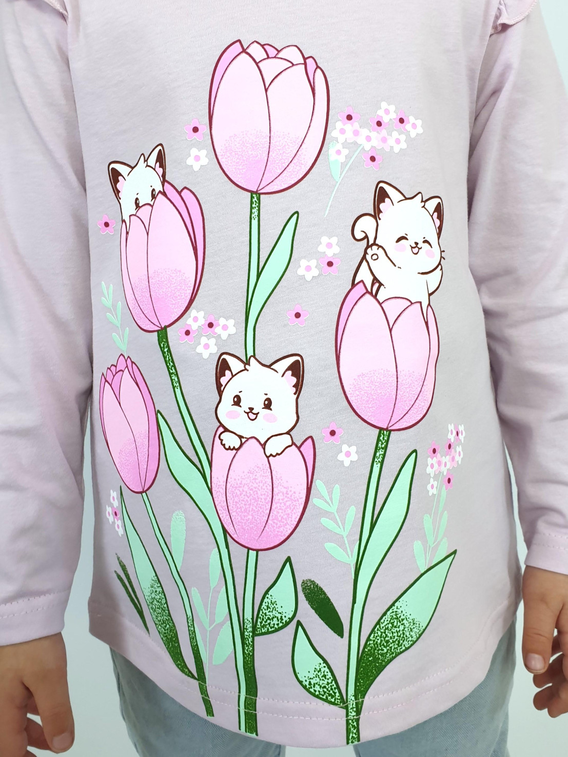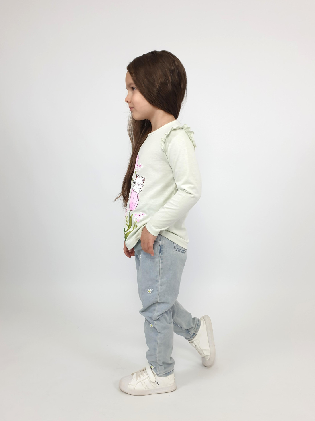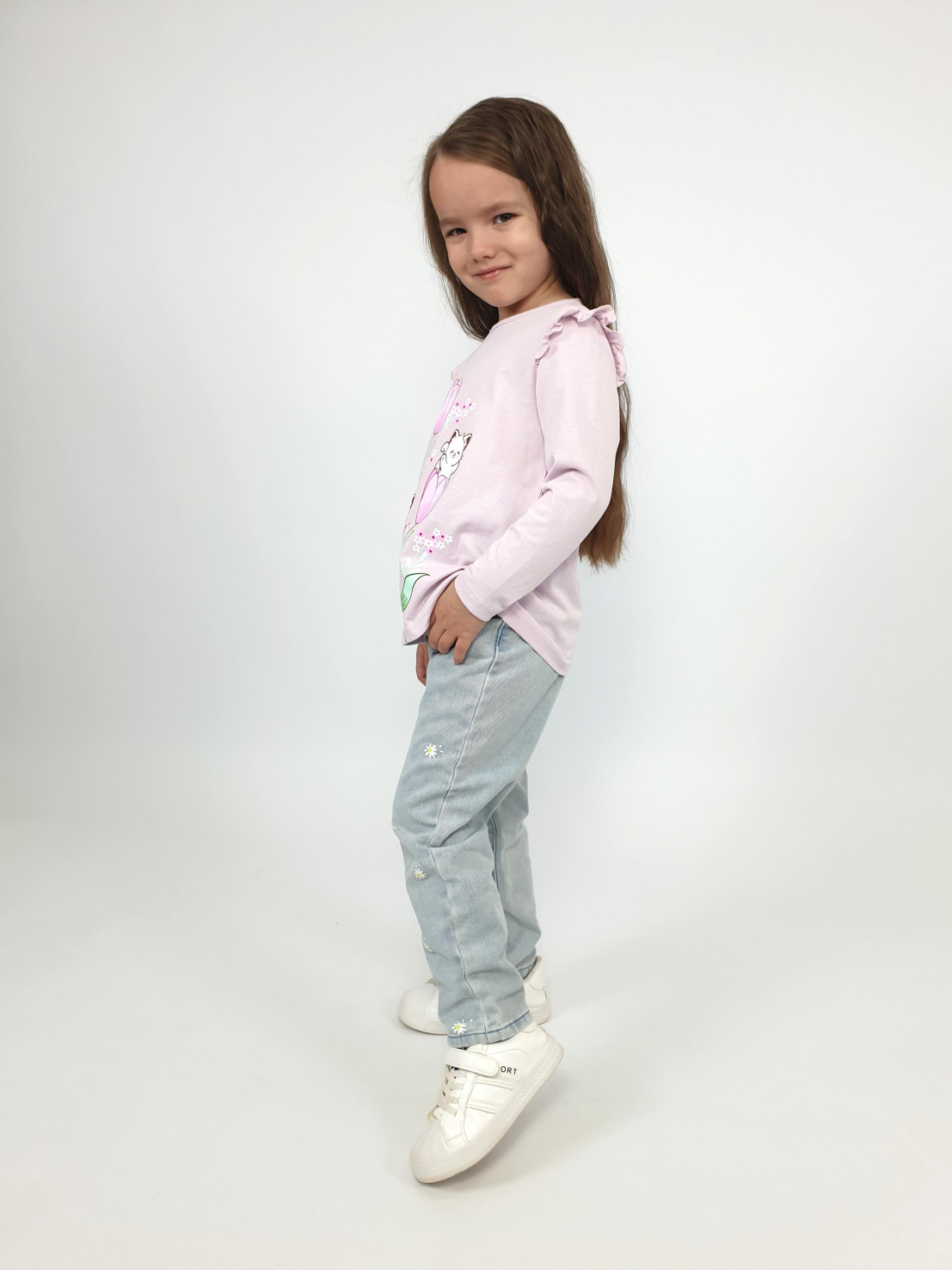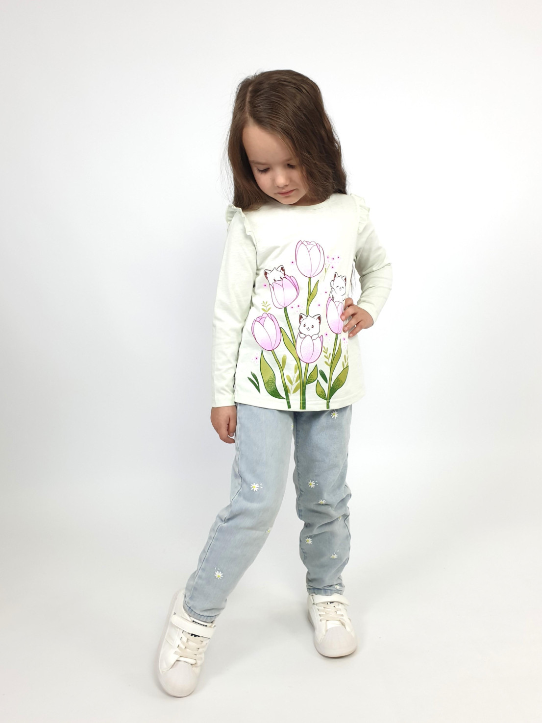 Кулирное полотно:100% х/б. Джемпер-силуэт трапеция,длинный втачной рукав,в пройме рюша.Горловина окантована,застежка на пуговицу по спинке.Печать на переде.
